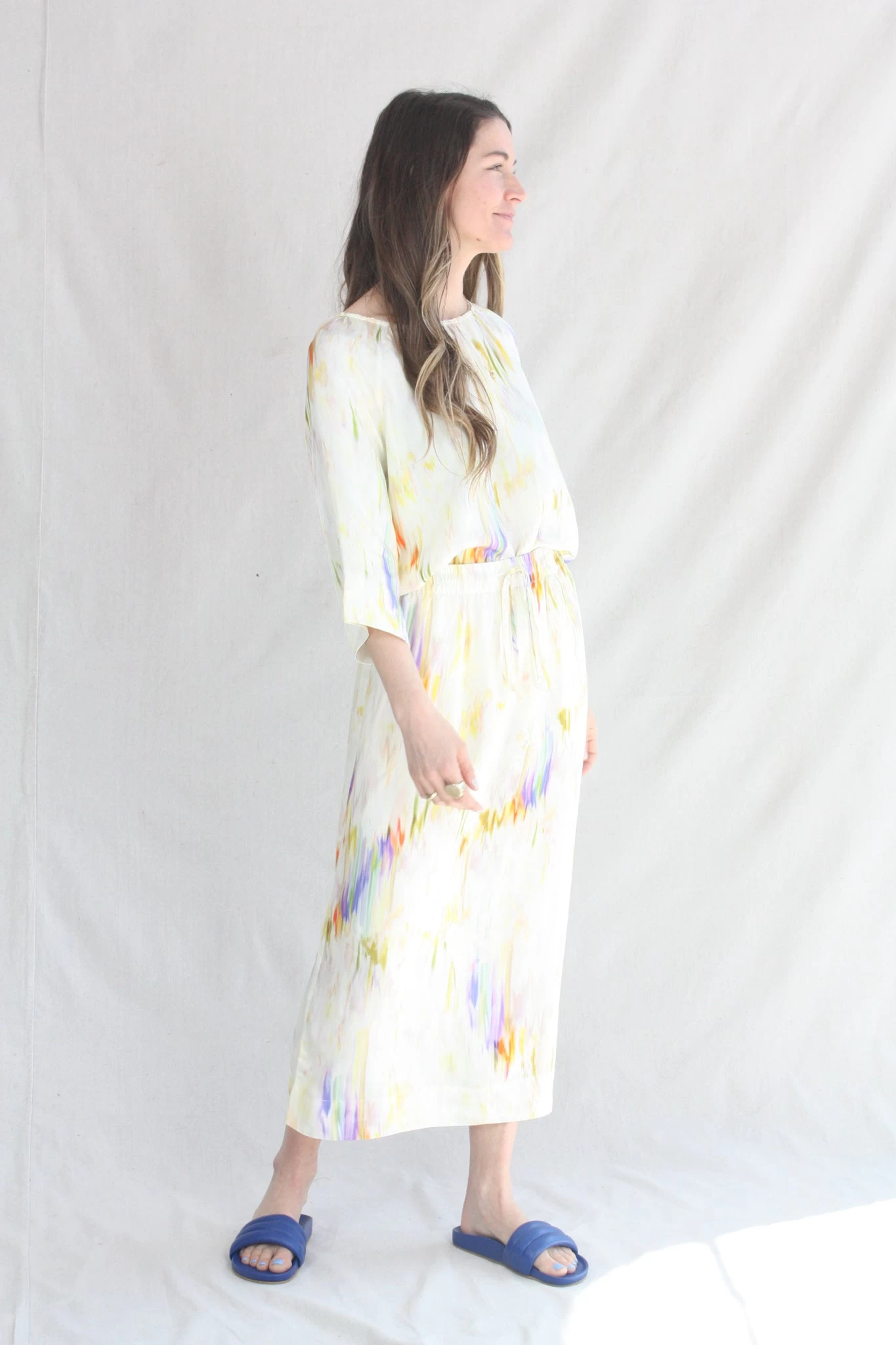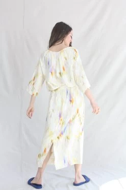 Claire Sungaze is a relaxed skirt with a flowy fit that ends below mid-calf. Claire Sungaze has a drawstring at waist and a slit at back for a sporty, yet casual look. This is a beautiful skirt is made in an allover print in multi color, made in a FSC certified (Forest Stewardship Council) viscose. This means the organizations works to protecting biodiversity, indigenous peoples’ rights, worker’s rights, and areas of significant environmental or cultural importance.