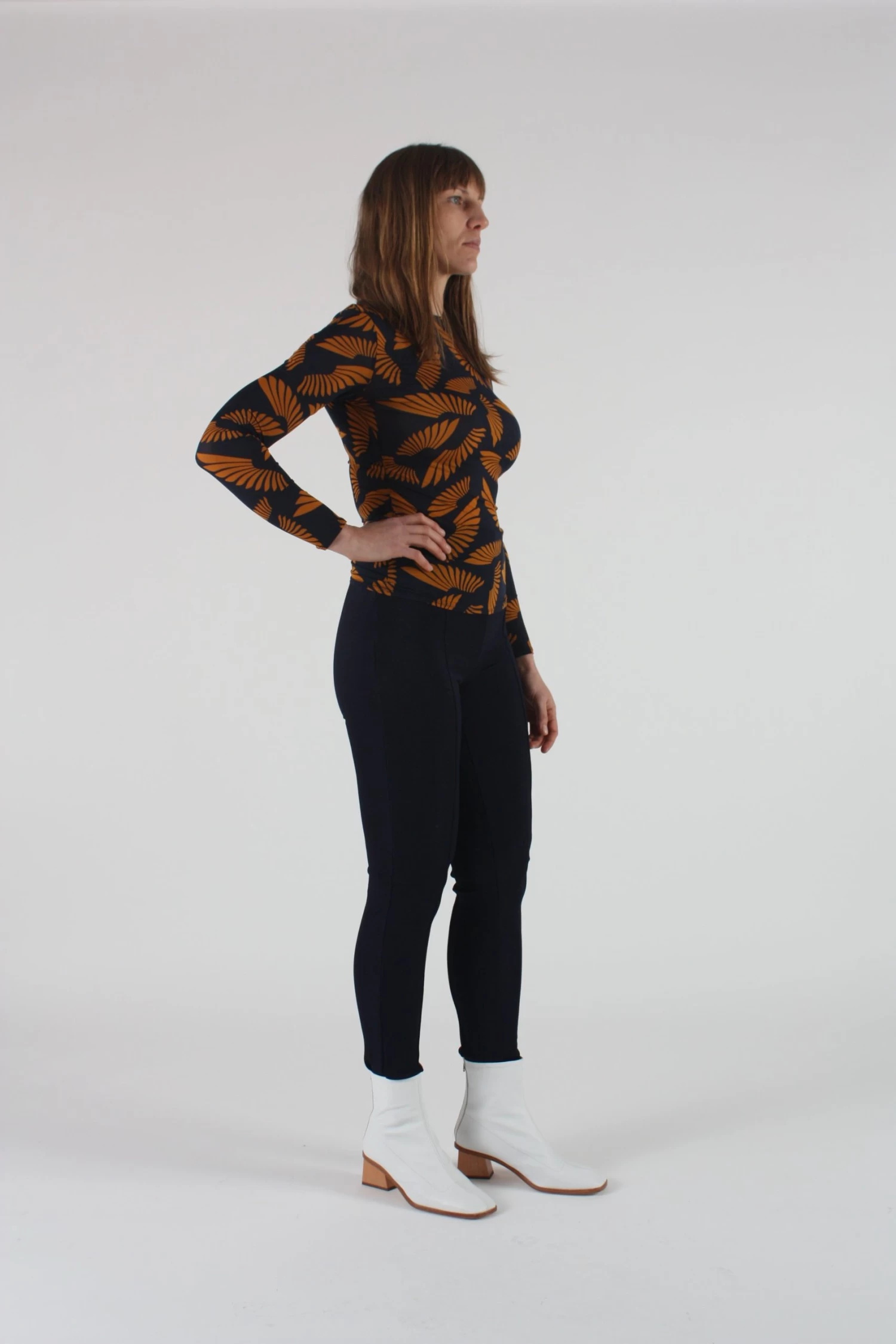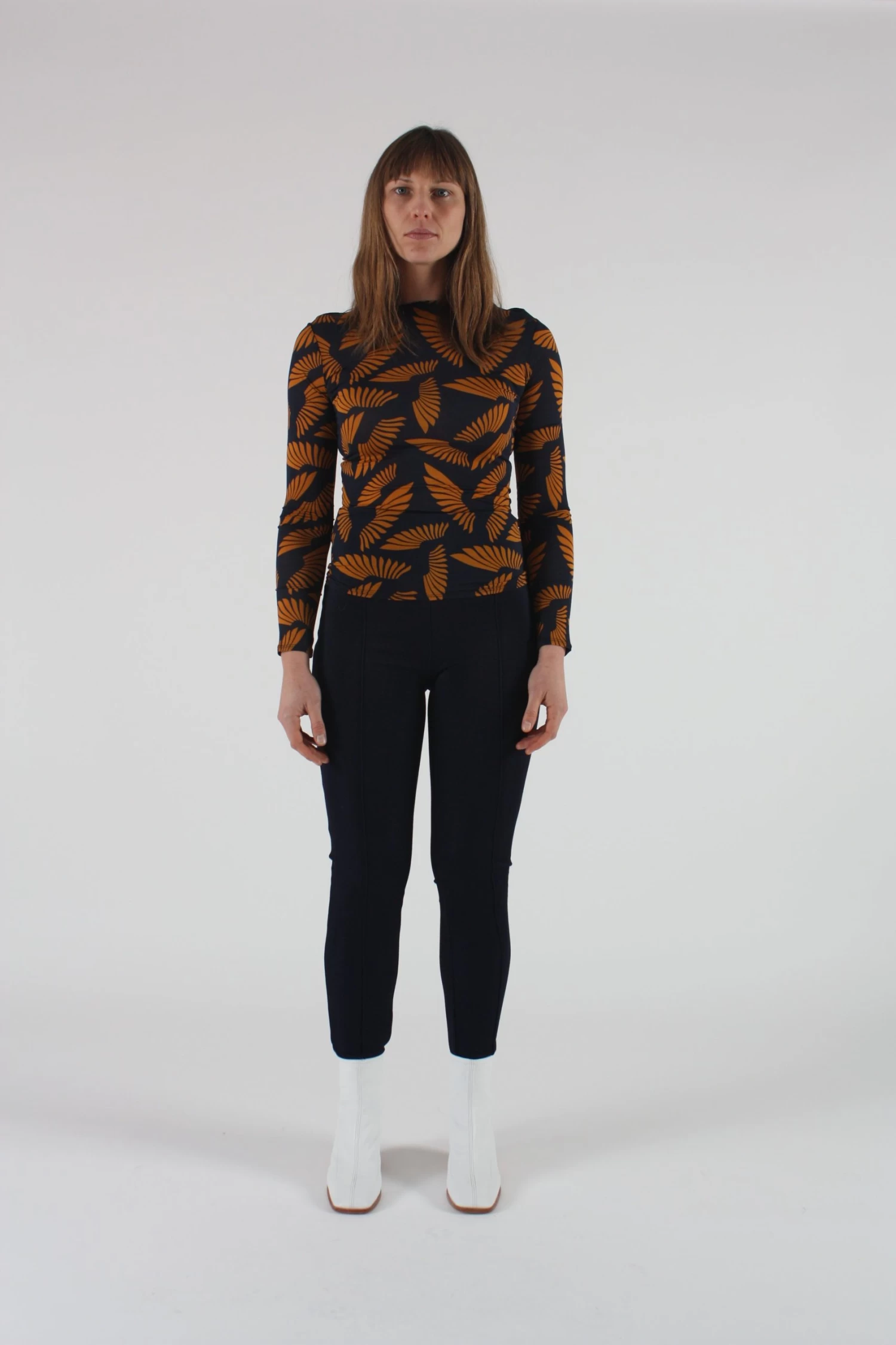 The Lenci top is the perfect layering garment in a dark navy light viscose fabric. Original print featuring crane wings. Body hugging fit.