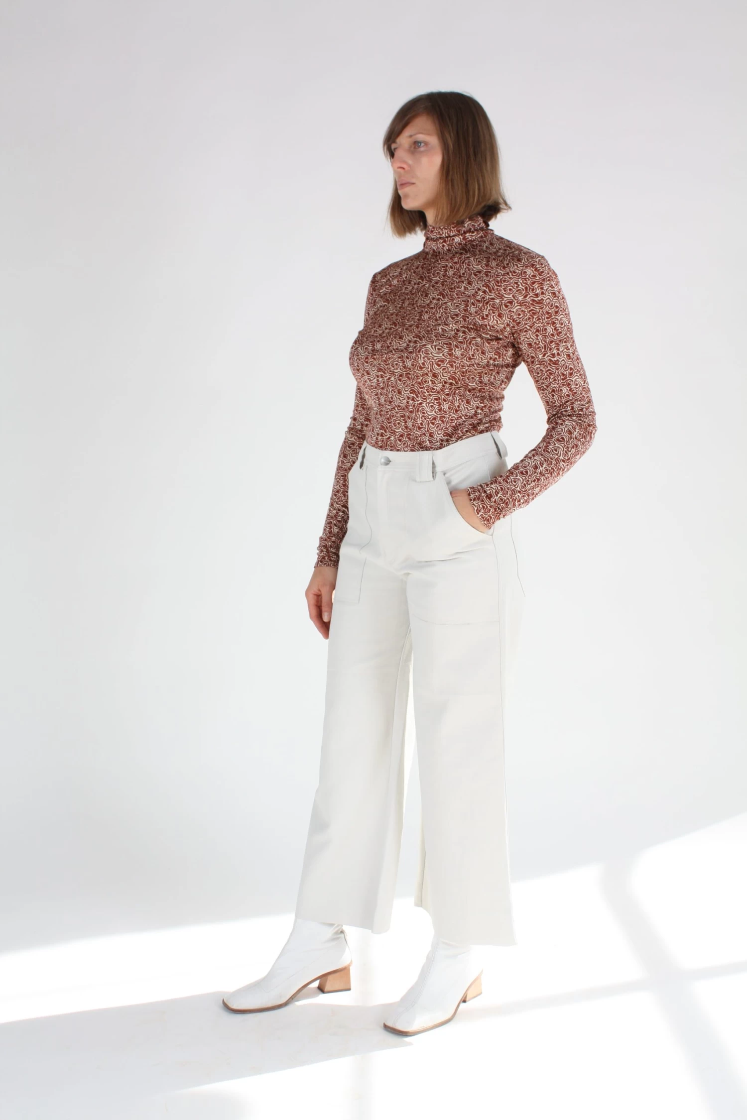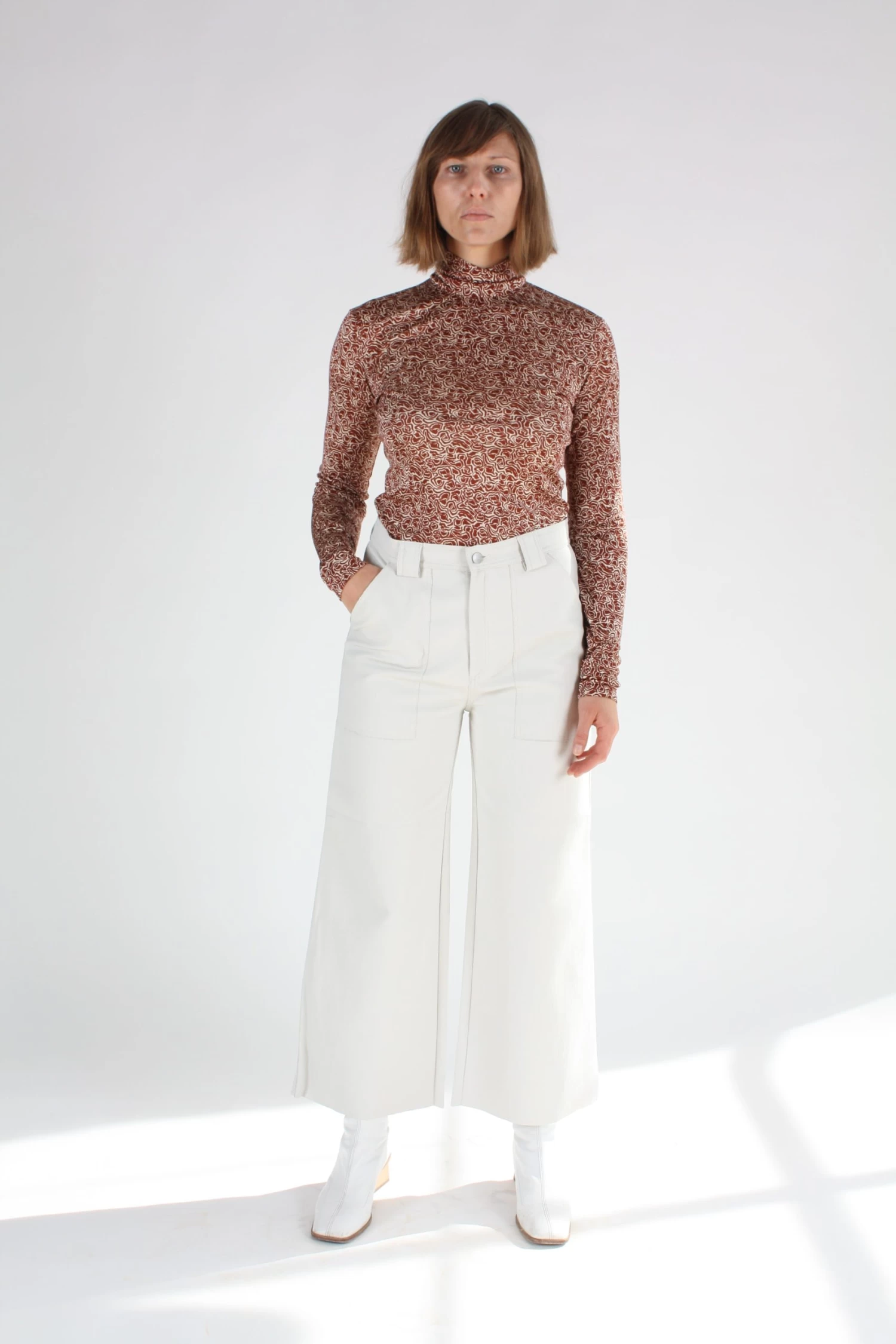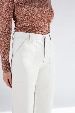 The Mirari pant is an exclusive Italian linen fabric with PU coating on the frontside. Relaxed waist with a wide leg and an ankle length, raw edge details and oversized front pockets. The leg can easily be cut and adjusted for a perfect fit. Dry clean only.