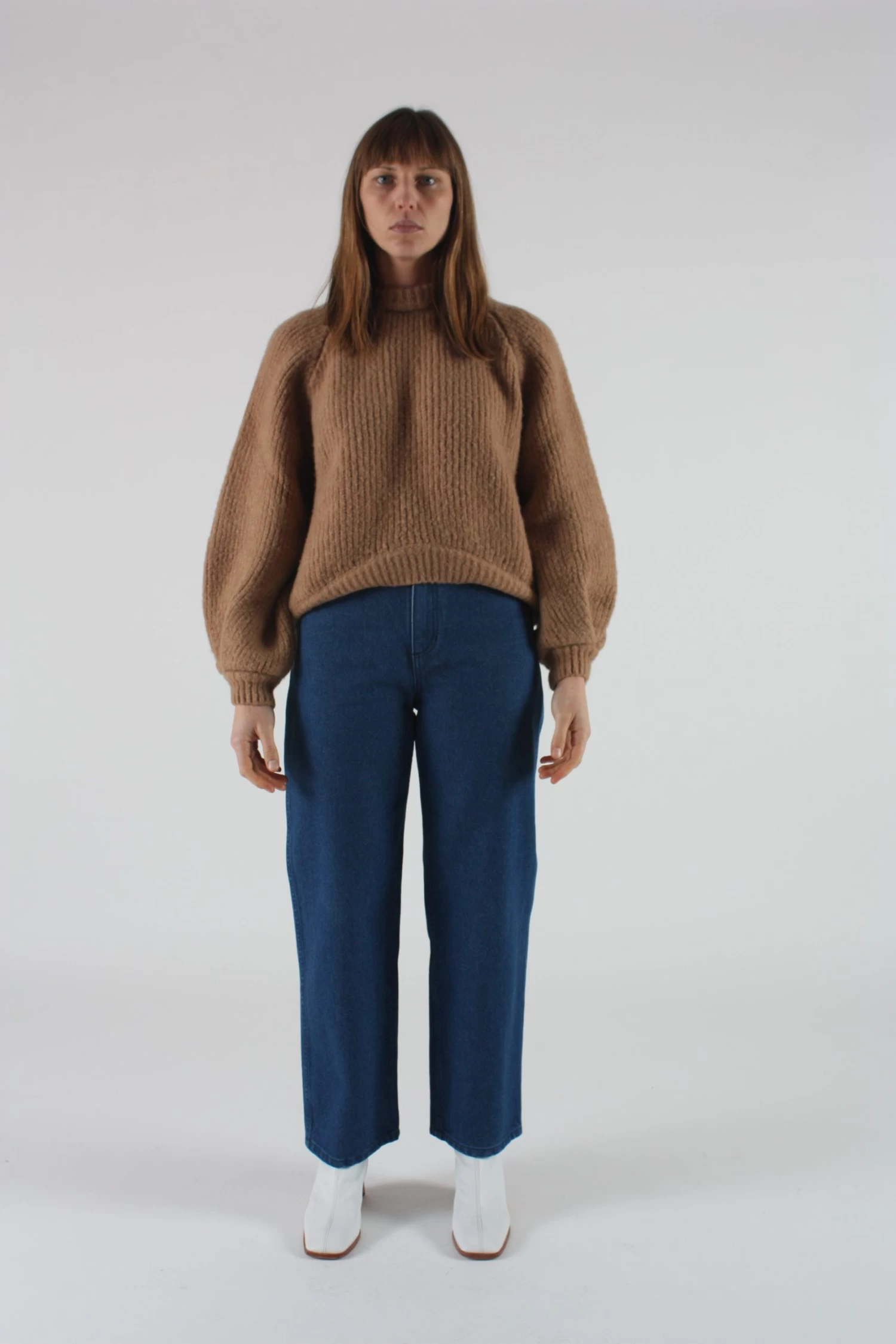 The Onella sweater in a classic camel color is the perfect everyday knit. Soft and fluffy feel with exclusive brushed merino wool. The sweater is shorter in front for a clean look that goes well over dresses and with pants. Oversized Fit.