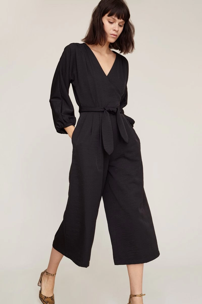 Classic cupro jumpsuit for anywhere, anytime. Gathered at shoulder with long sleeve. Cut in a textured cupro with v-neckline, cropped wide pant legs and adjustable waist tie.