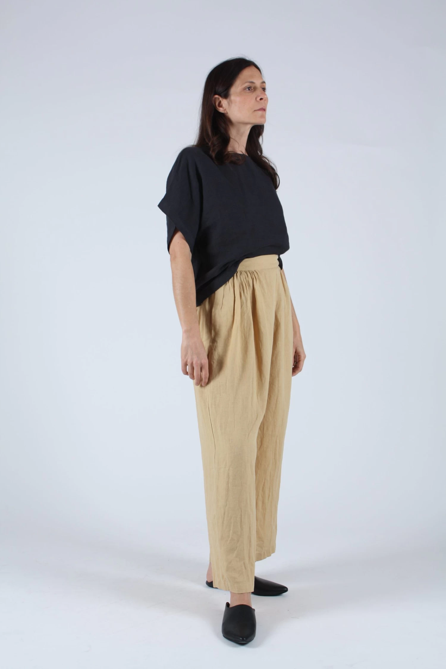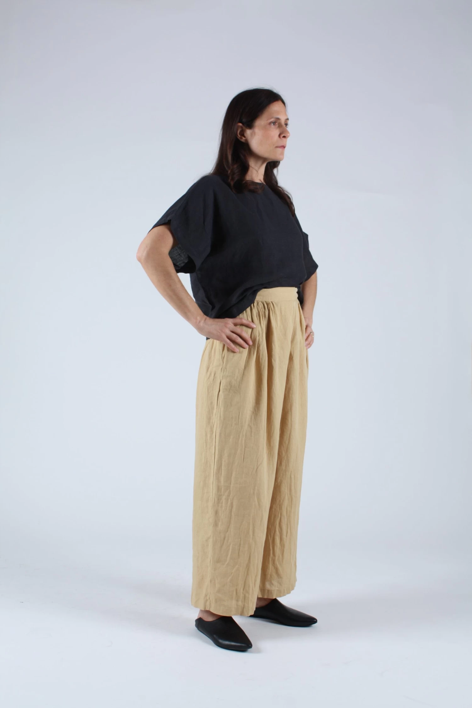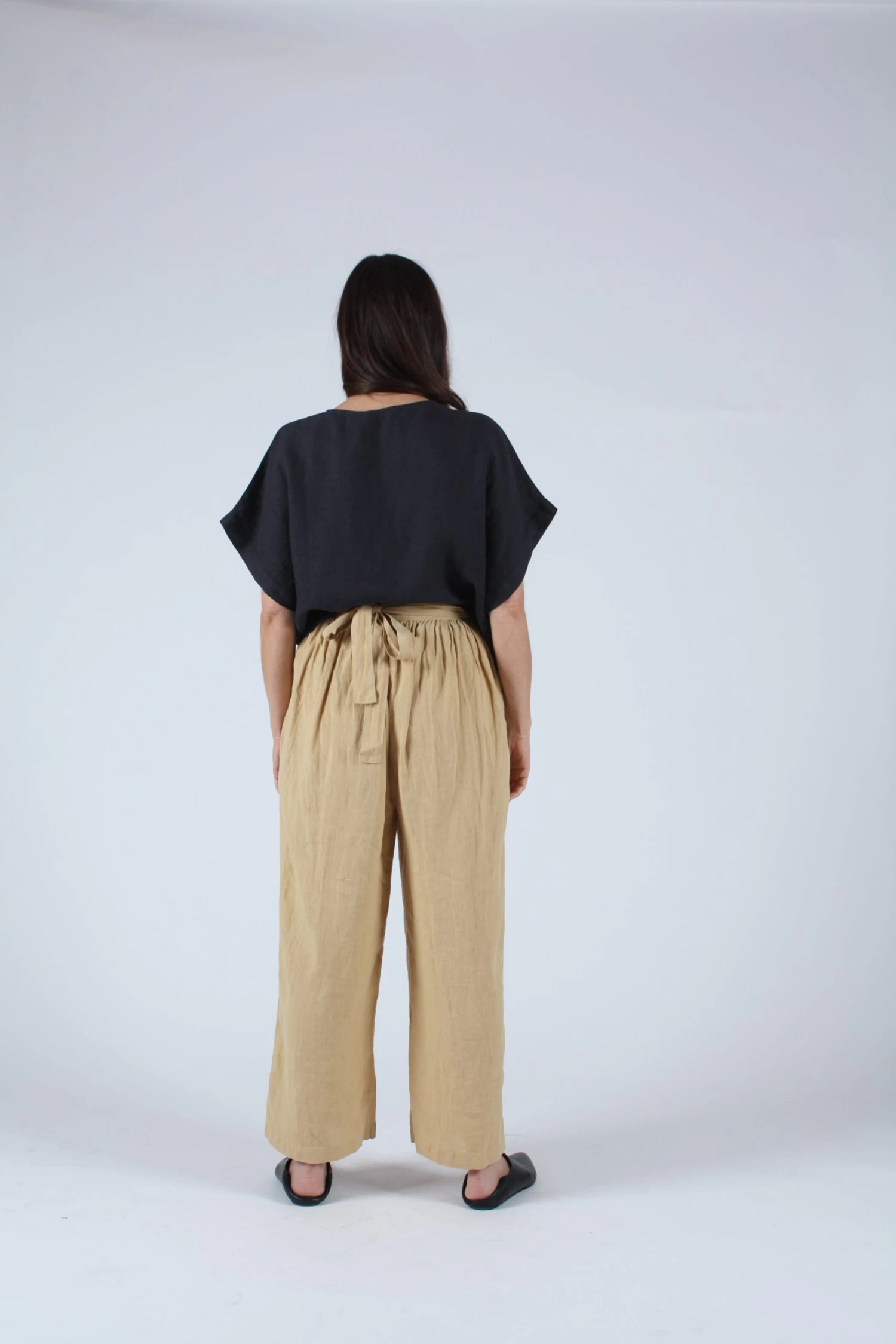 AÂ relaxed wide leg wrap pant with front pleats. Side seam pockets.
