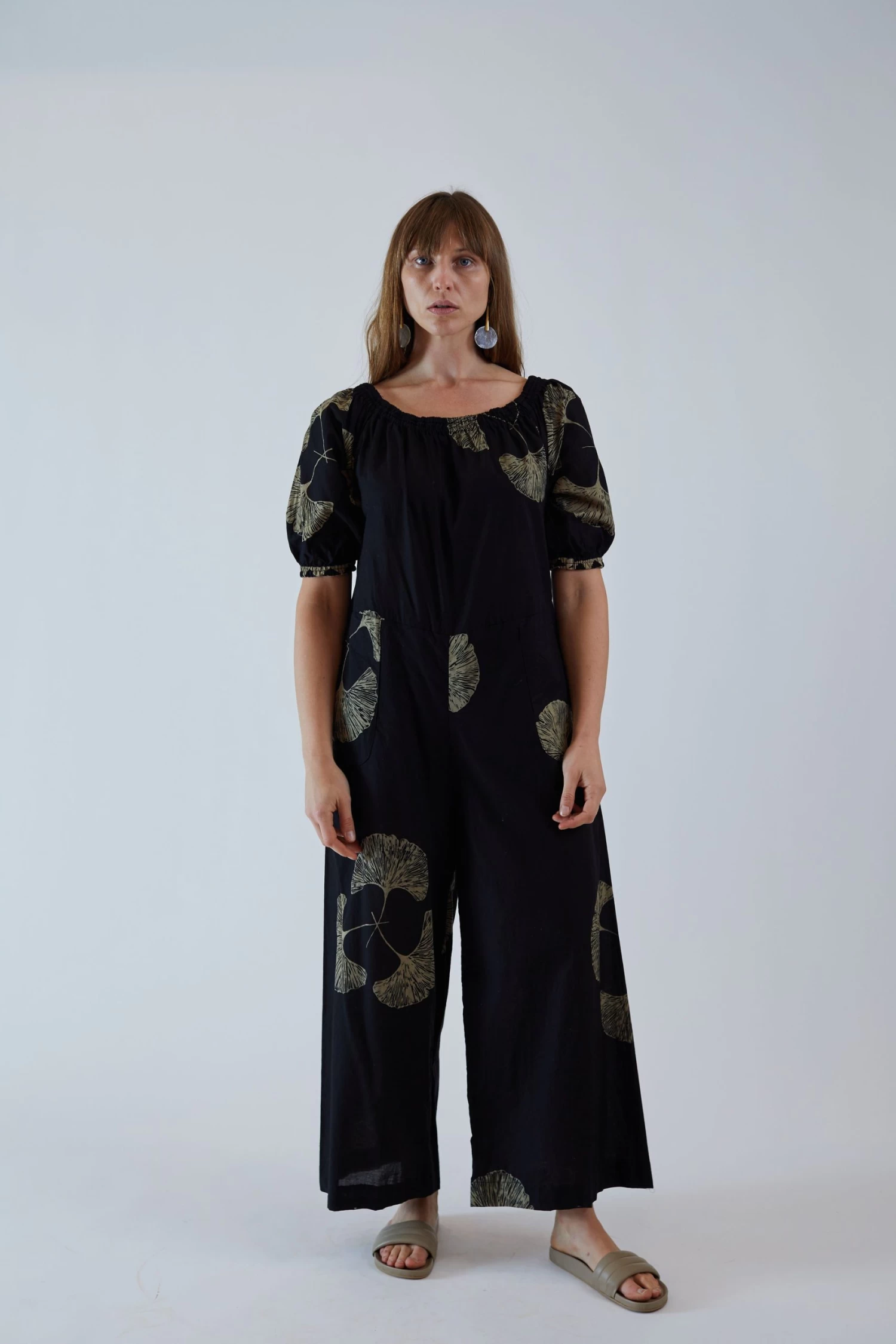 Loose fitting cotton jumpsuit with a wide leg and pockets. Adjustable elastic neck to be worn on or off the shoulder. Jumpsuit hits at or just above ankles.