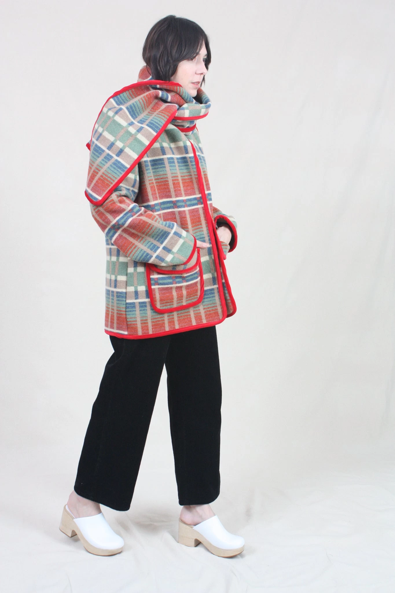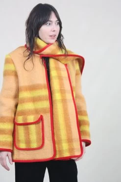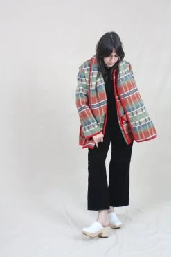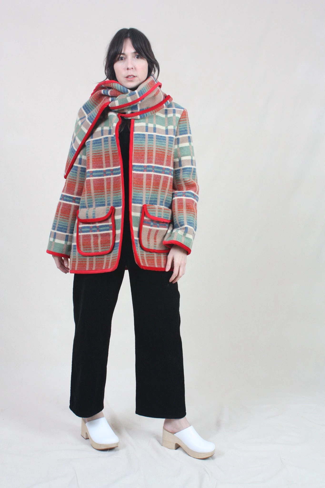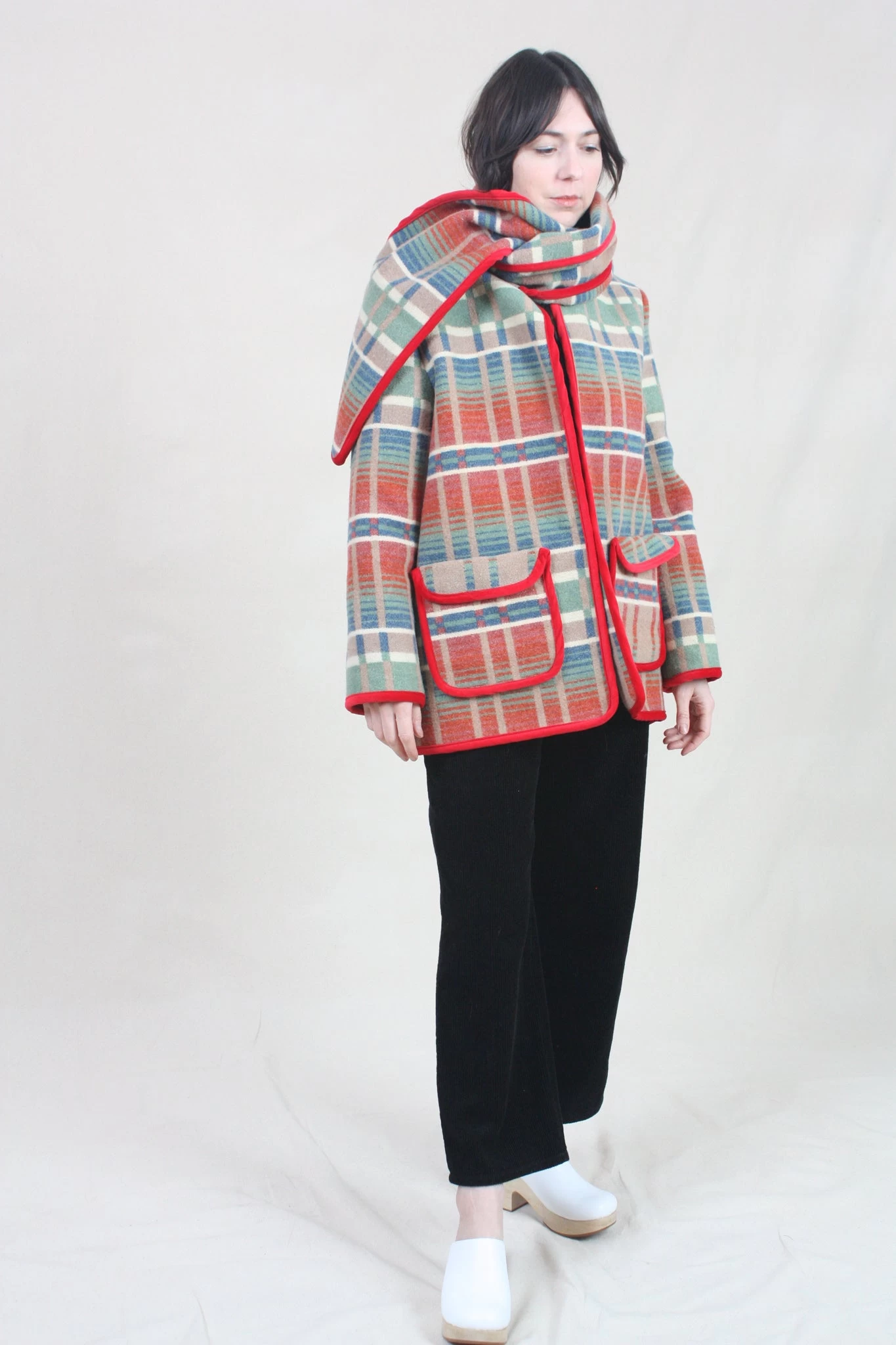 The Scarf Jacket is constructed from deadstock wool to create a completely one-of-a-kind jacket that is delightfully cozy. Features two patch pockets and a built-in scarf collar. This jacket is one of a kind and Carleen hand picks textiles that may include wear, distress, marks, and other signs of age intentionally adding character to the finished garment.