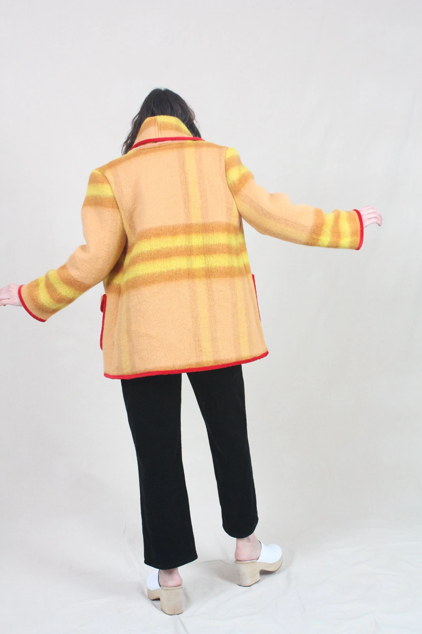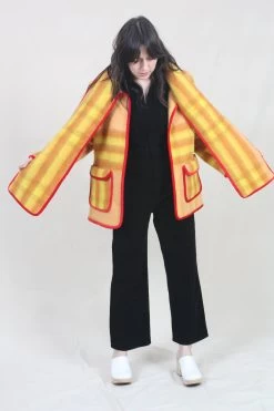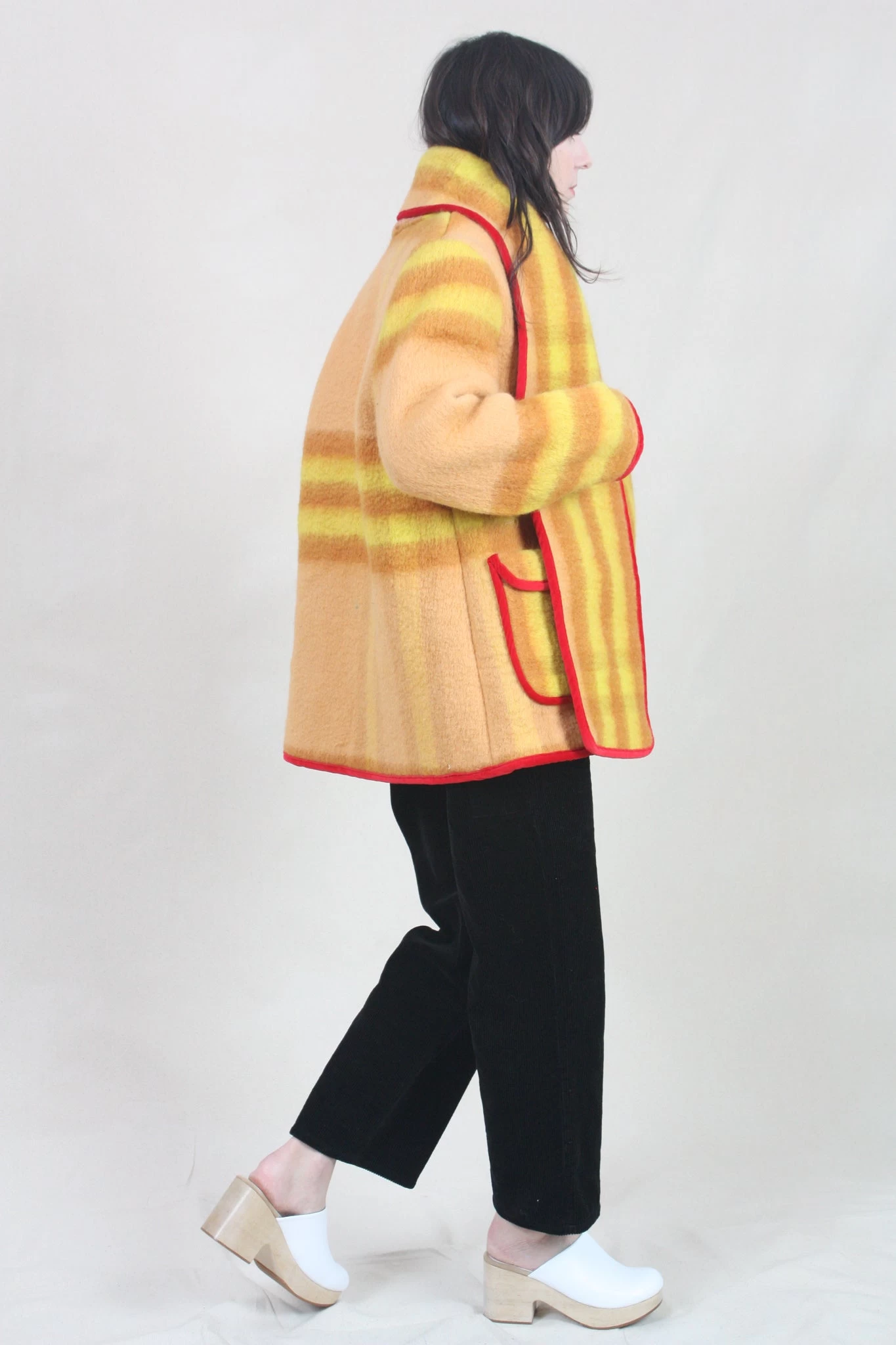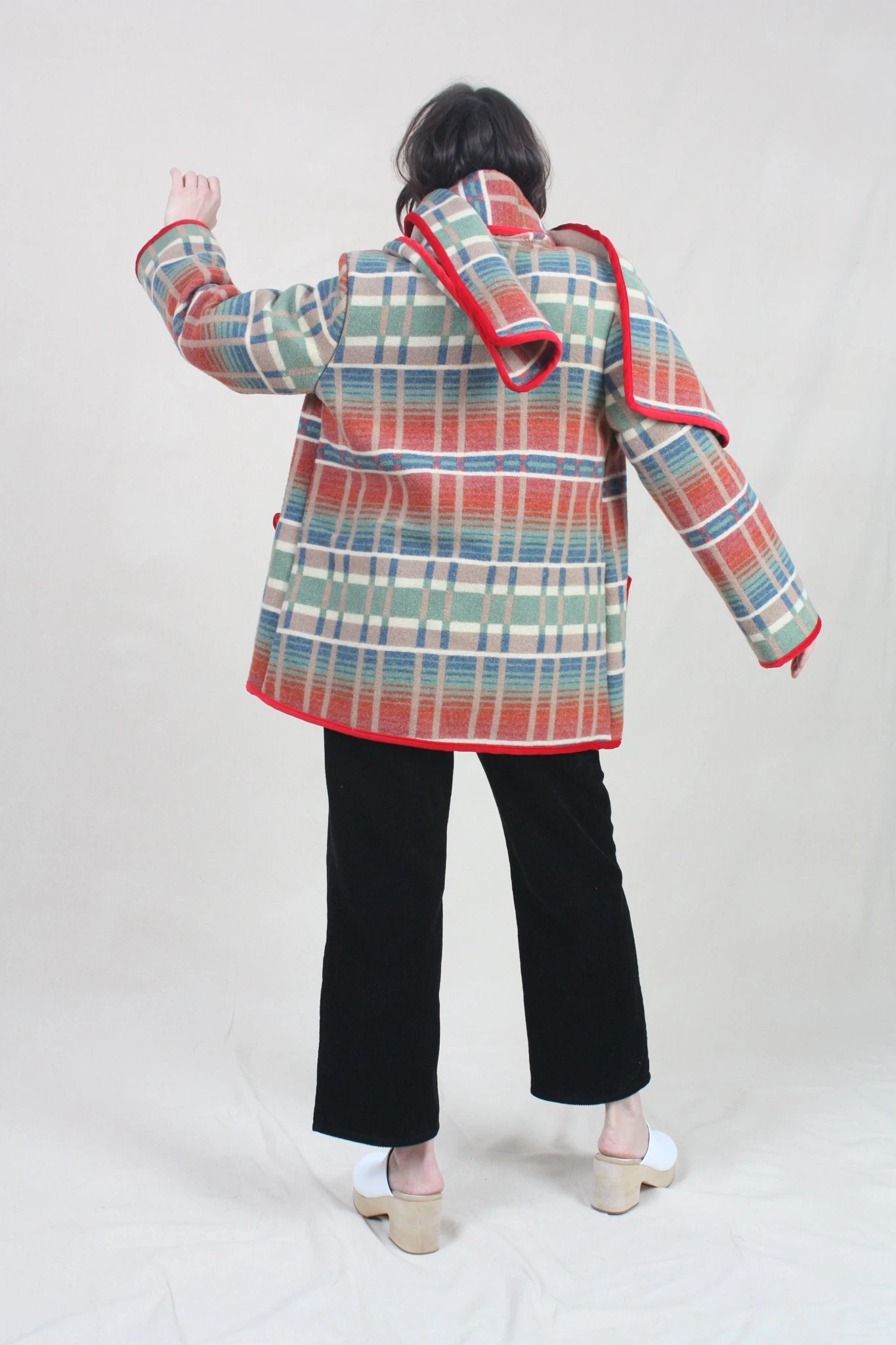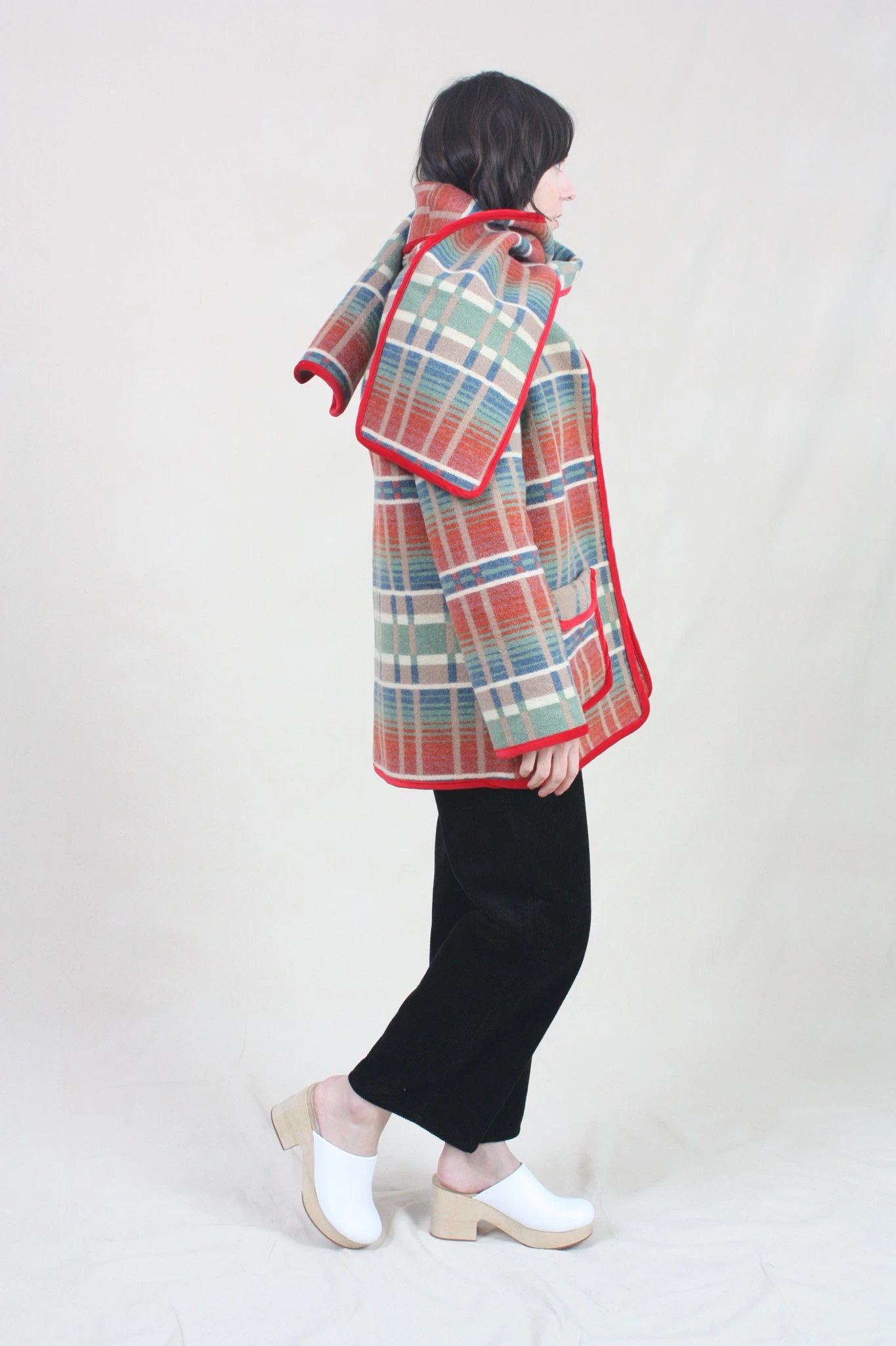 The Scarf Jacket is constructed from deadstock wool to create a completely one-of-a-kind jacket that is delightfully cozy. Features two patch pockets and a built-in scarf collar. This jacket is one of a kind and Carleen hand picks textiles that may include wear, distress, marks, and other signs of age intentionally adding character to the finished garment.