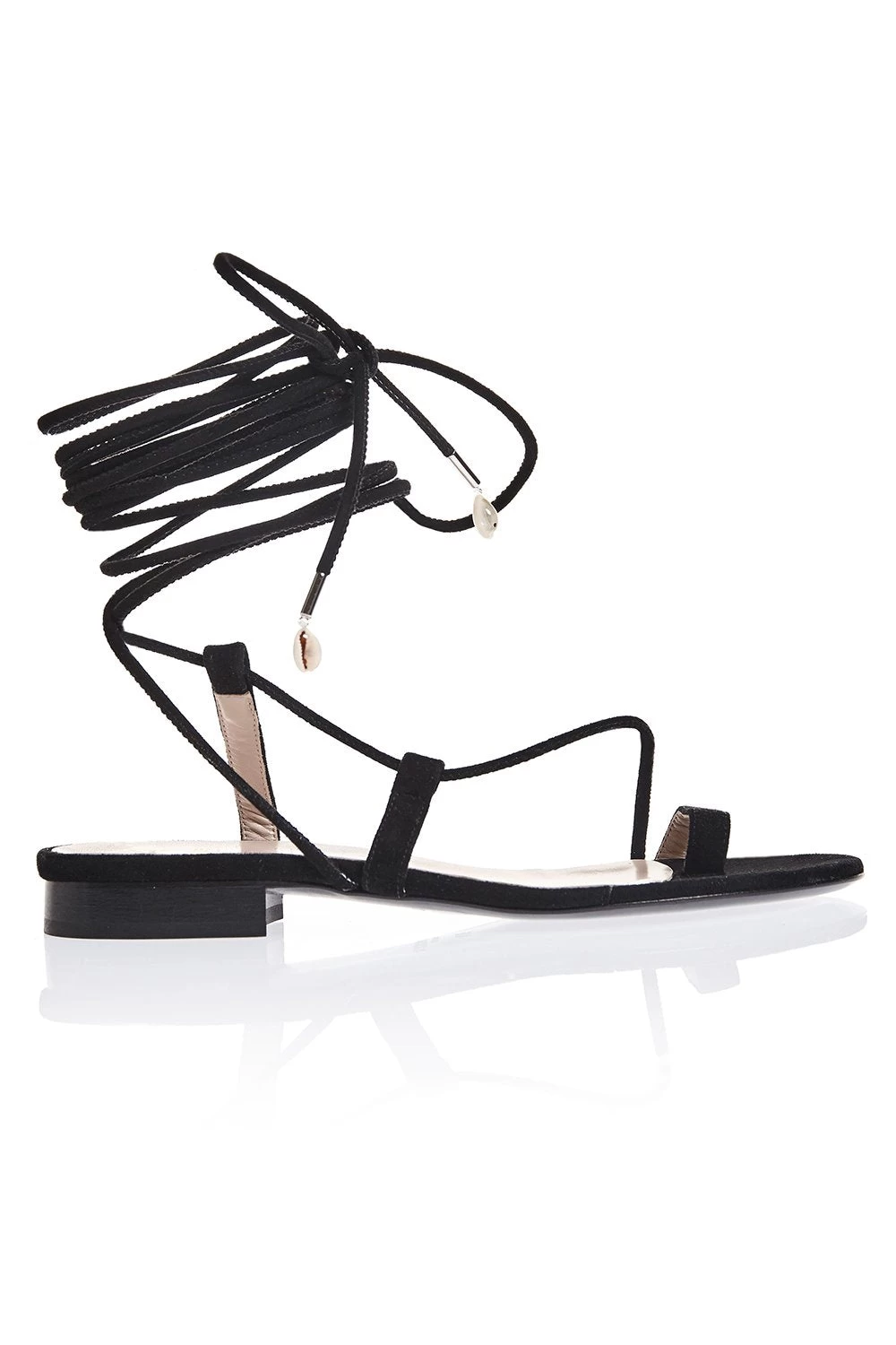 An easy ankle wrap sandal. Seashells dangle from ankle straps. Both feet have different tie closures.Â
