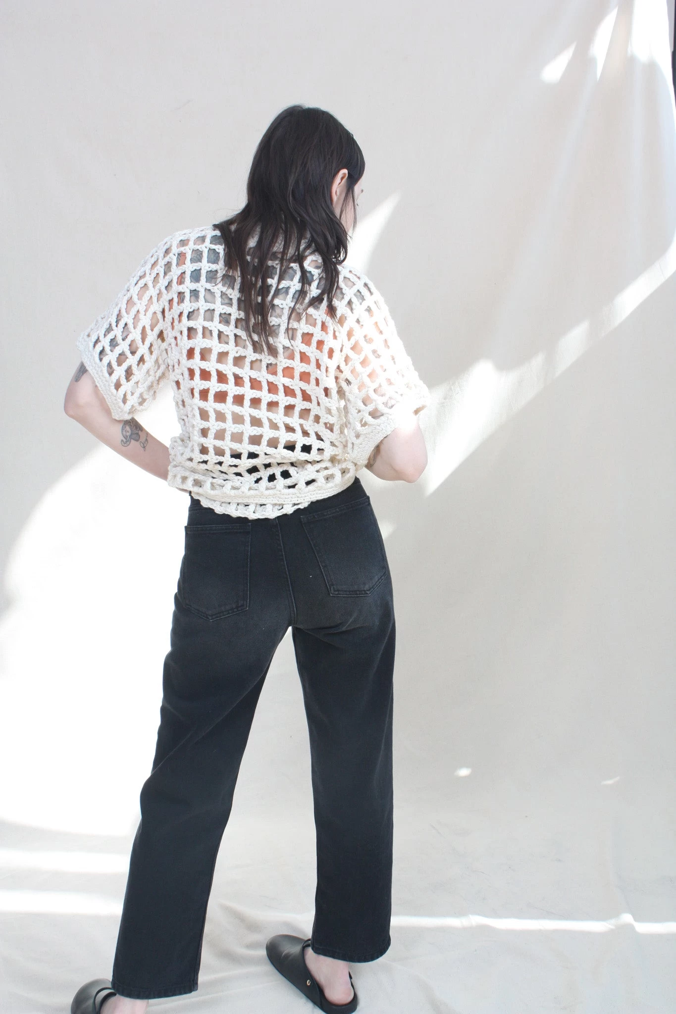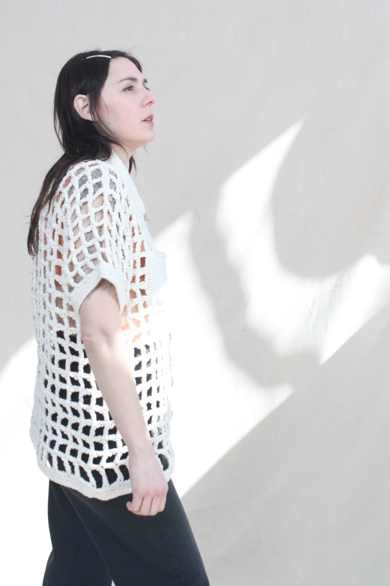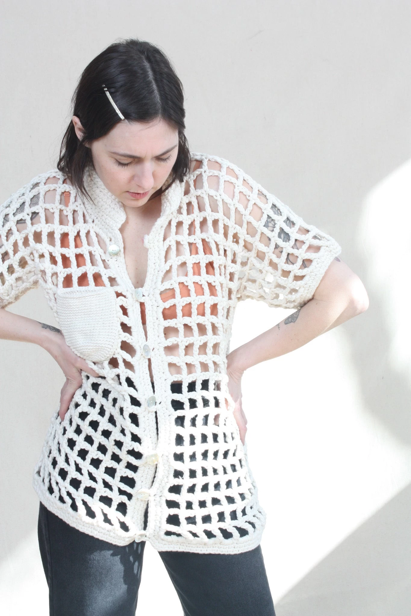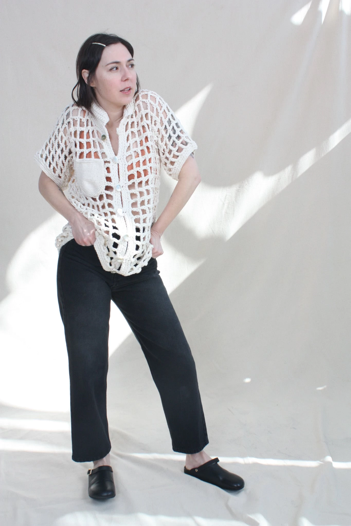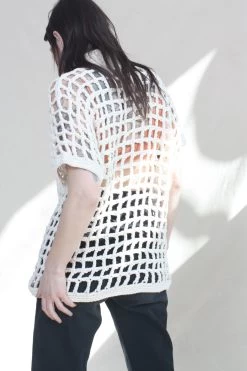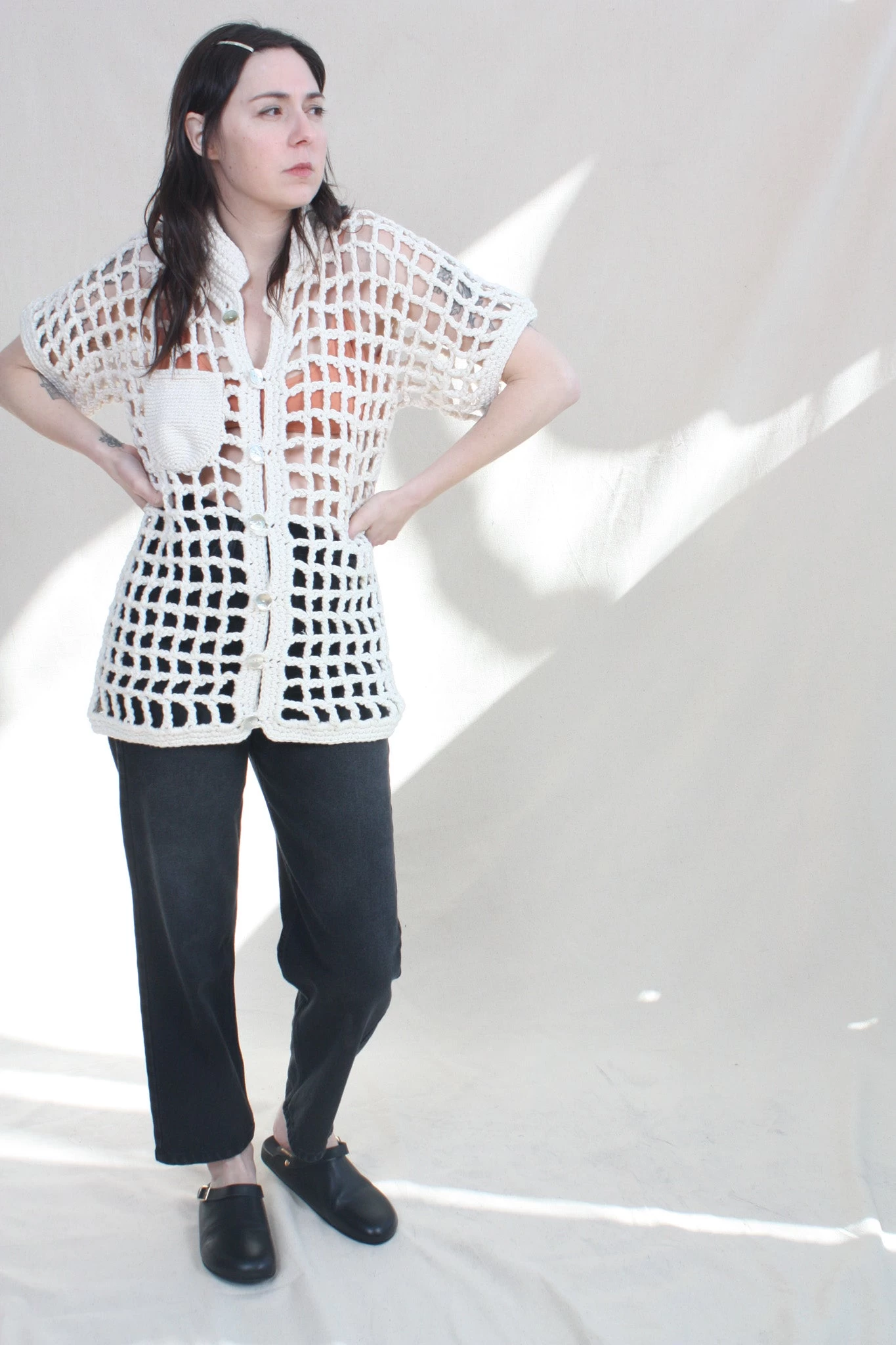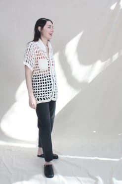 Named after the Brazilian bossa-nova singer Sessa, this unisex button up hand crocheted shirt features a fully functioning patch pocket with mother of Pearl shell buttons. Â