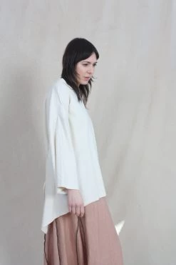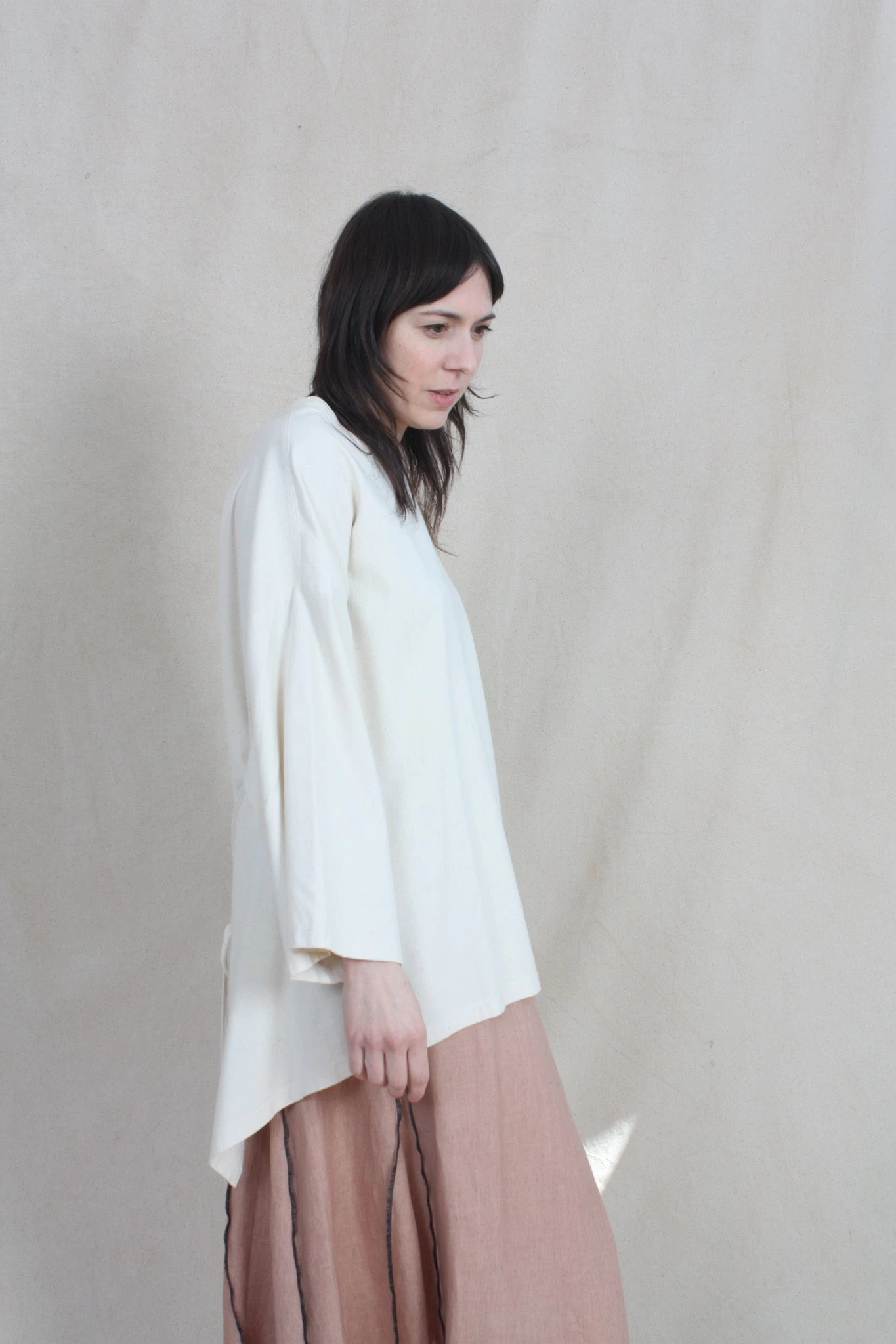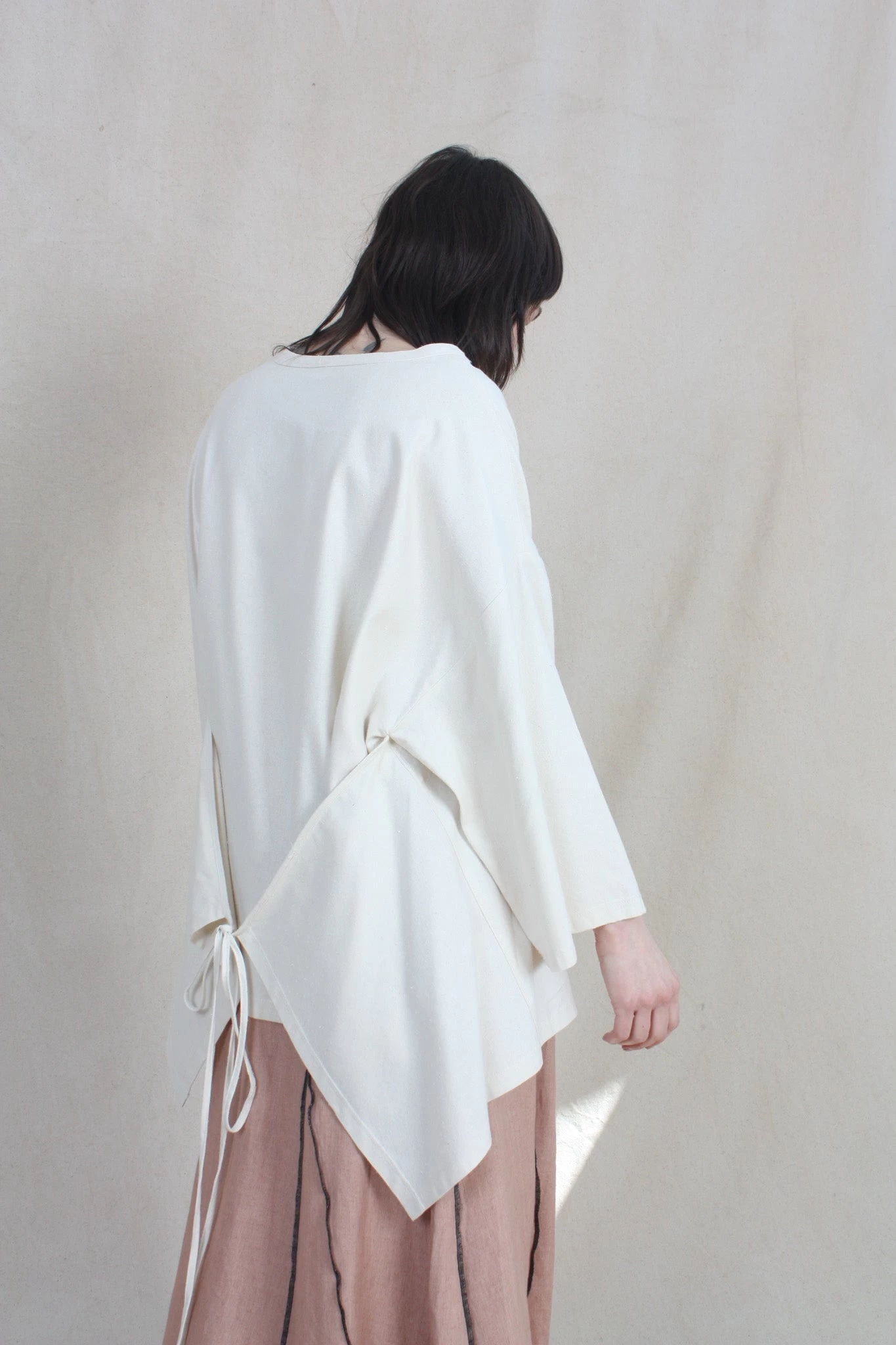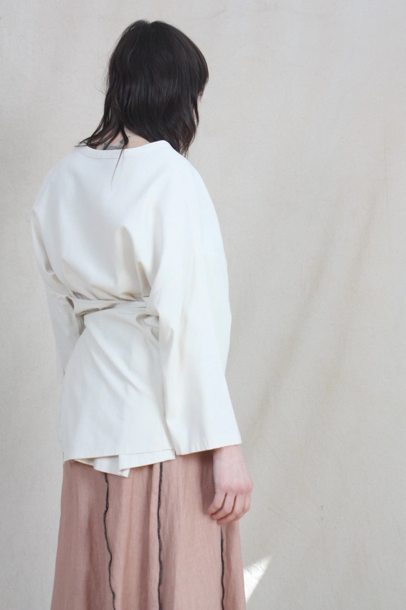 Crewneck 3/4 sleeve wrap top with dropped shoulder. Undyed silk. Worn multiple ways. Oversized fit, consider sizing down.