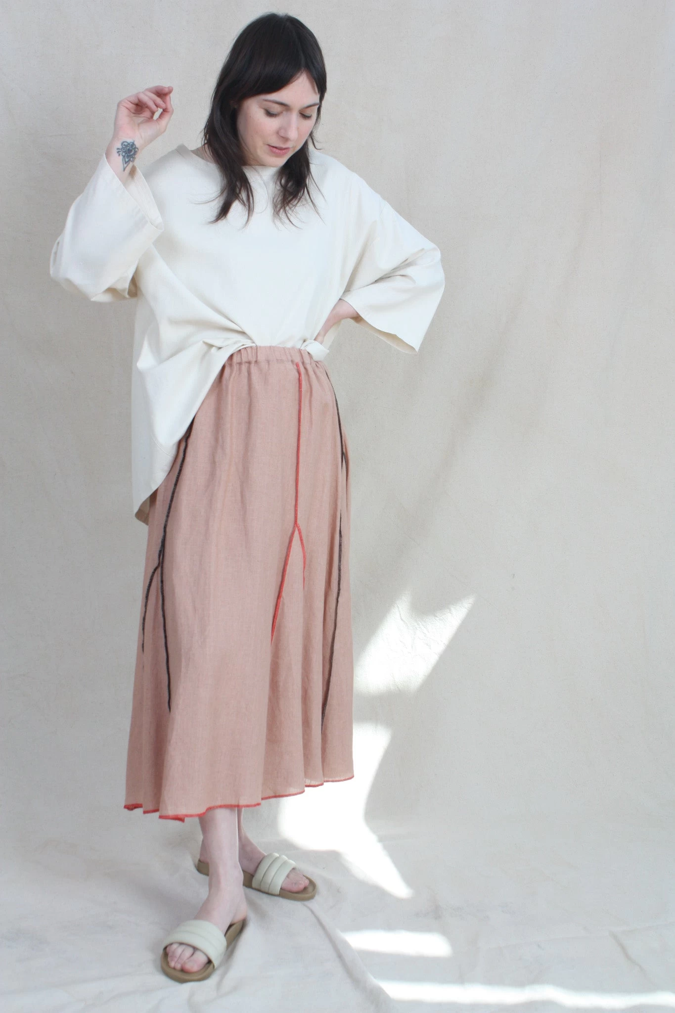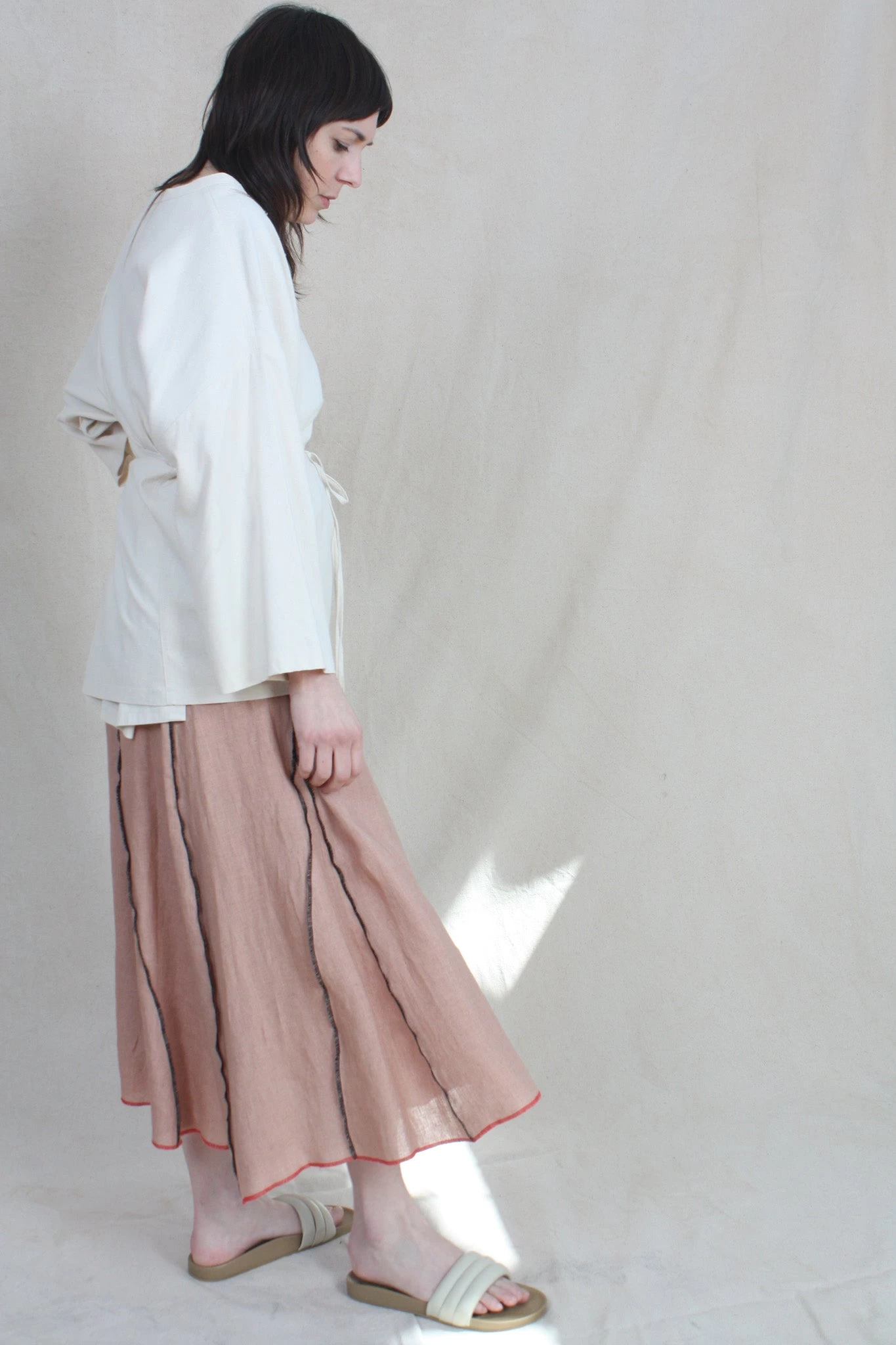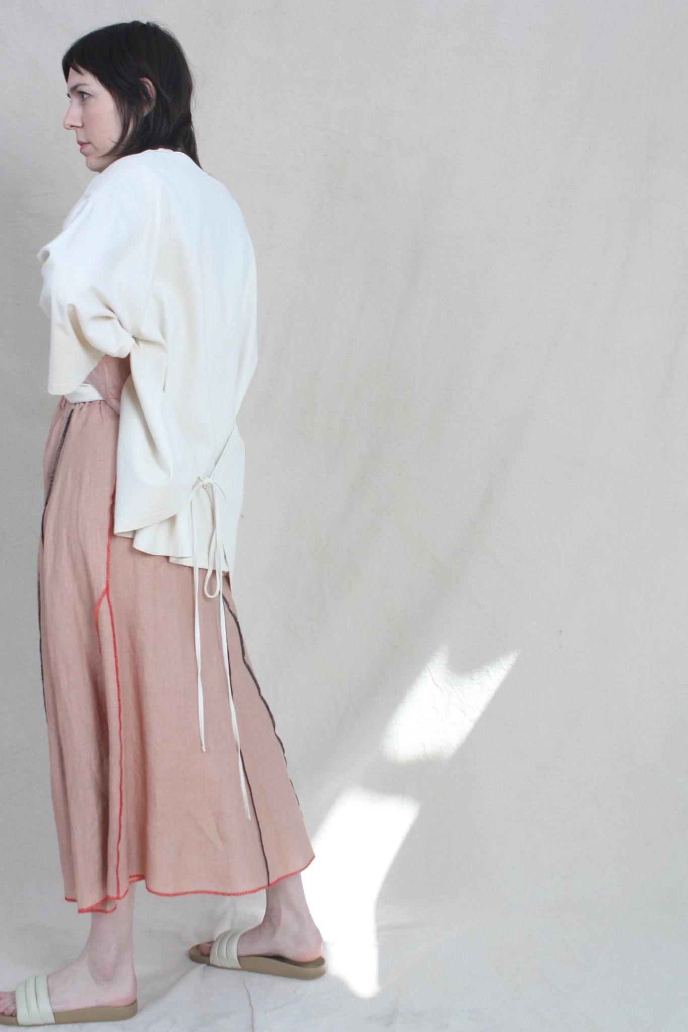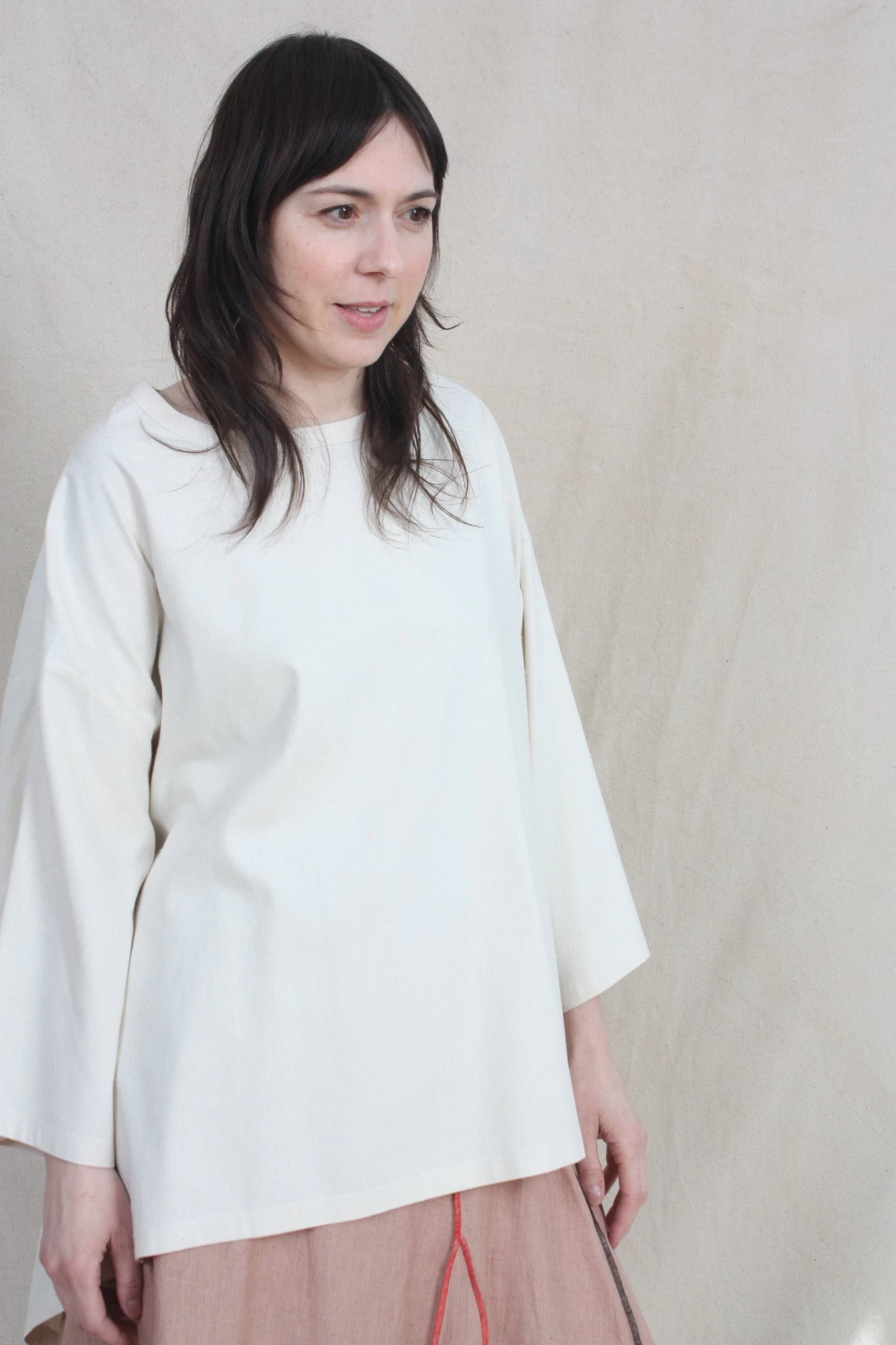 Crewneck 3/4 sleeve wrap top with dropped shoulder. Undyed silk. Worn multiple ways. Oversized fit, consider sizing down.