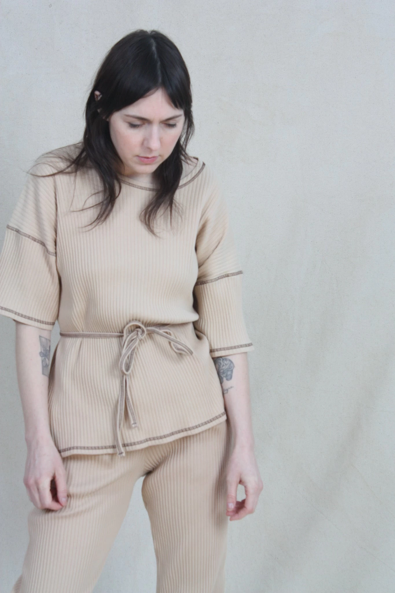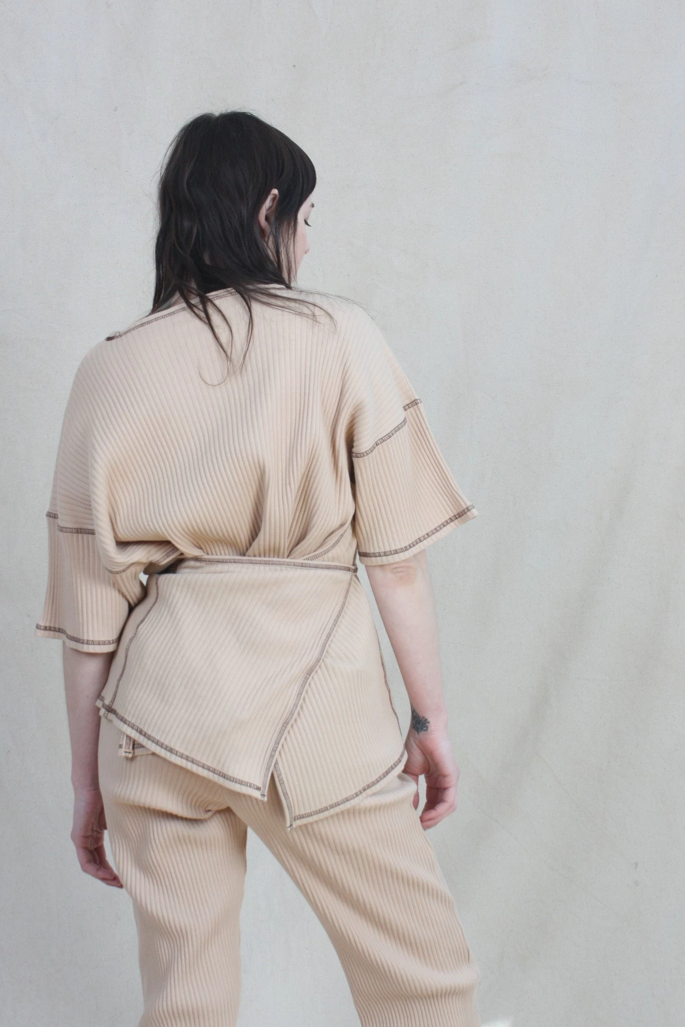 Ribbed cotton fleece rib short sleeve wrap top. Contrast stitching. Crewneck. Drop shoulder. Worn multiple ways. Oversized fit, consider sizing down.