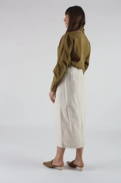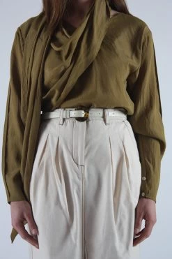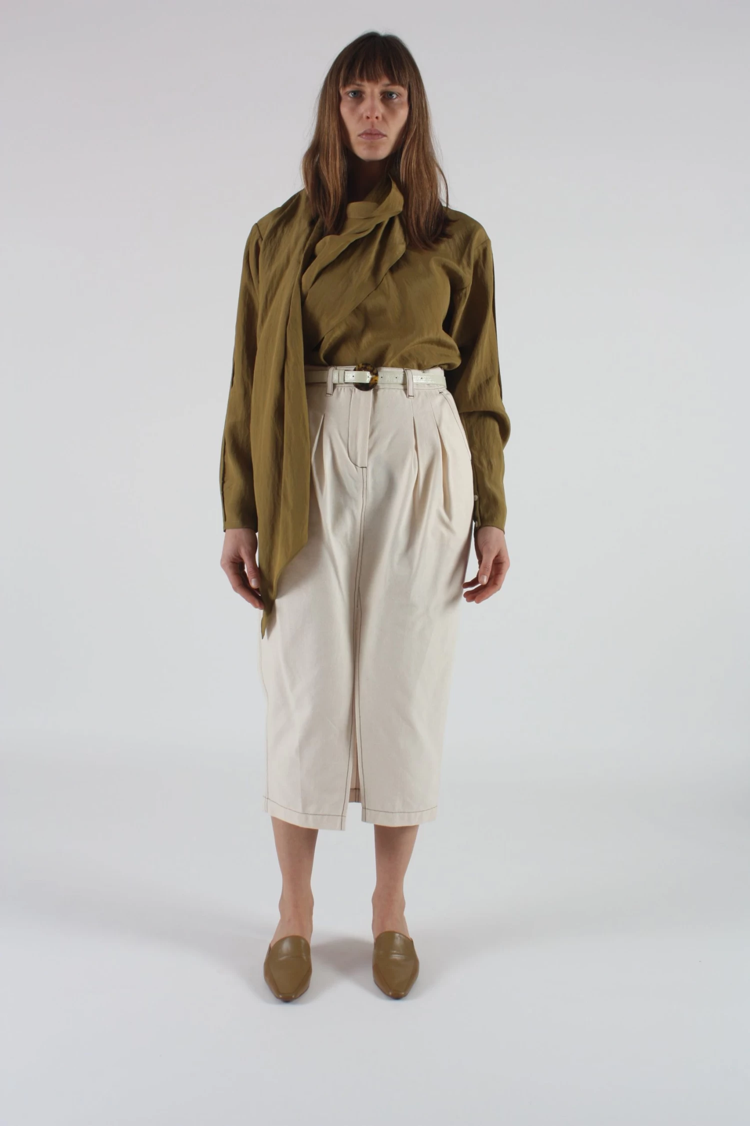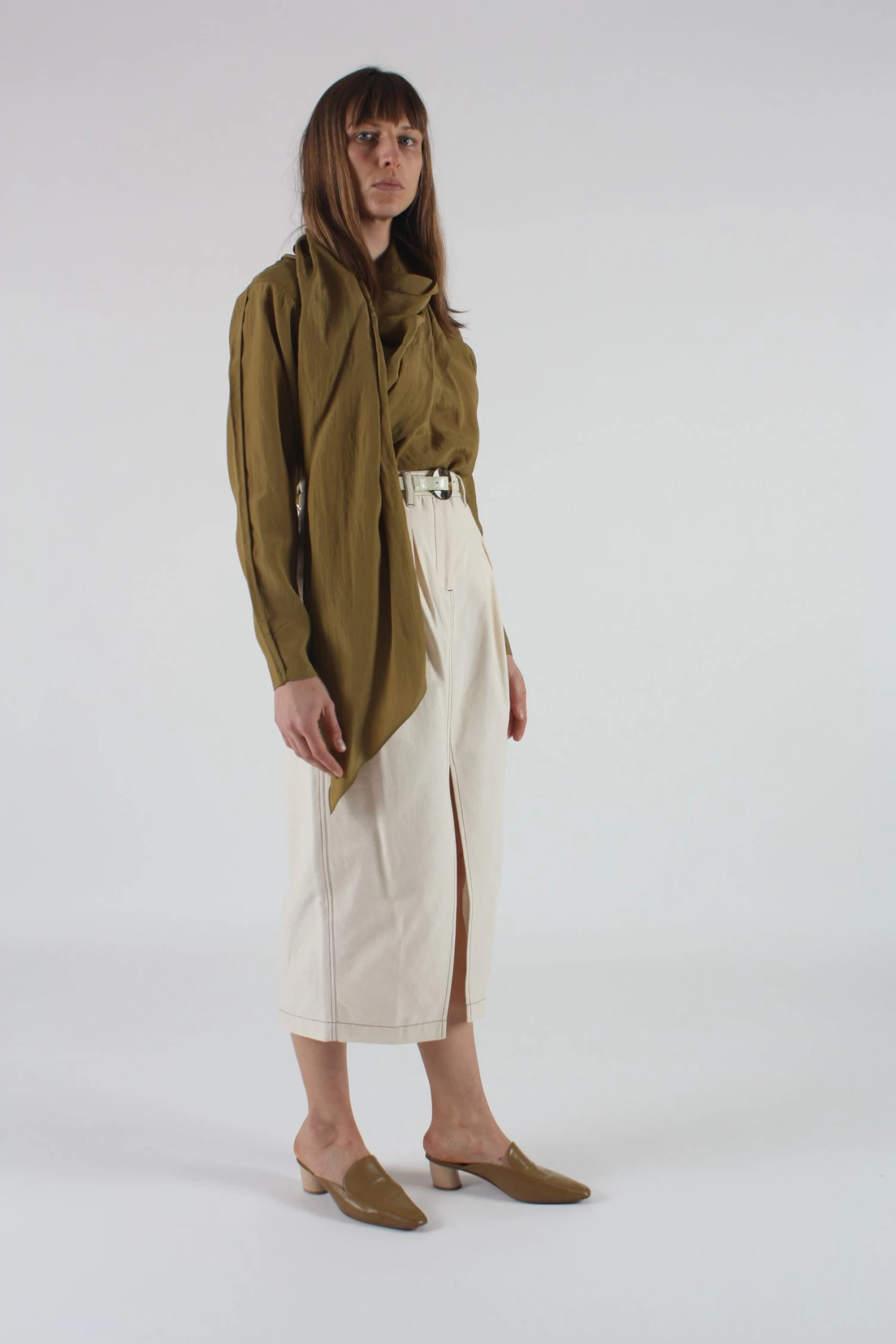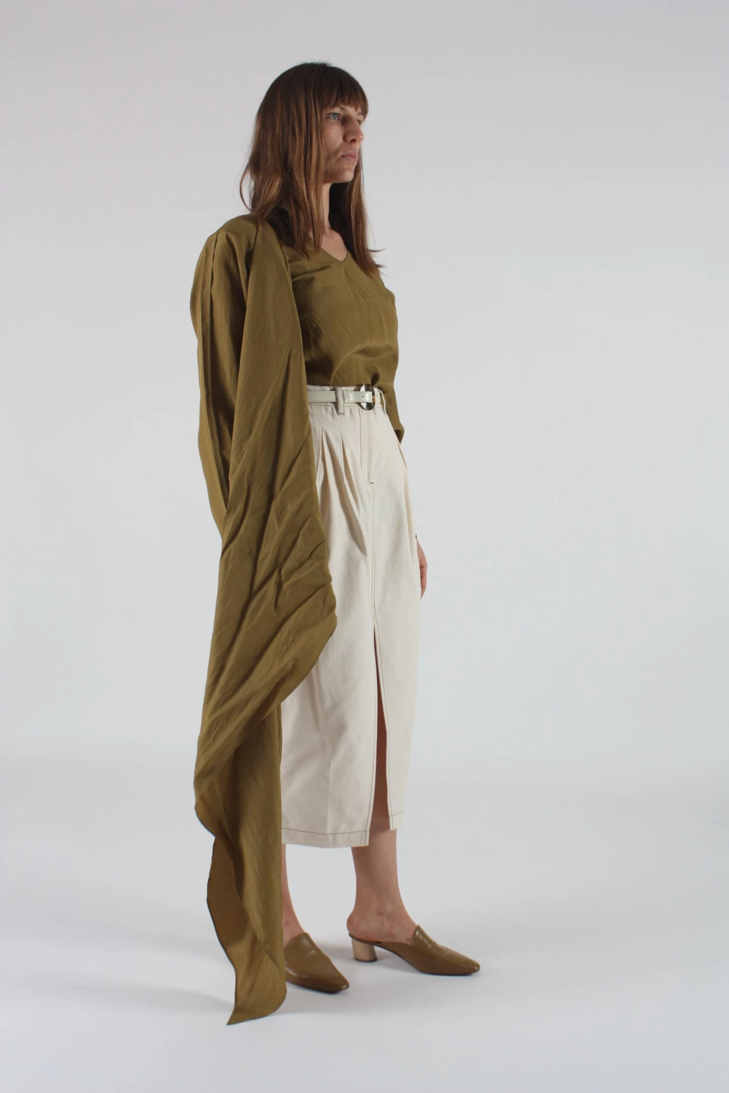 The Shawl Blouse is a long sleeve blouse with shawl extension in a textured viscose which can be worn several different ways. Exterior french seam and button and cuff, subtle but dramatic sleeve shape.