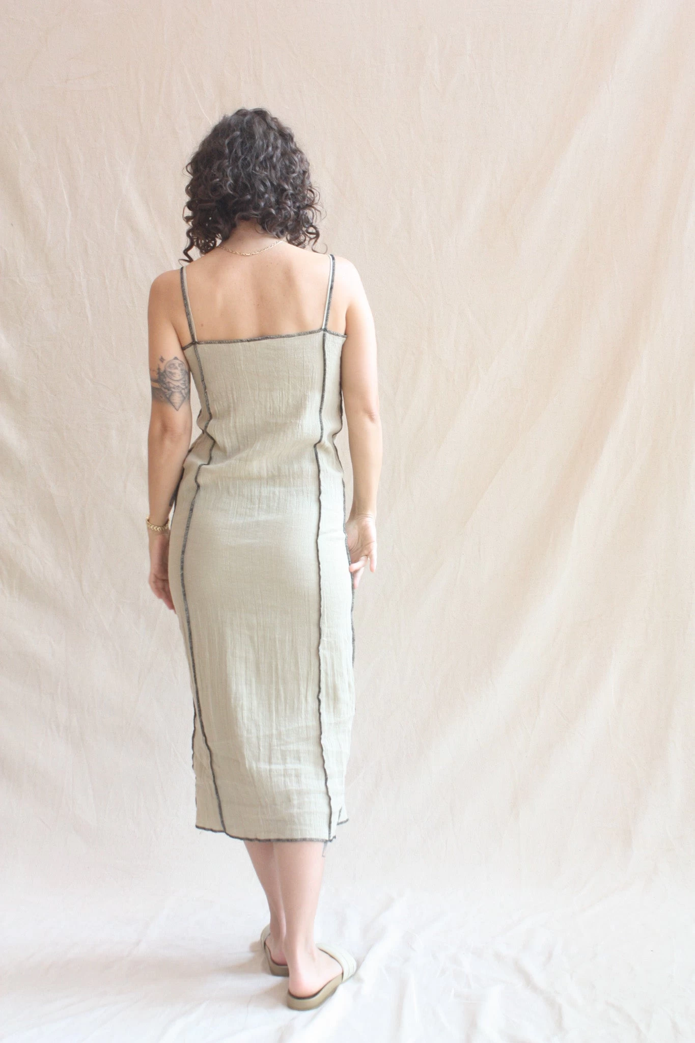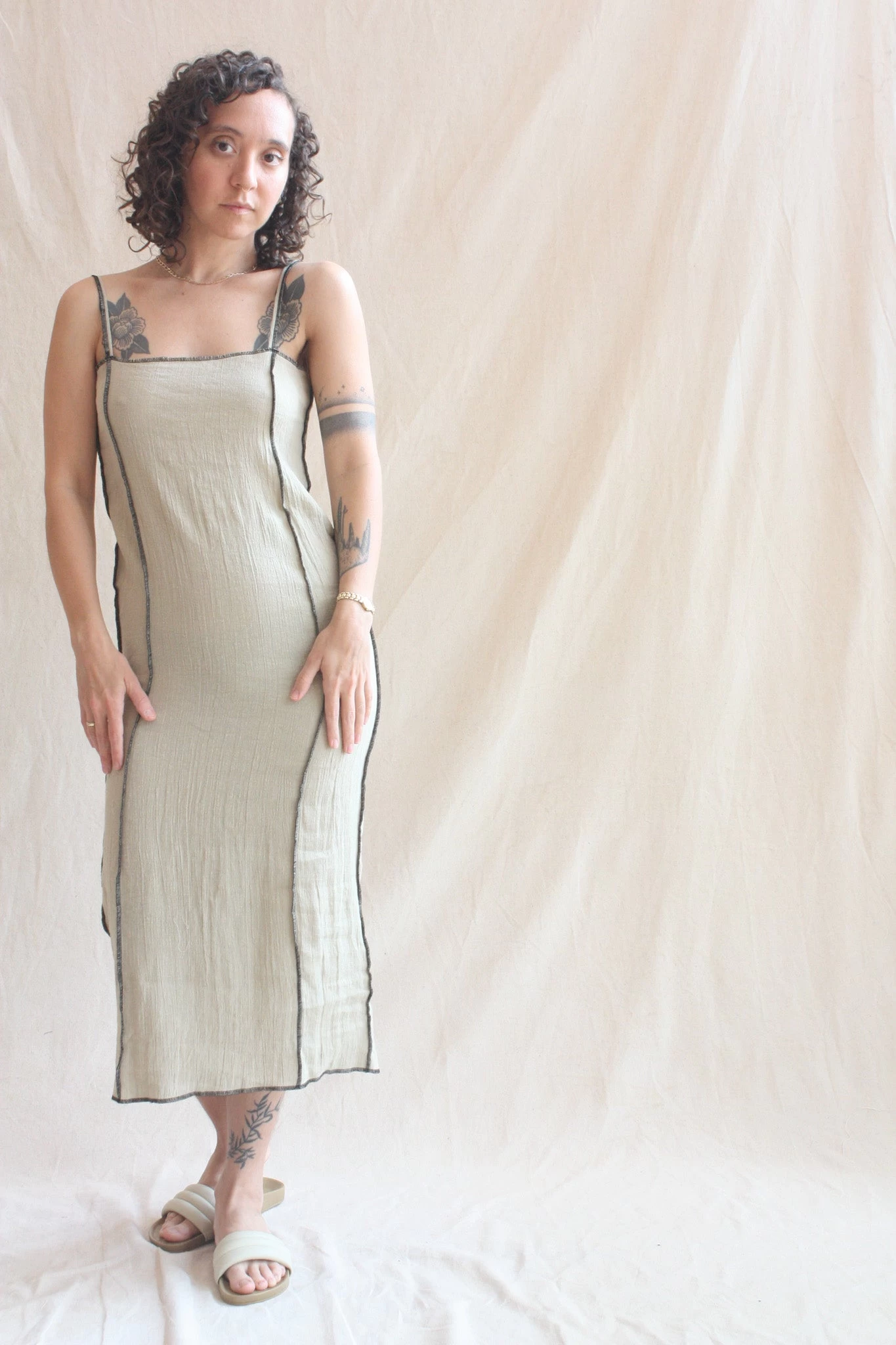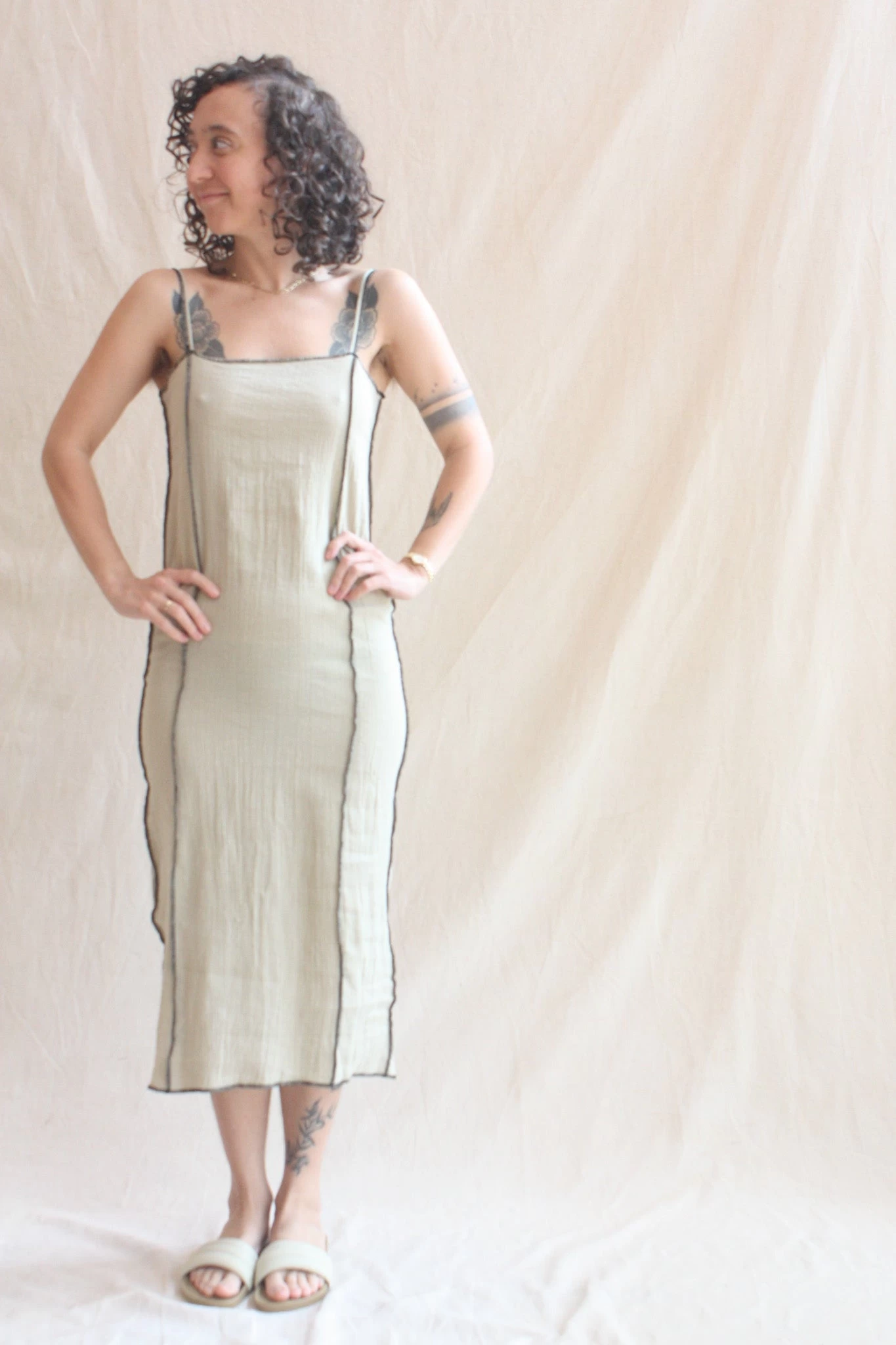 Crinkle linen slip dress with exposed contrast seams and thin shoulder straps. Oeko-Tex certified linen from France and Belgium.