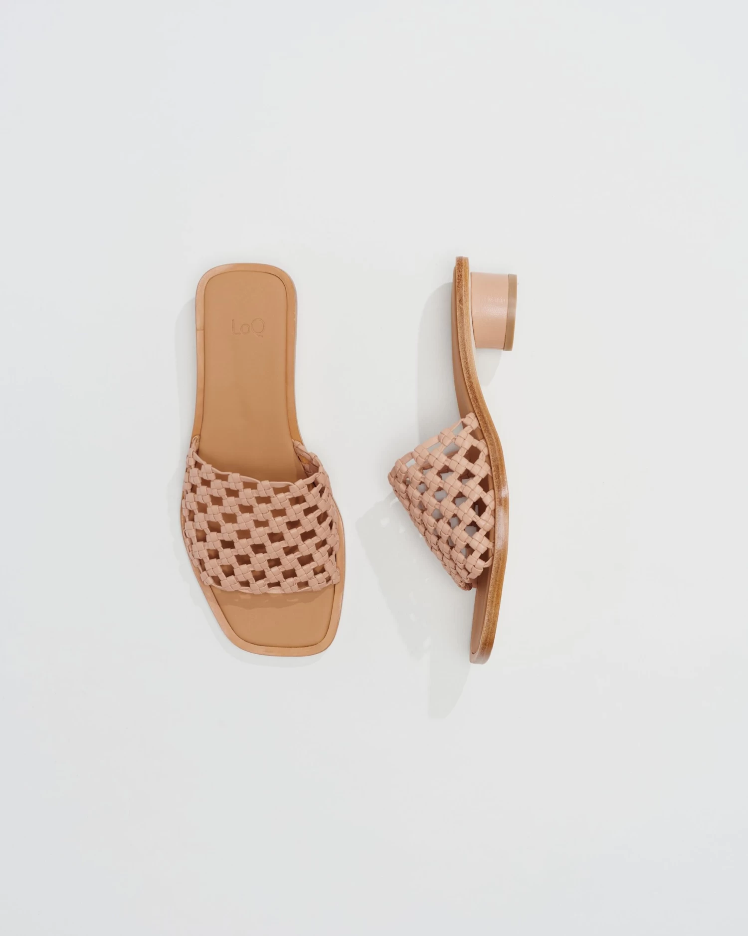 The Simona is a square toe sandal featuring a handwoven open lattice upper in nude kid leather.