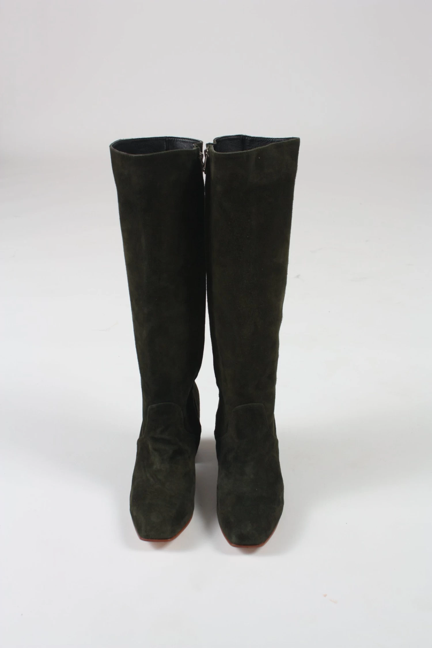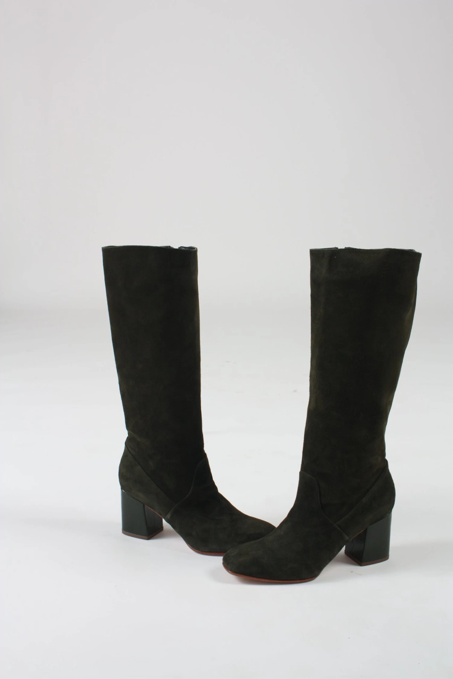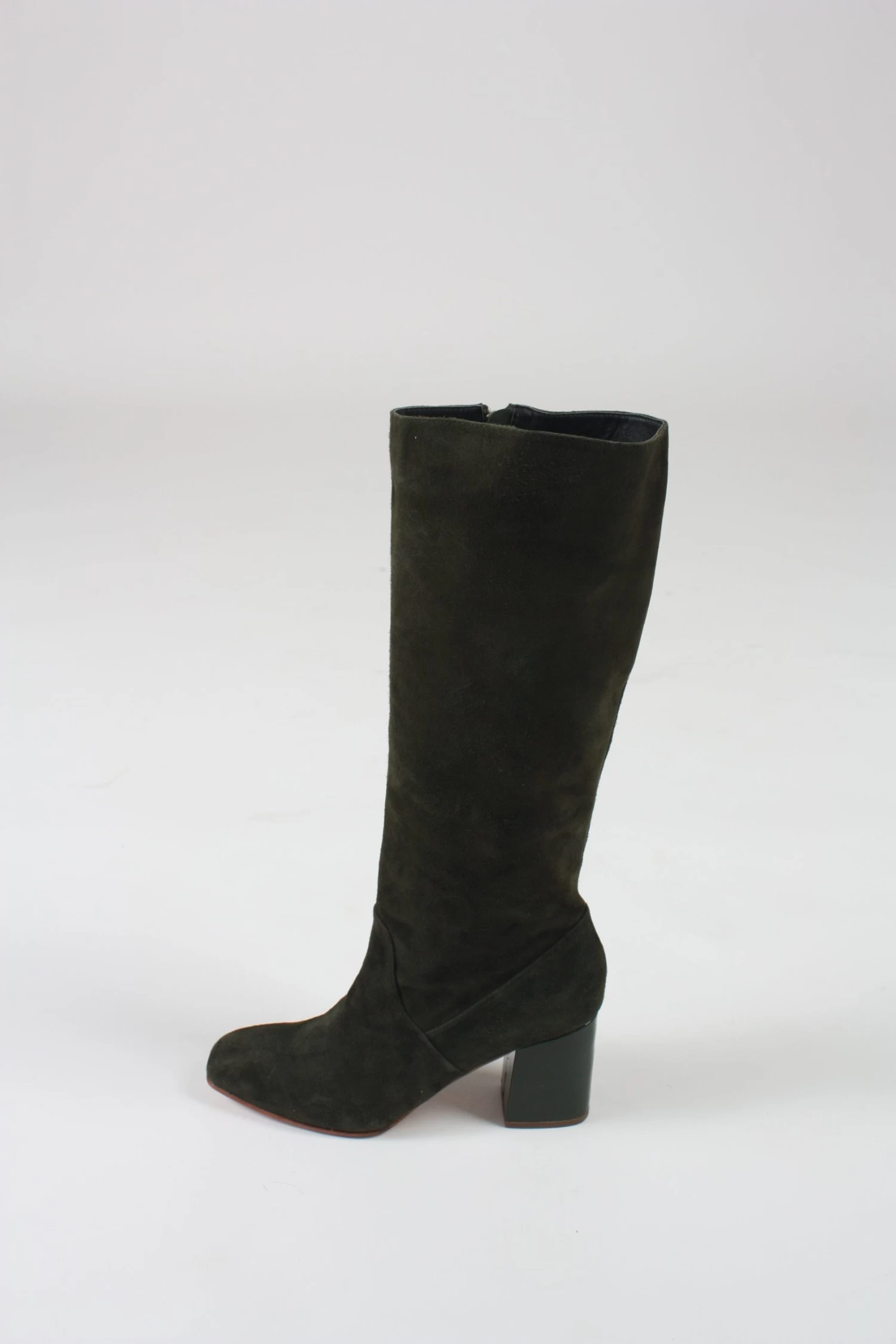 Knee high boot in a moss green suede with tonal leather block heel. Tapered square toe. Silver side zipper. Fully lined.