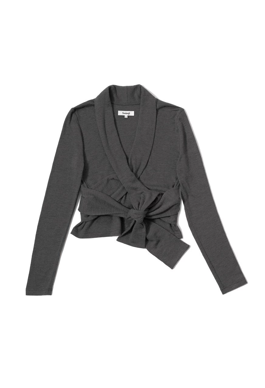 Solange Shirt is a wrap shirt with a twist. Â Made from grey colored wool and polyamide blend fabric. The full sleeved shirt has two wrap strings attached and it has v-neckline with small collar.
