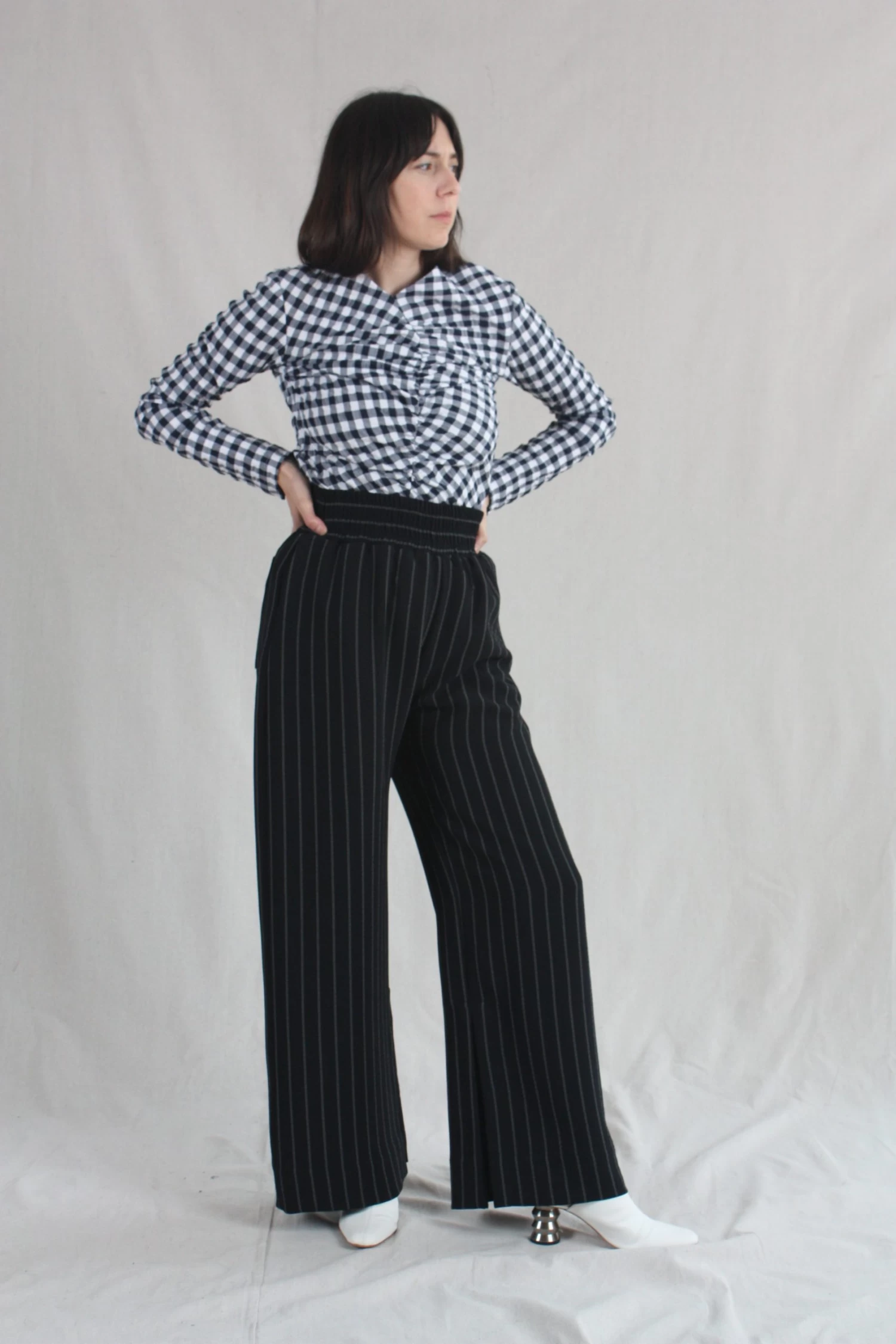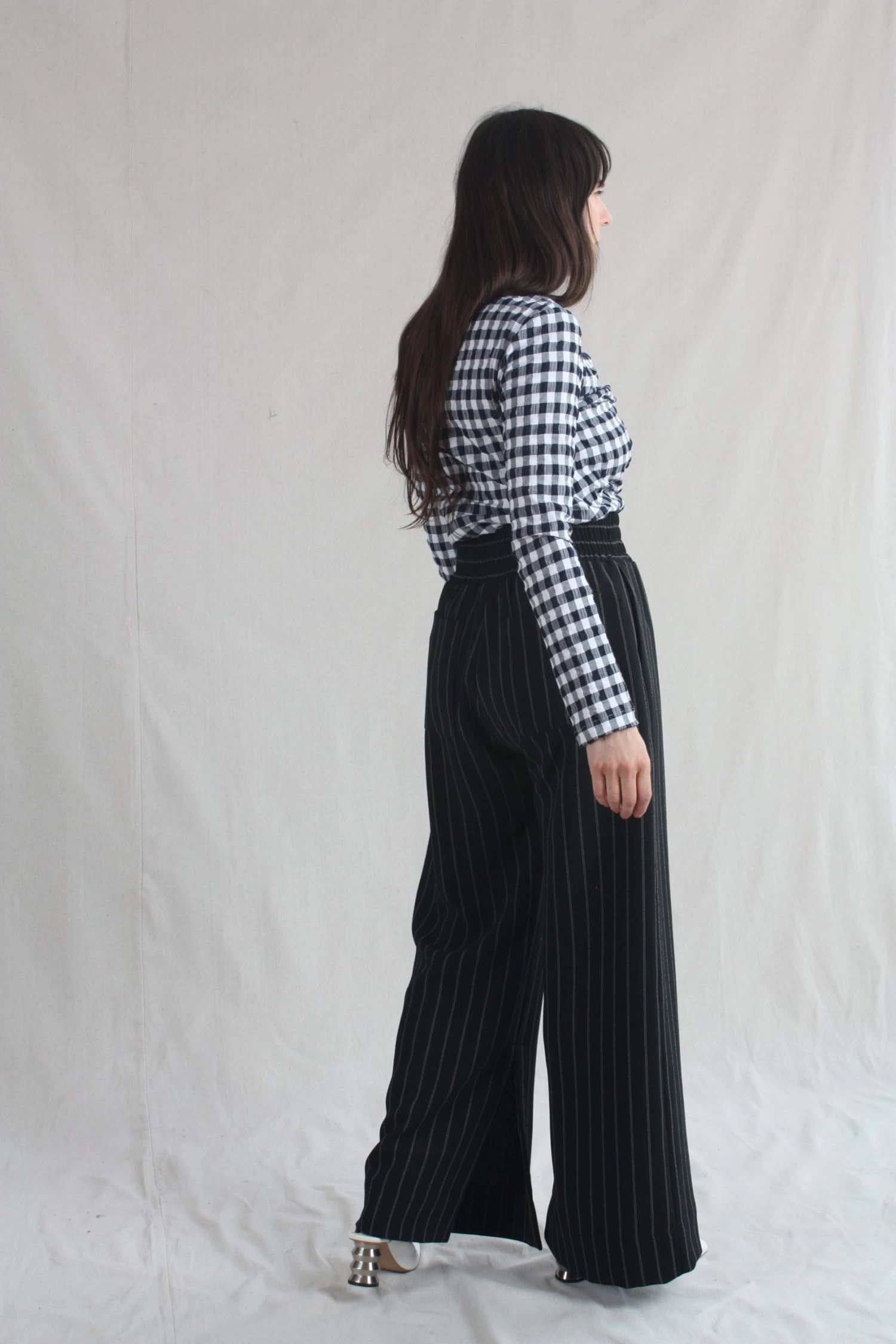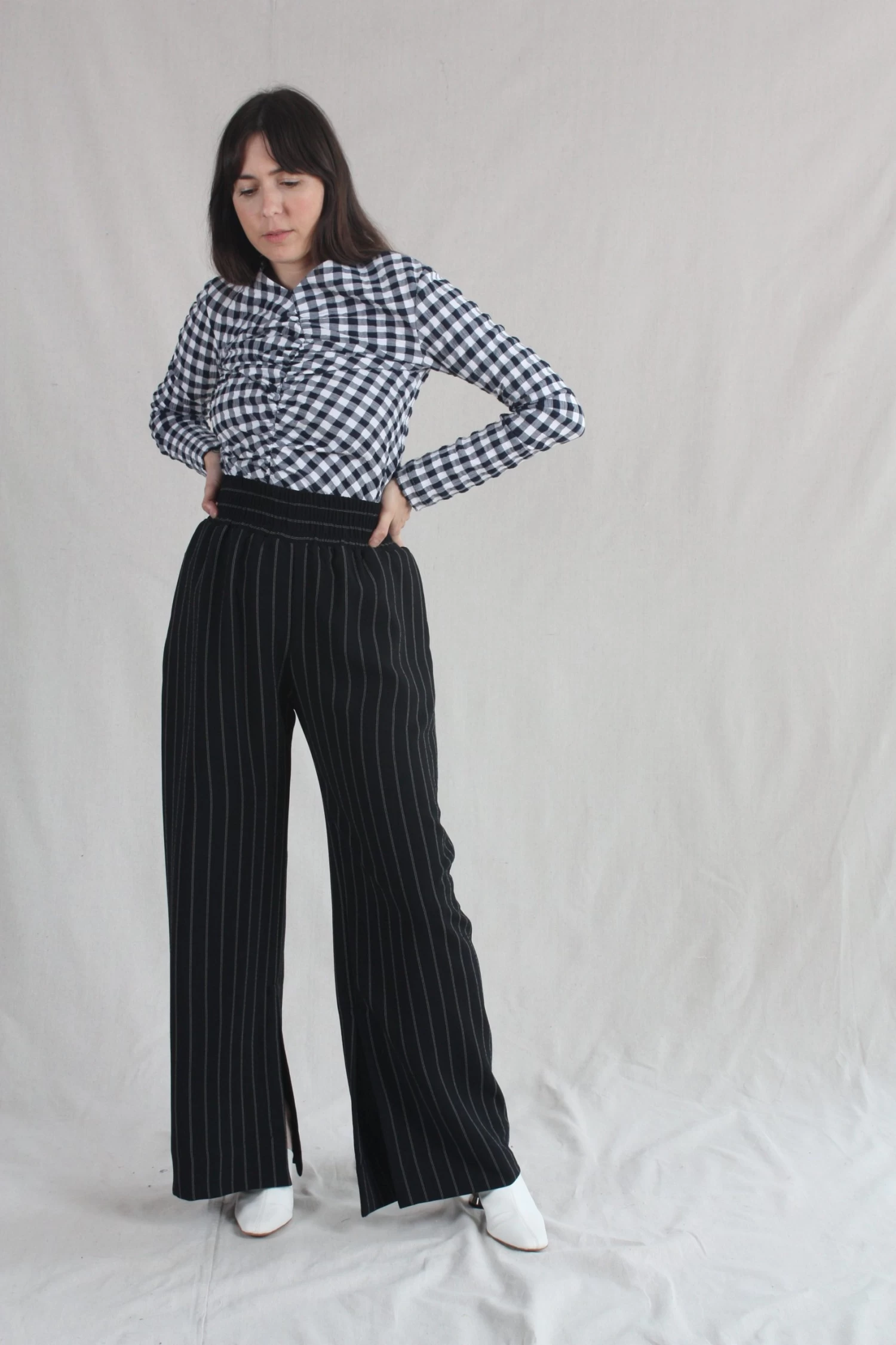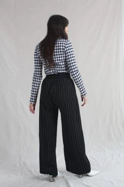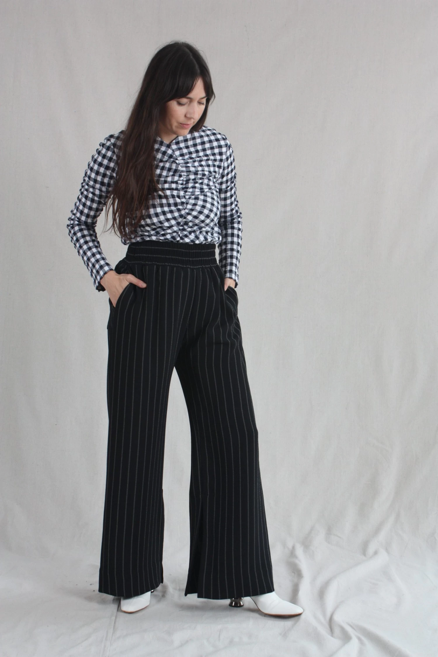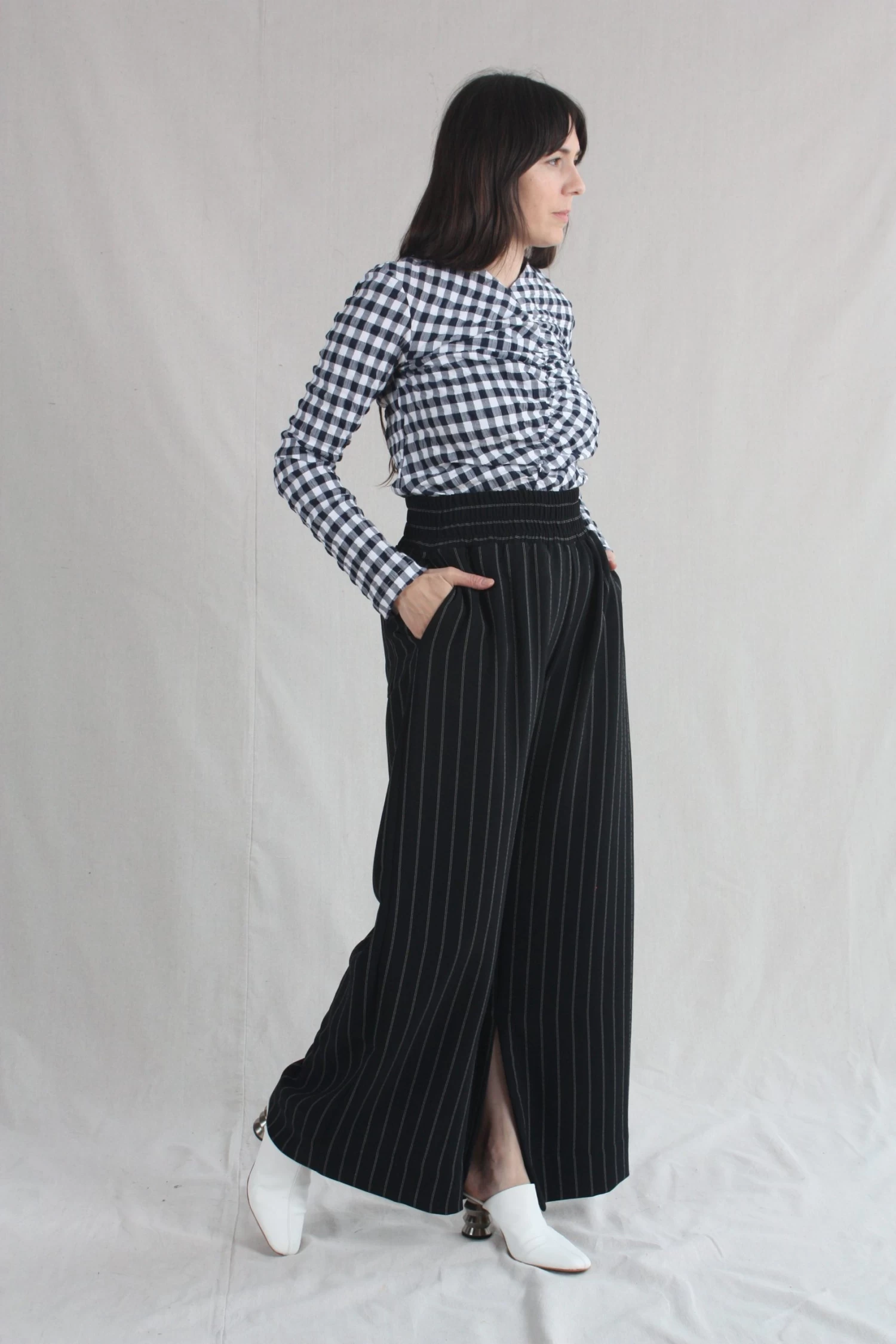 Wide elastic waistband with side seam pockets and inner seam slits at the hem of the pants. Back Pocket. Pinstripe crepe.Â