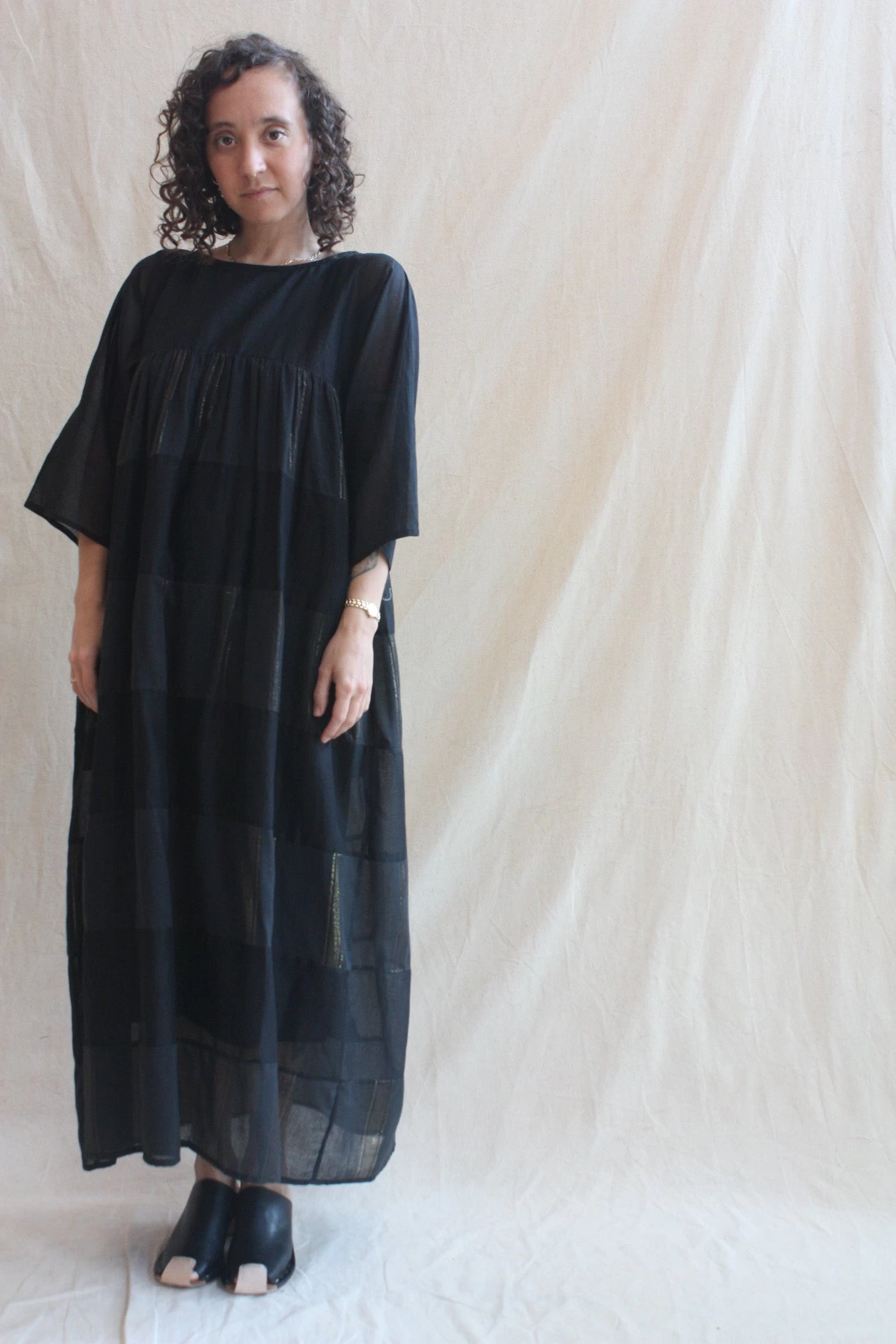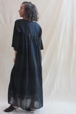 Pull over maxi dress that hits at the ankle. Relaxed, straight body silhouette with hidden pockets at side seams. Rounded neck and elongated short sleeves.