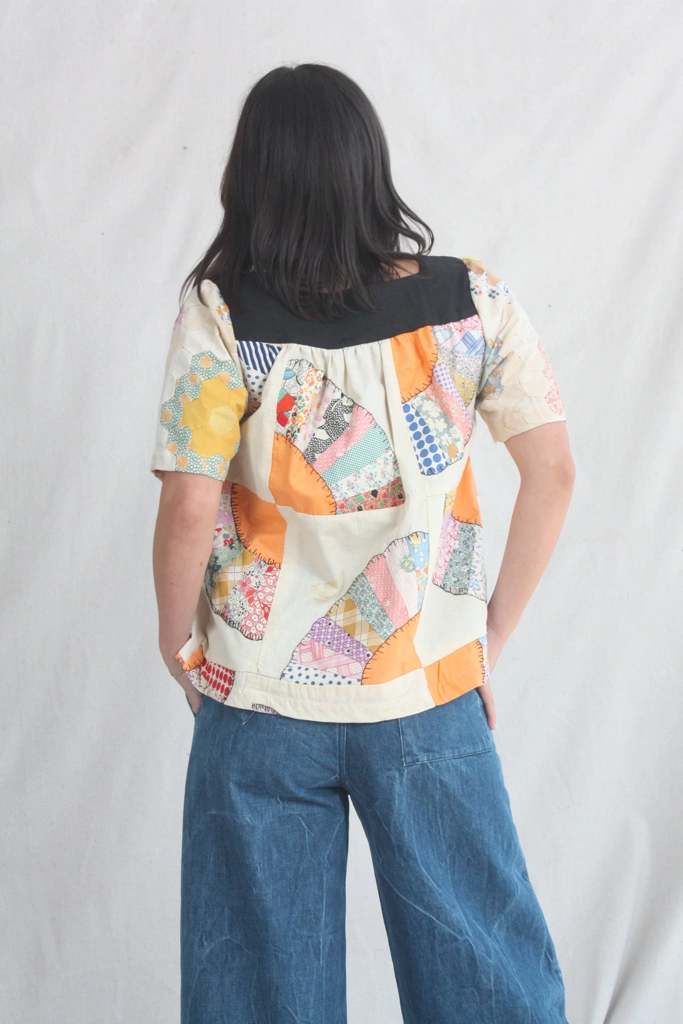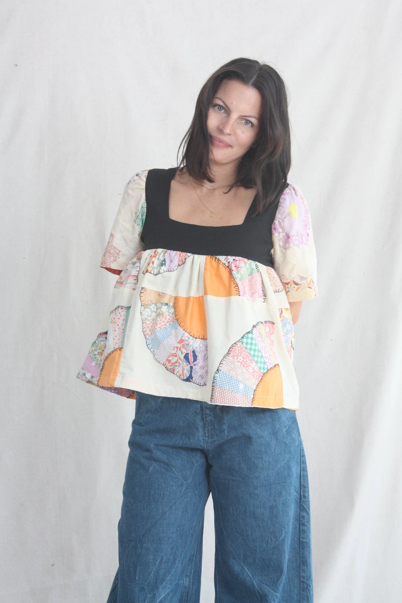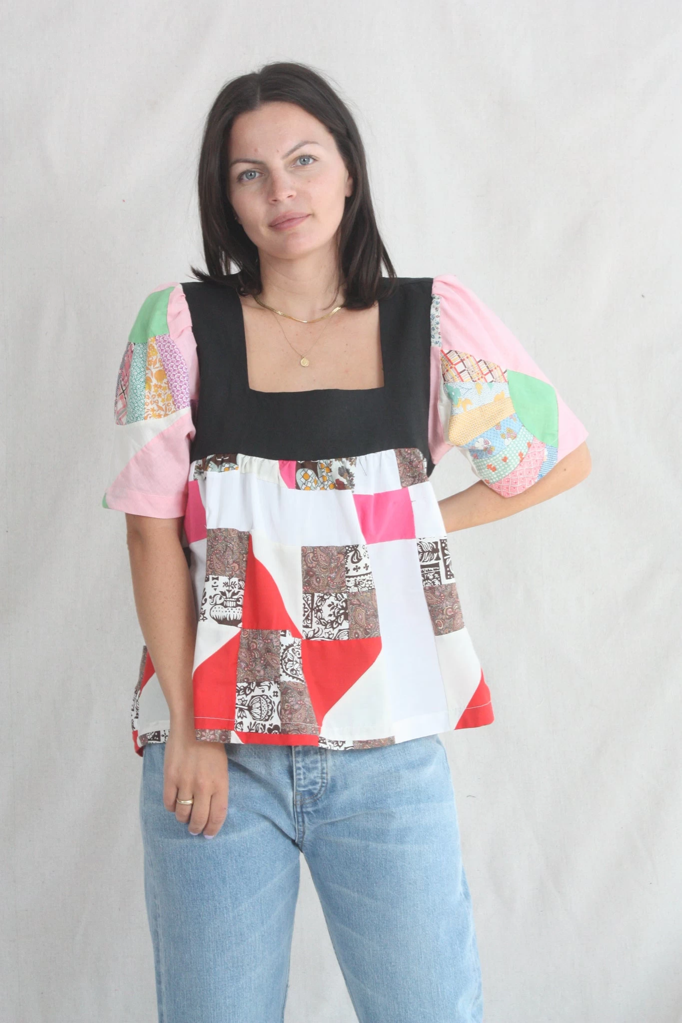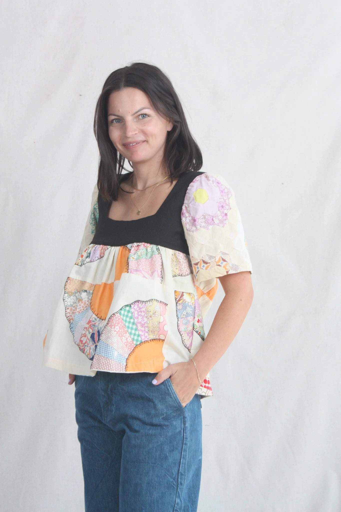 The Square Neck Shirt is a one-of-a-kind vintage patchwork shir framed by black linen at the neckline, grounding the vintage patchwork quilt design below. The blouse has a flowy and flexible fit, perfect for every day. Each shirt is one of a kind and Carleen handpicks textiles that may include wear, distress, marks, and other signs of age intentionally as we believe this adds to the character of the finished garment.