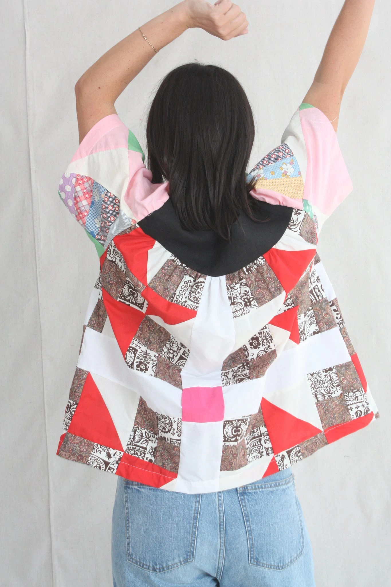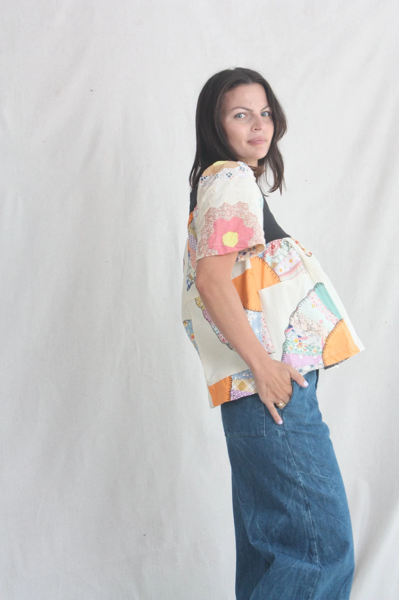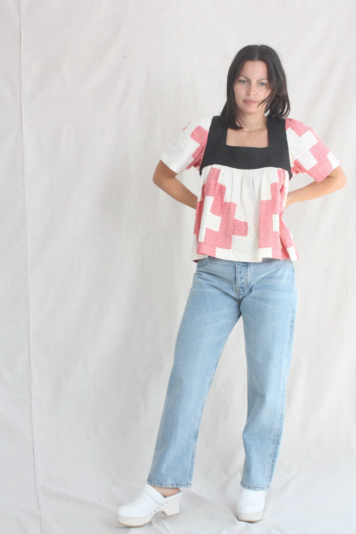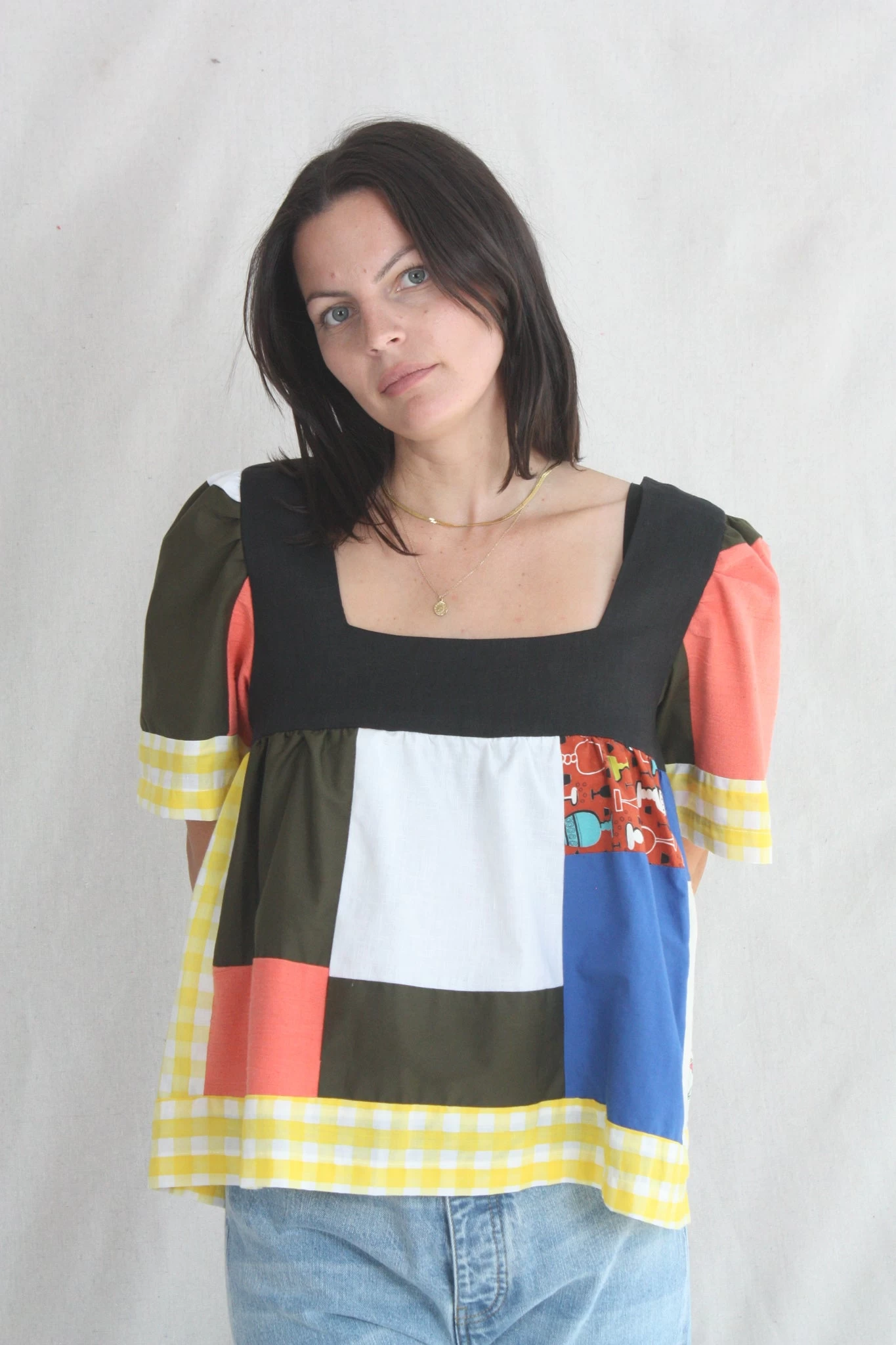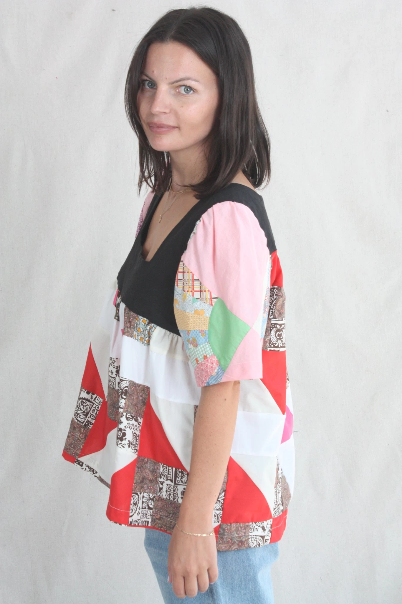 The Square Neck Shirt is a one-of-a-kind vintage patchwork shir framed by black linen at the neckline, grounding the vintage patchwork quilt design below. The blouse has a flowy and flexible fit, perfect for every day. Each shirt is one of a kind and Carleen handpicks textiles that may include wear, distress, marks, and other signs of age intentionally as we believe this adds to the character of the finished garment.