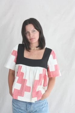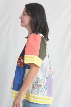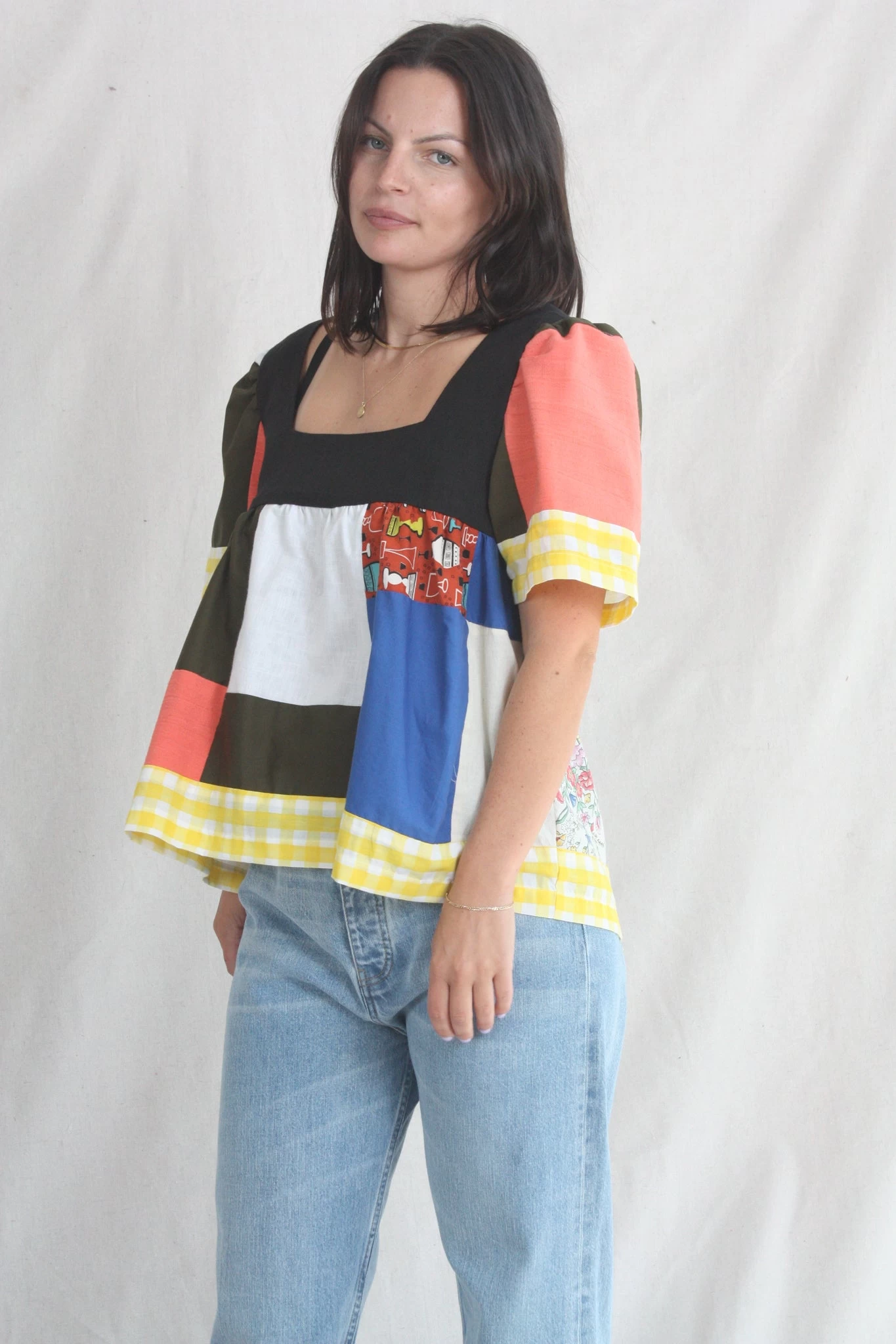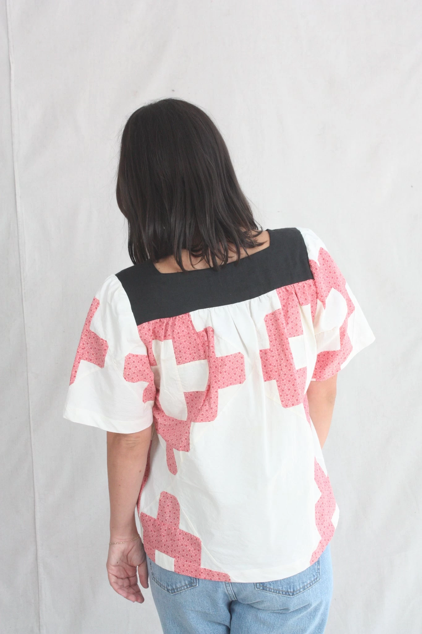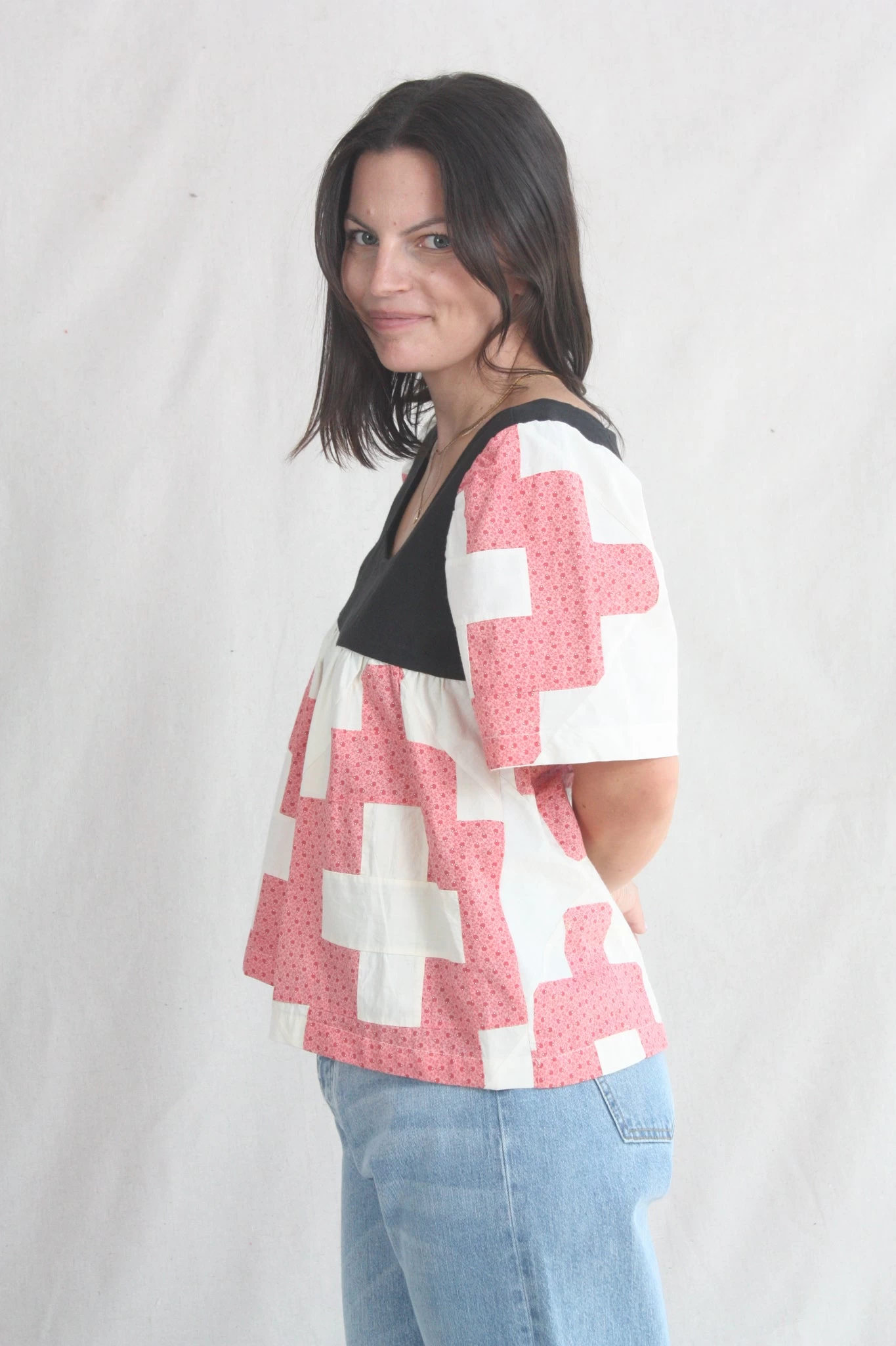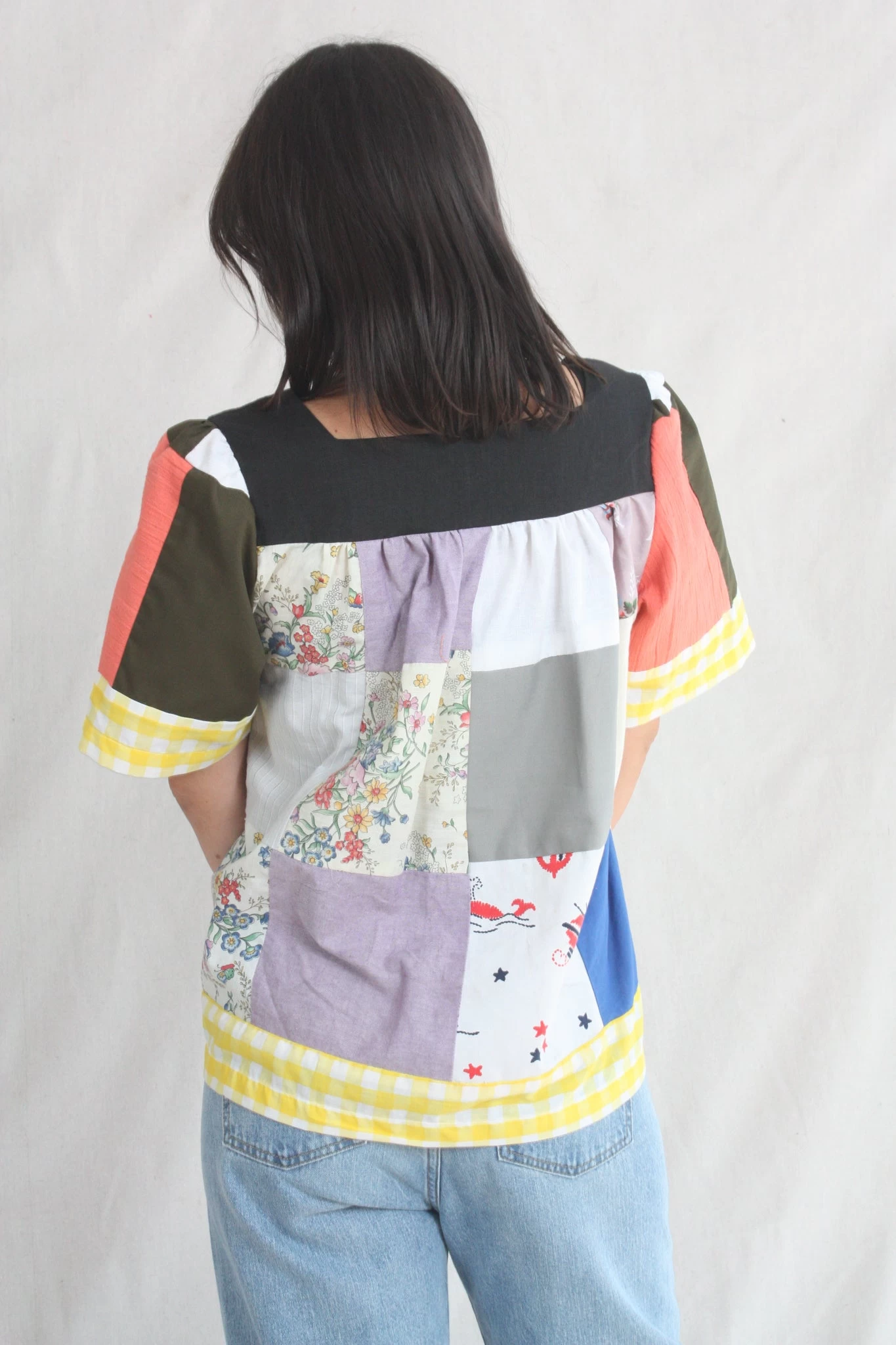 The Square Neck Shirt is a one-of-a-kind vintage patchwork shir framed by black linen at the neckline, grounding the vintage patchwork quilt design below. The blouse has a flowy and flexible fit, perfect for every day. Each shirt is one of a kind and Carleen handpicks textiles that may include wear, distress, marks, and other signs of age intentionally as we believe this adds to the character of the finished garment.