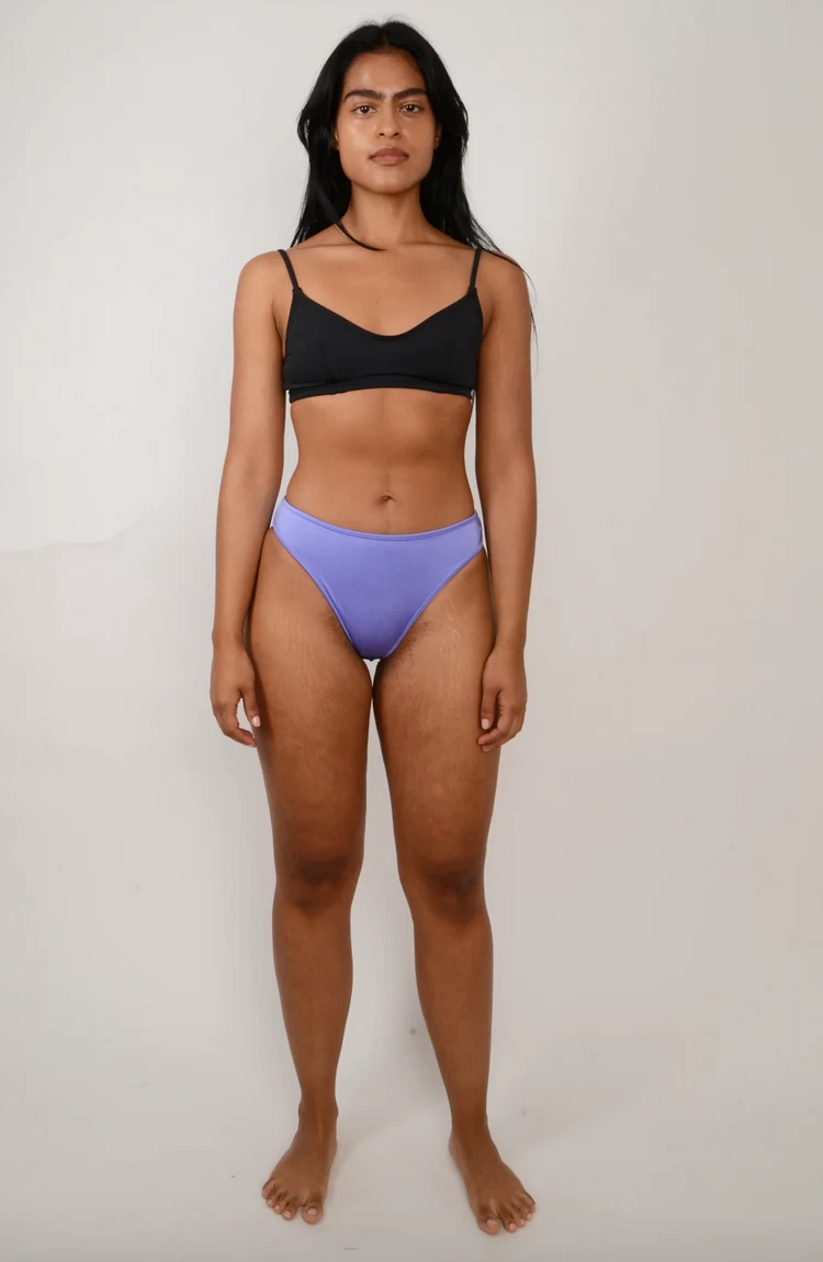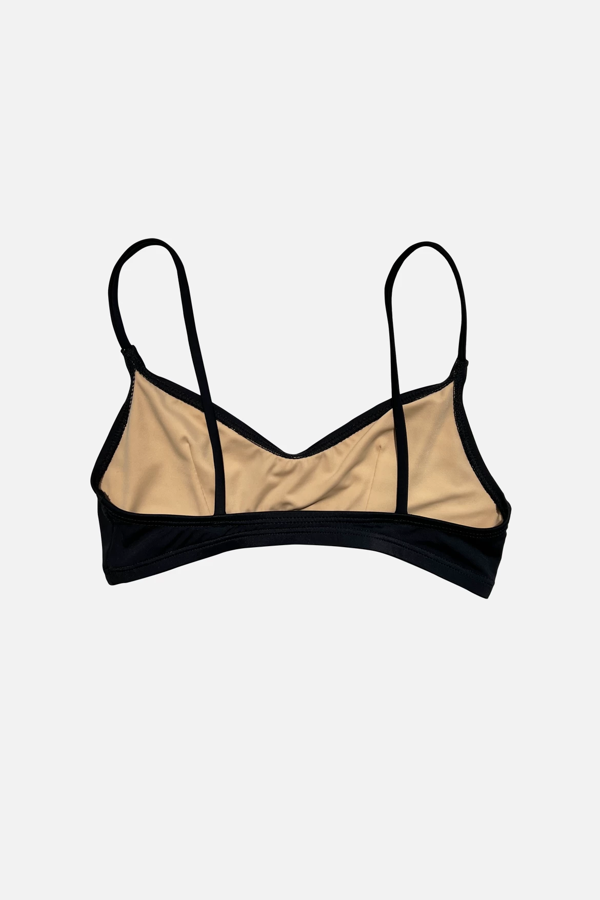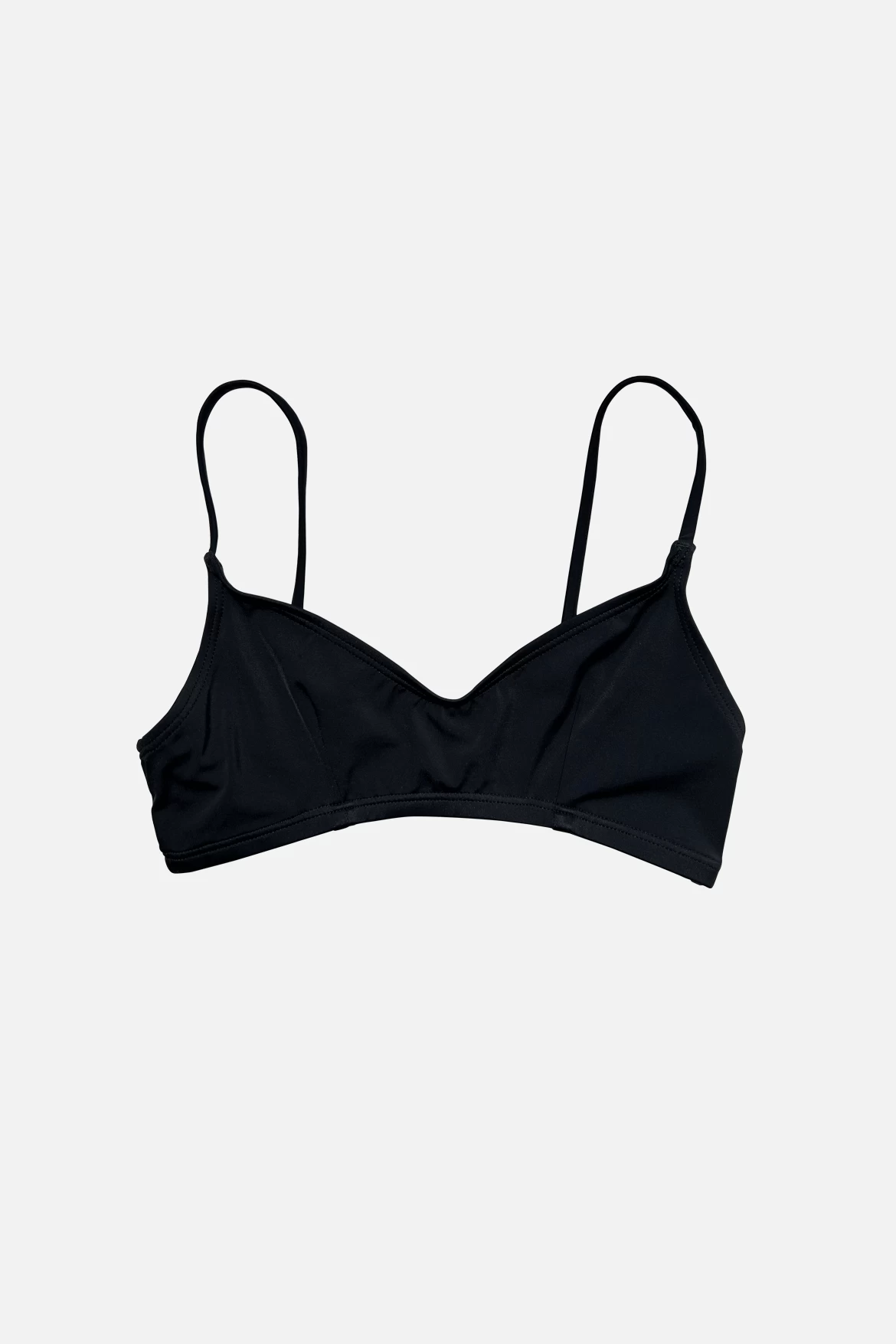 Simple bralette-style top with darts at bust for fit and 1/2″ encased elastic hem for extra support. Medium coverage. Fully lined. 2-way stretch.