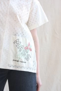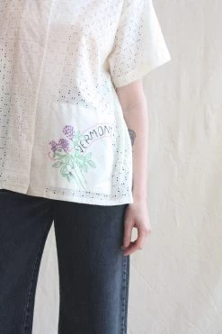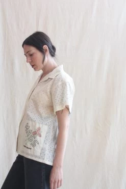 The James Shirt is a classic button down short sleeve top cut from a geometric cotton lace. Each shirt features an appliqued embroidered patch highlighting a New England state.