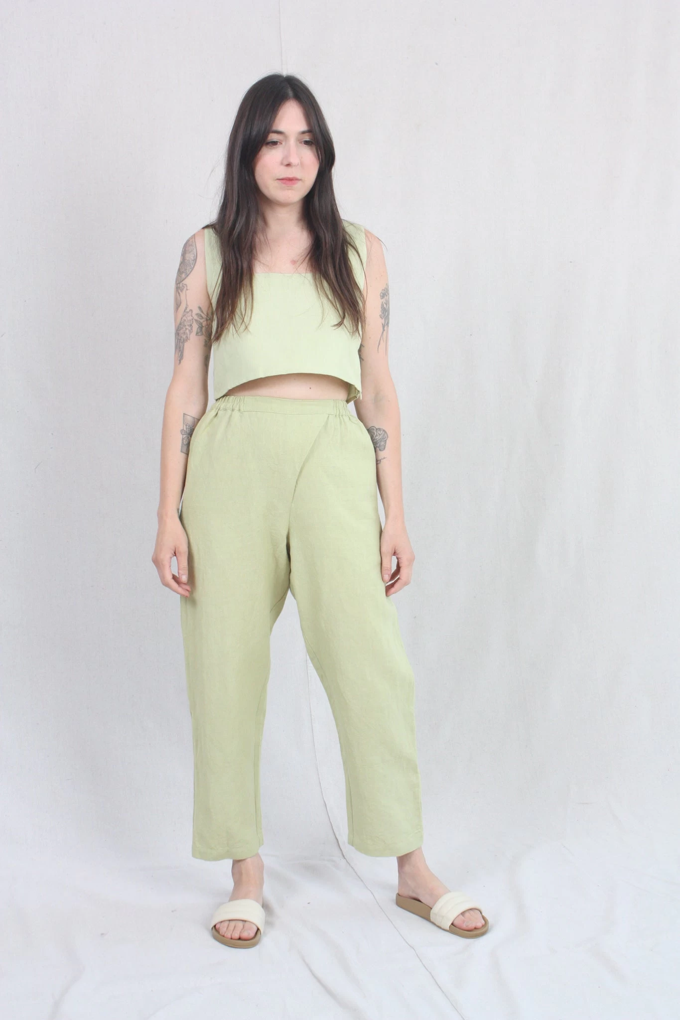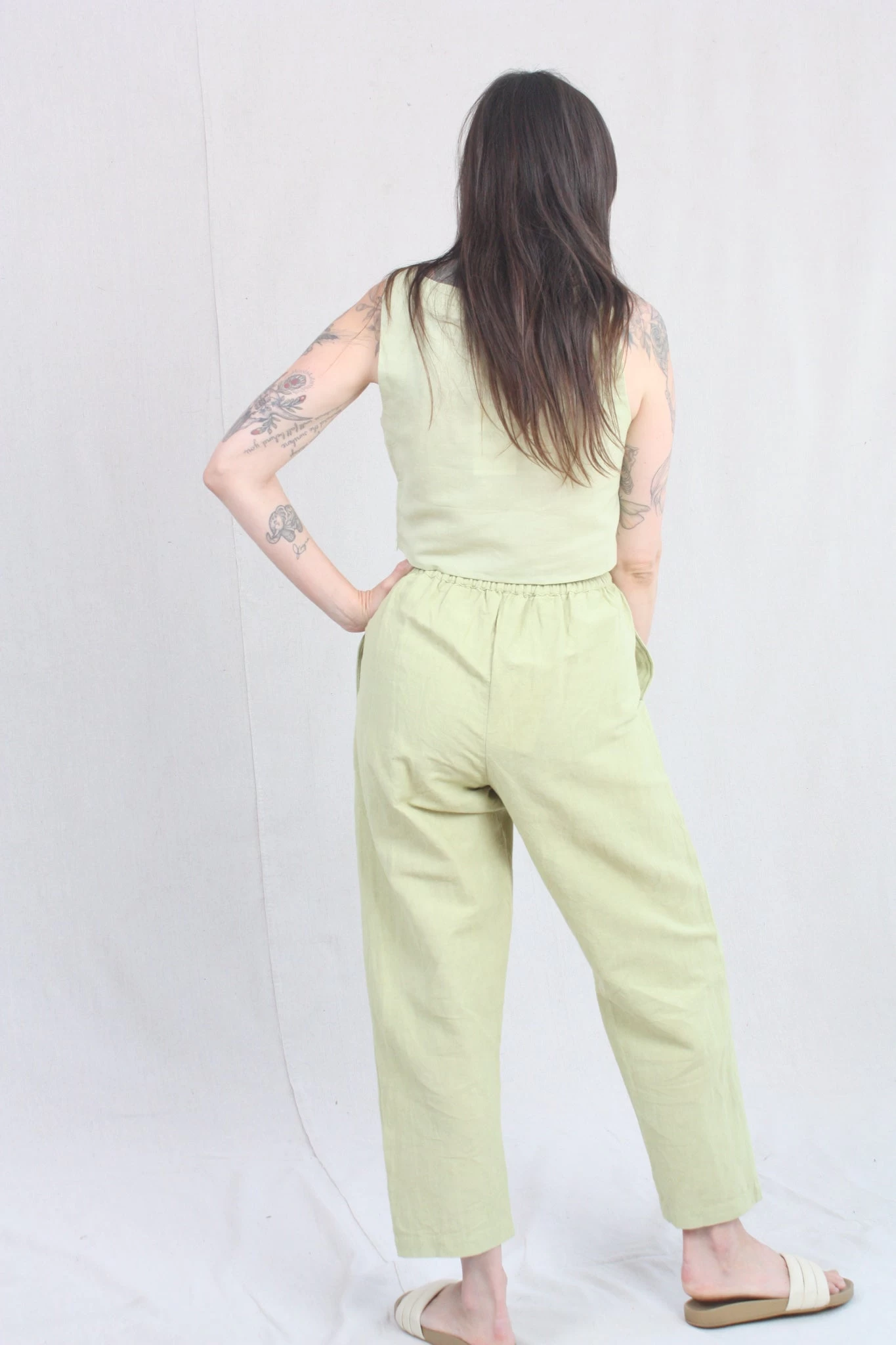 Versatile, straight leg pant with a slight overlap fly front detail, featuring pockets and elastic back waist, allowing for an easy fit. This style can be worn high waisted or as a relaxed, drop crotch. Made of breathable and ultra-comfortable cotton/linen.