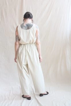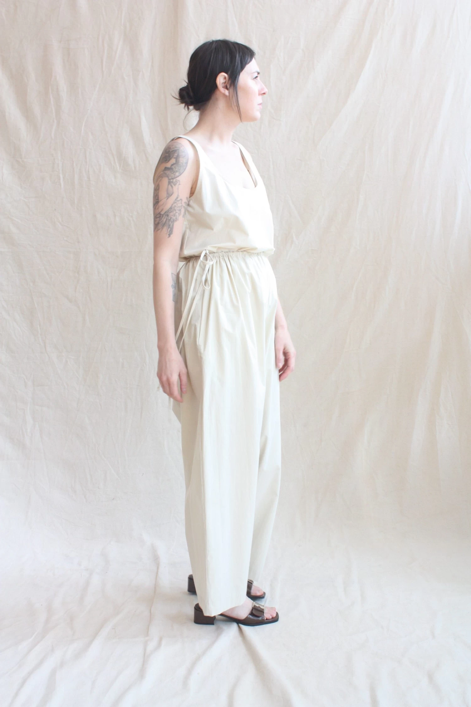 Cotton parchment poplin pull-over tank top. Crisp finish to the fabric. Scoop neck. Style relaxed or tucked in. Relaxed fit, but true to size. Pair with the coordinating Balloon Pant from Modern Weaving for a monochromatic look.