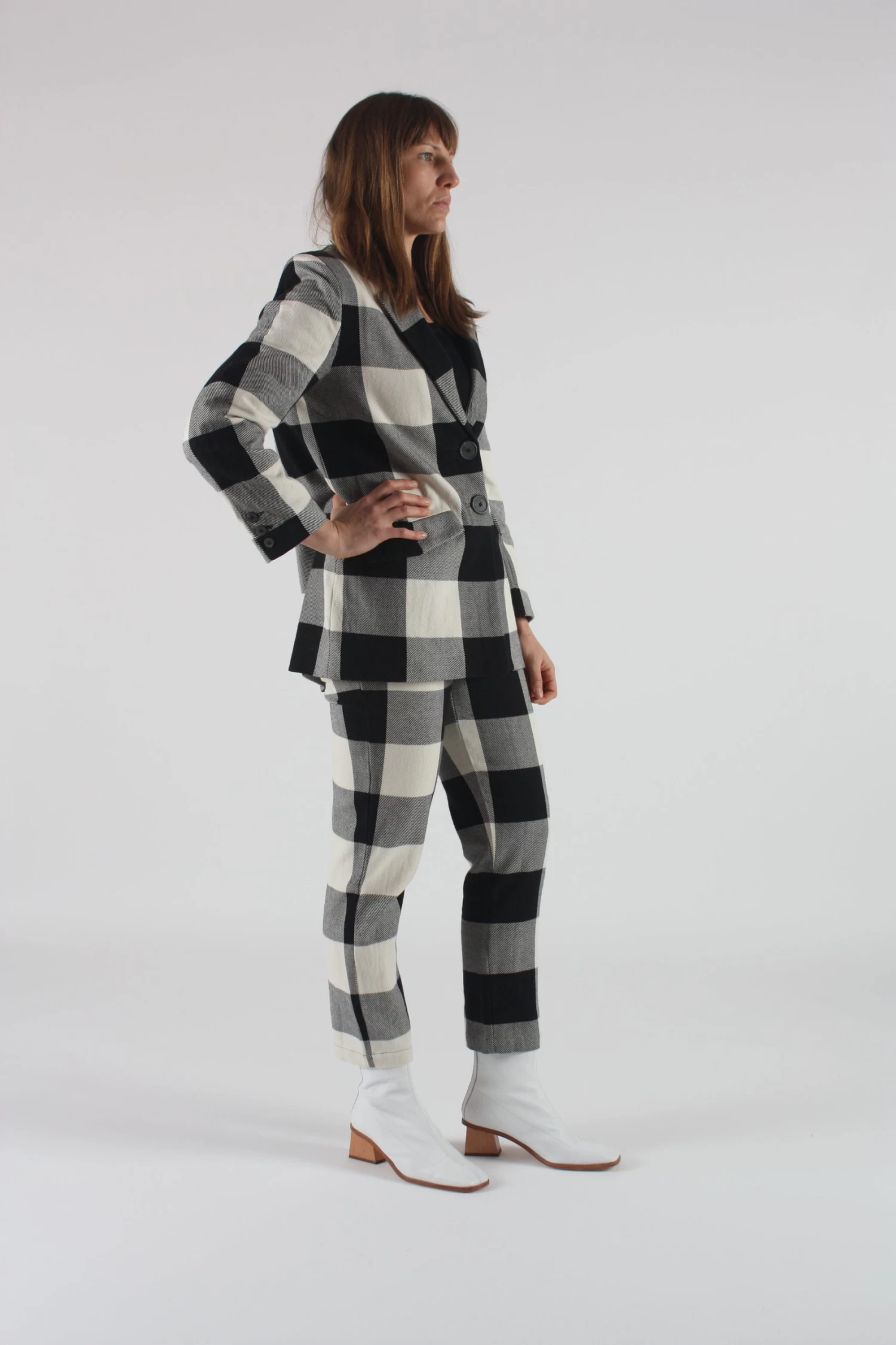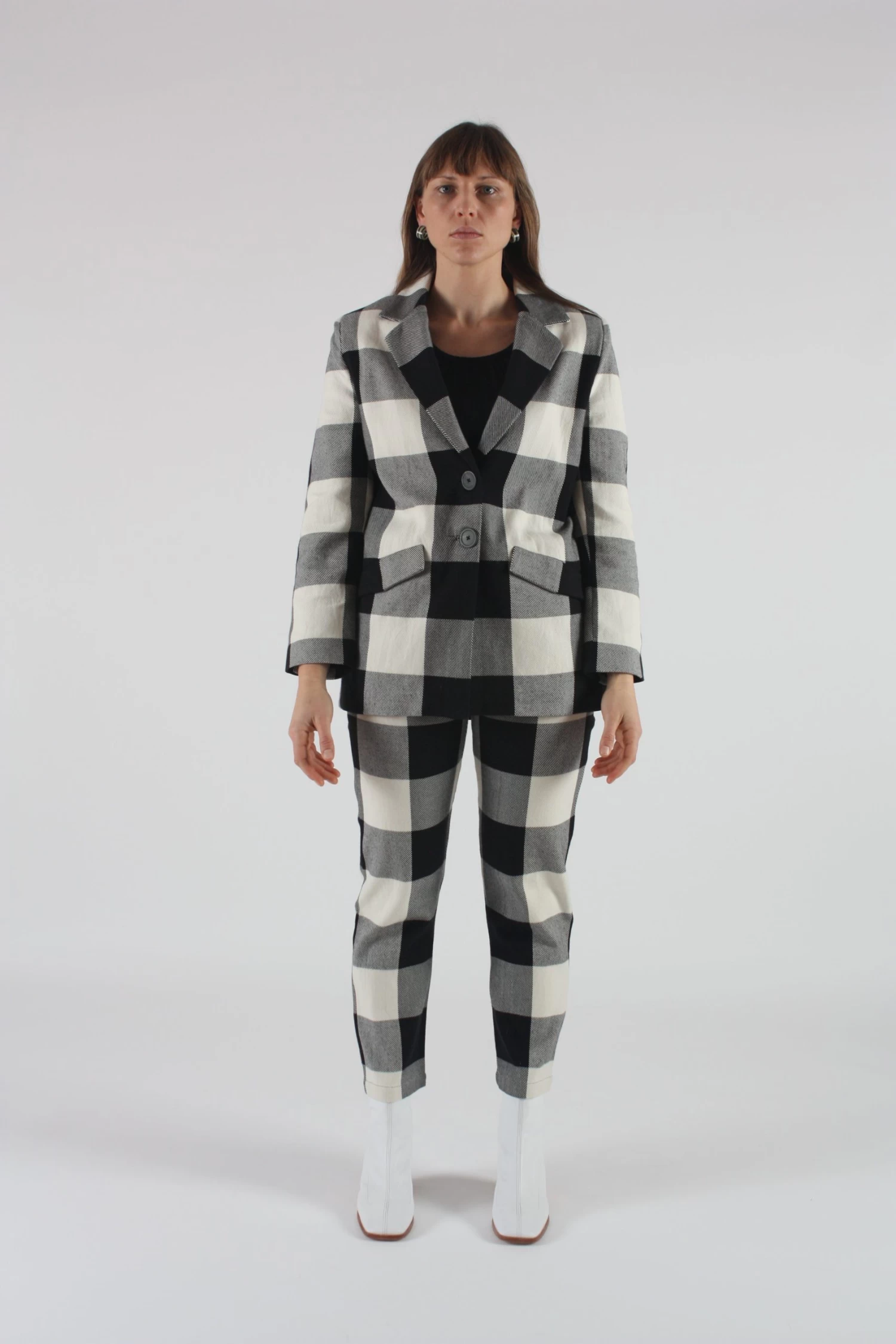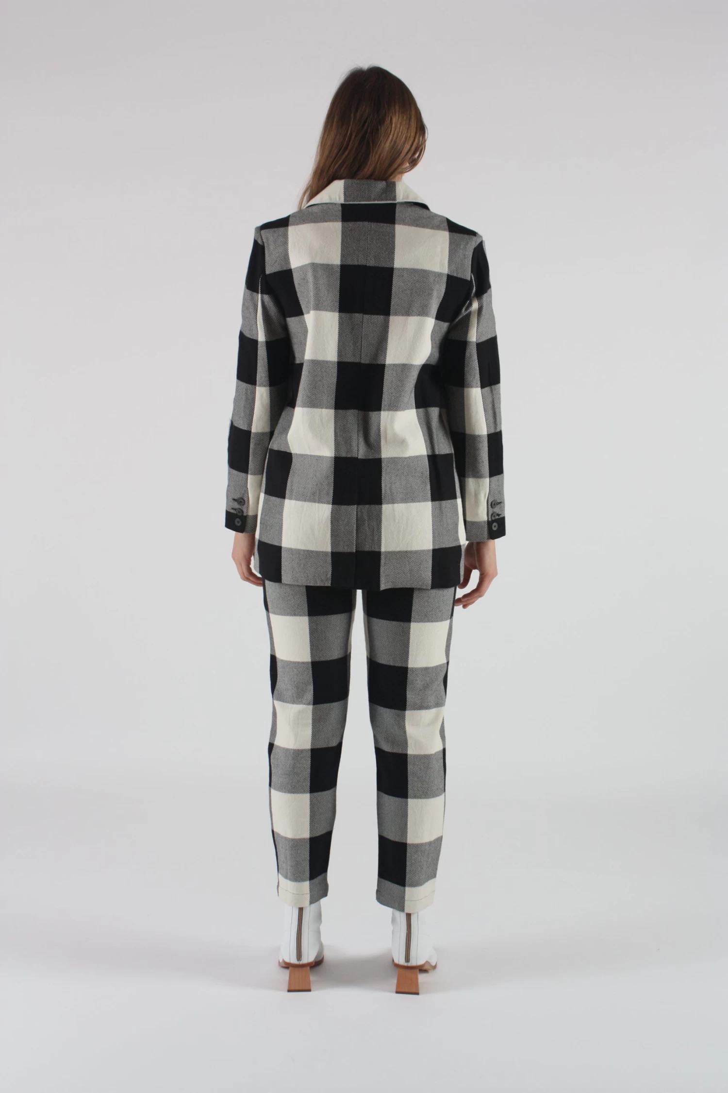 The Tatum jacket in black and cream Ensenada plaid. Notched lapel collar. Two button closure at front. Flap pockets at waist. Three-button cuffs. Padded shoulders. Back vent. Oversized fit. Print placement may vary.