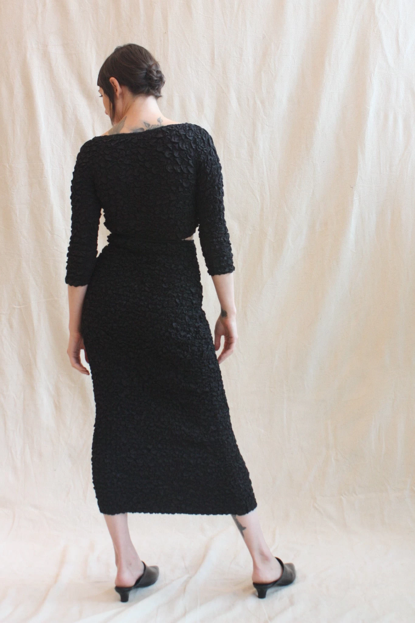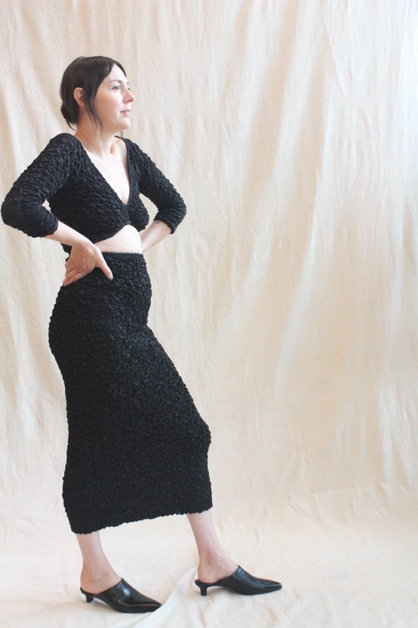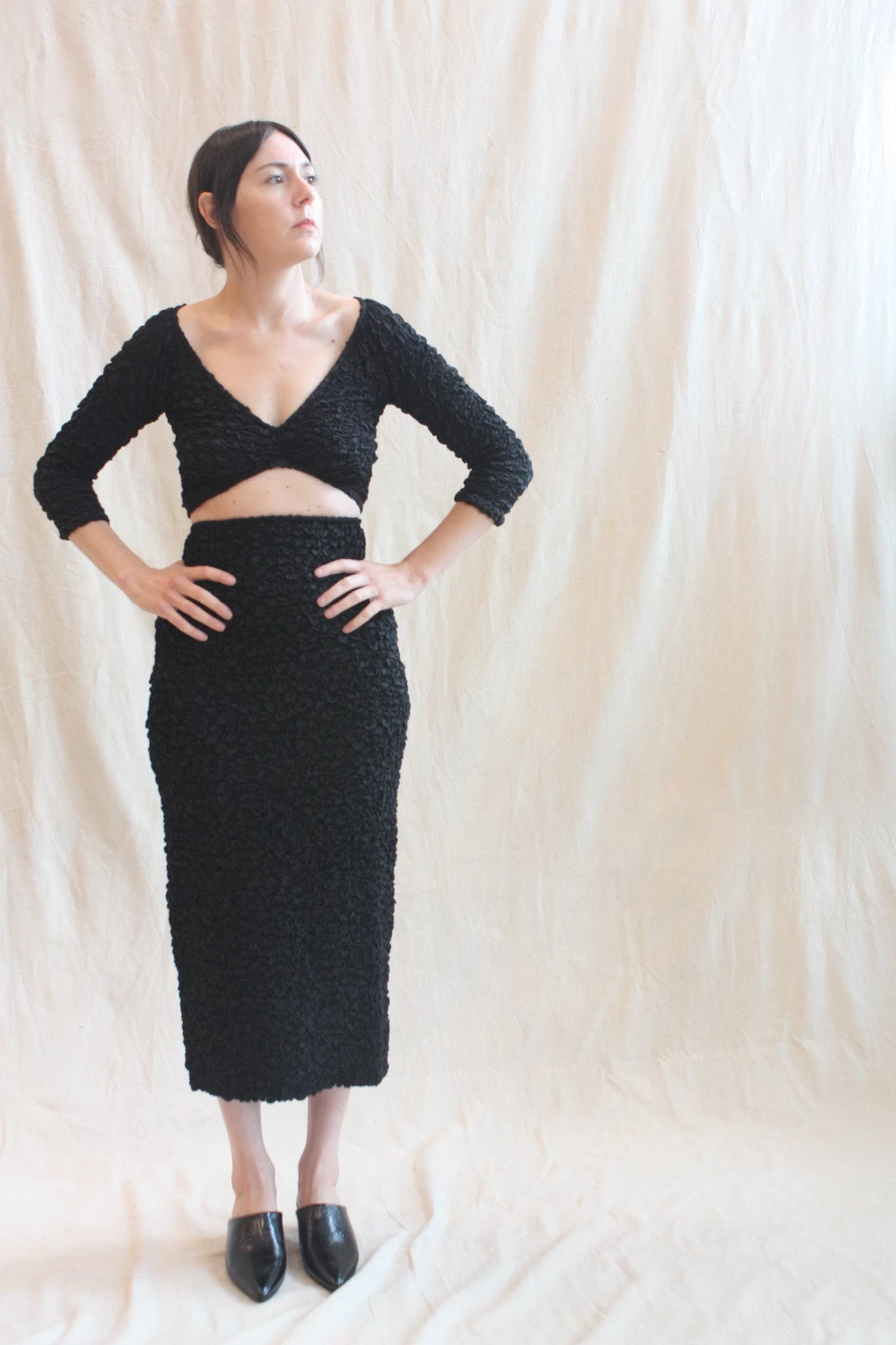 Tavi is a high-waisted, fitted pencil skirt that hits at mid-calf. Featuring an elastic waistband and smocking throughout that creates a popcorn texture. Pair with the coordinating Aja Top.