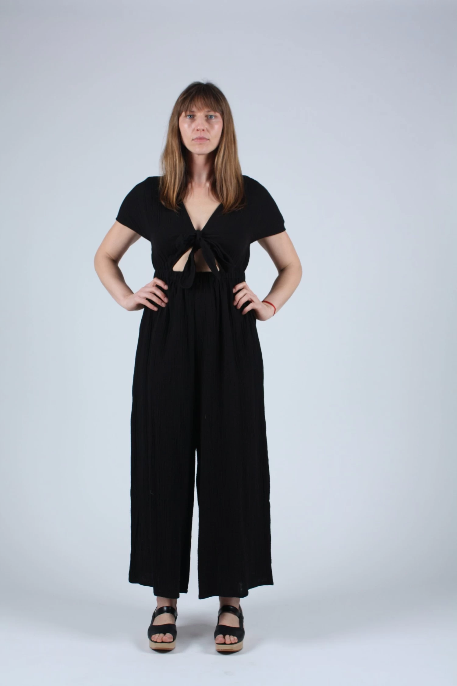 An effortless, relaxed black jumpsuit in super soft black cotton gauze. Features a comfortable elastic waist, tie front bust, cut out detail and side seam pockets.