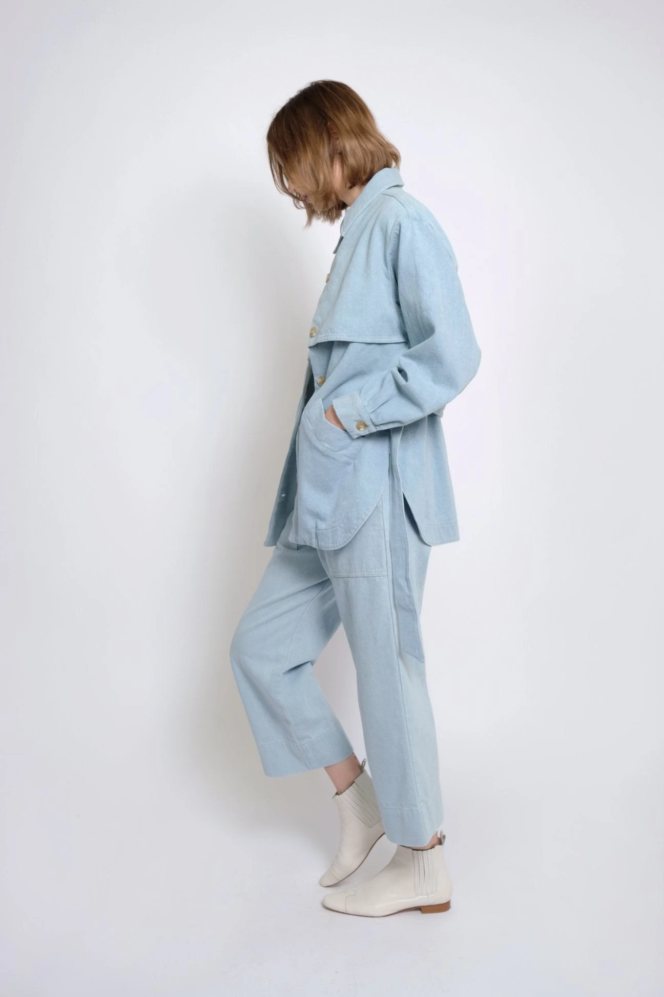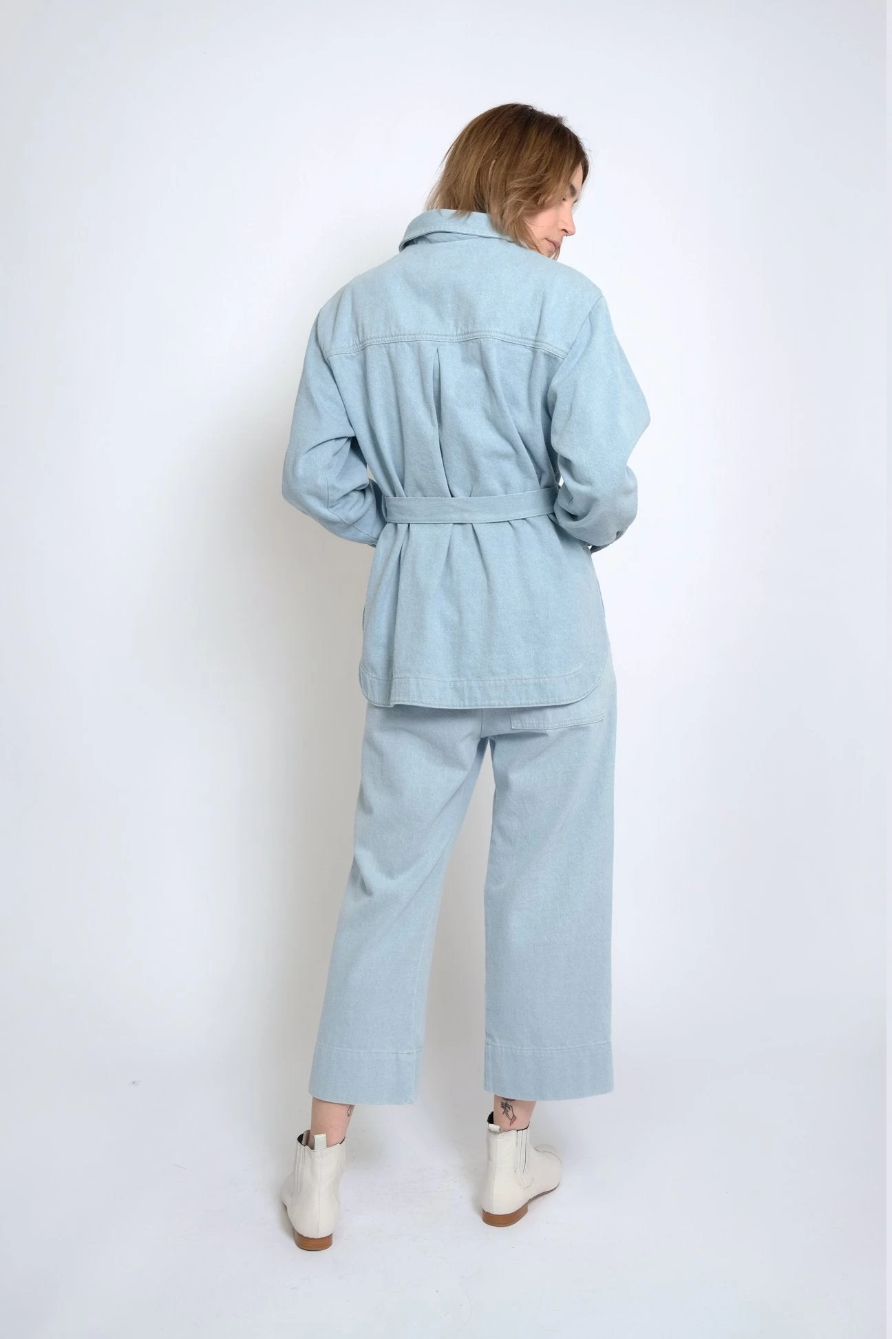Trench style jacket with overlay piecing and self tie belt. Rounded hem and deep back yoke.