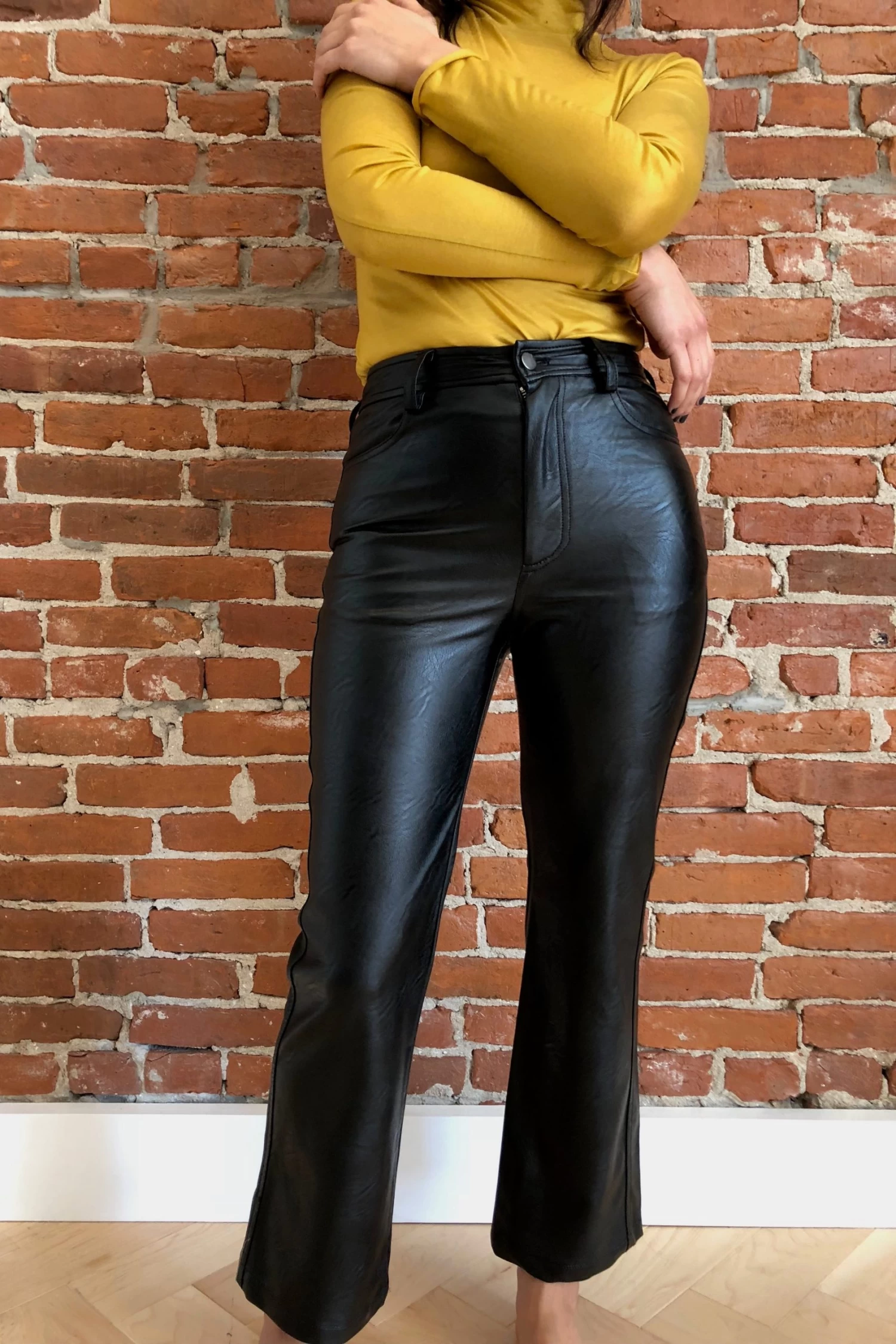 High-waisted straight leg trouser in a slick black faux leather. Pockets on each side and two back pockets. Button and zip closure with belt loops around the waist.