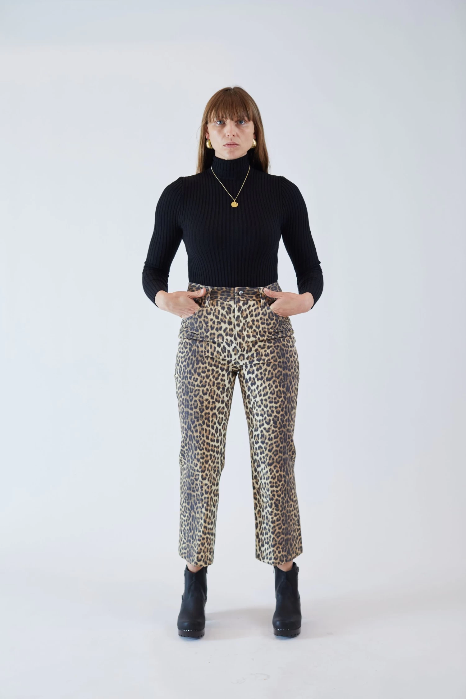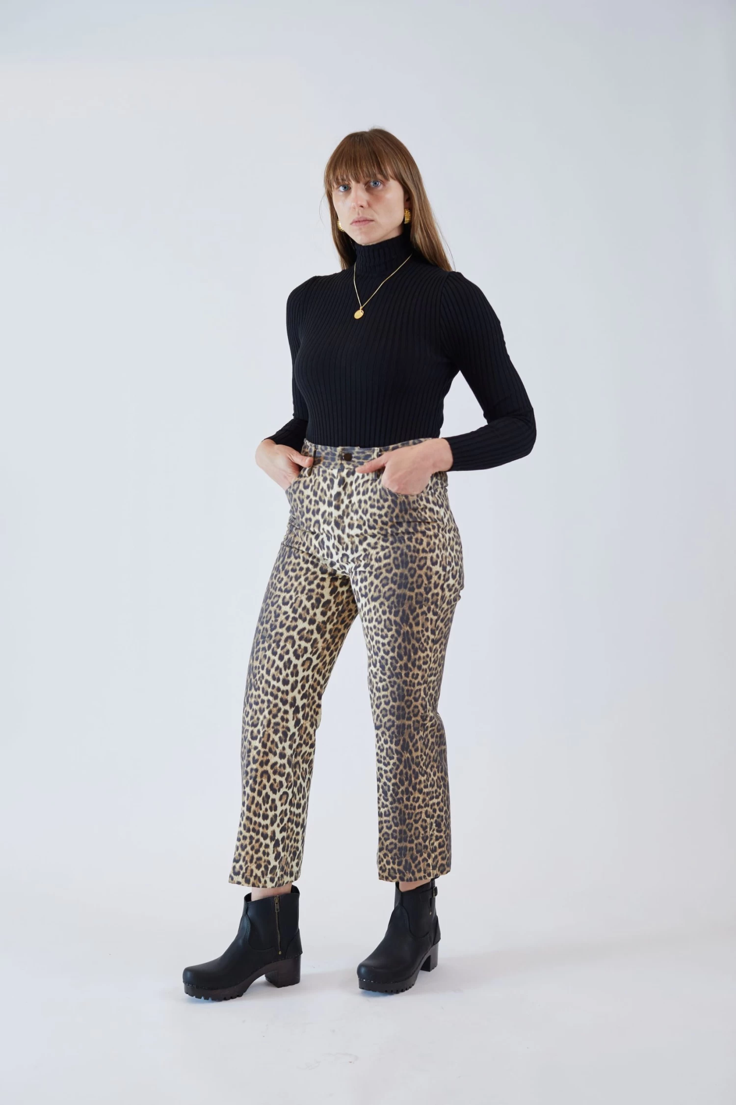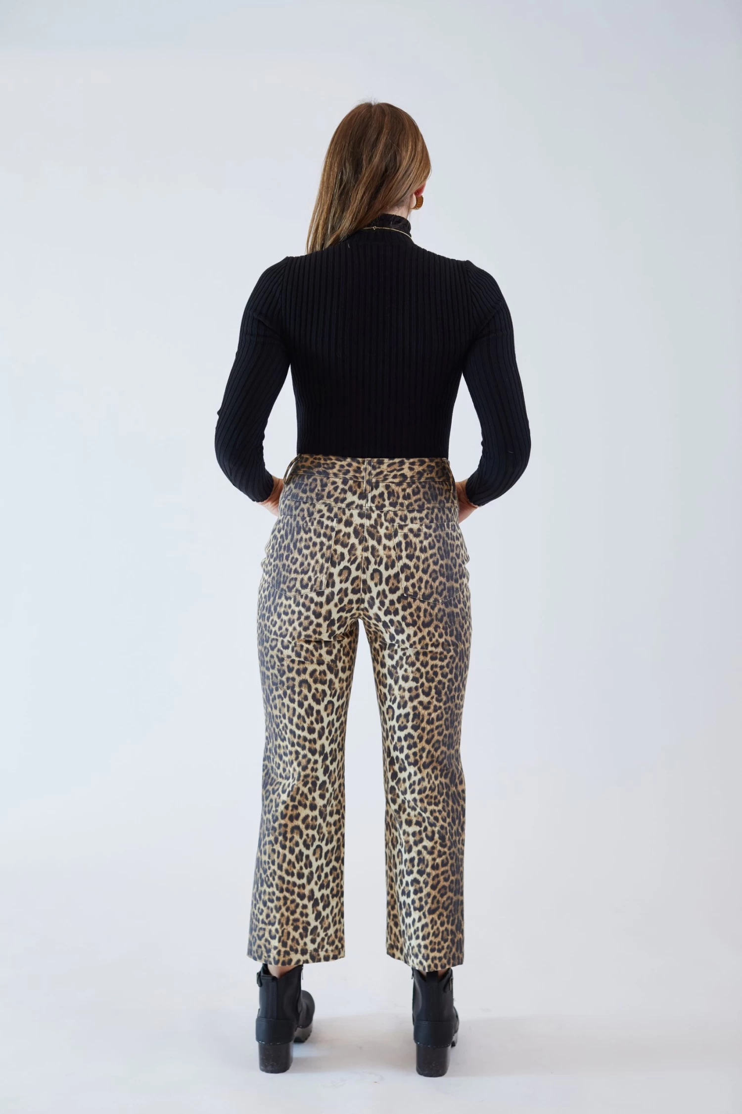 Updated 5 pocket jean cut in a leopard canvas. Cropped leg, slight flare at bottom. Button and zip fly closure.