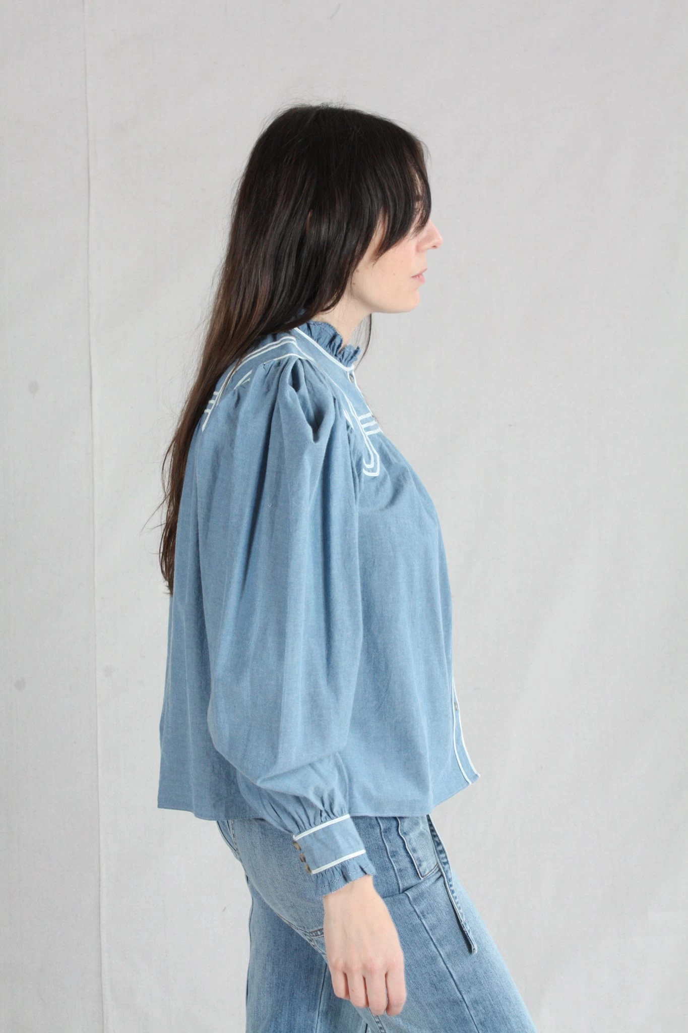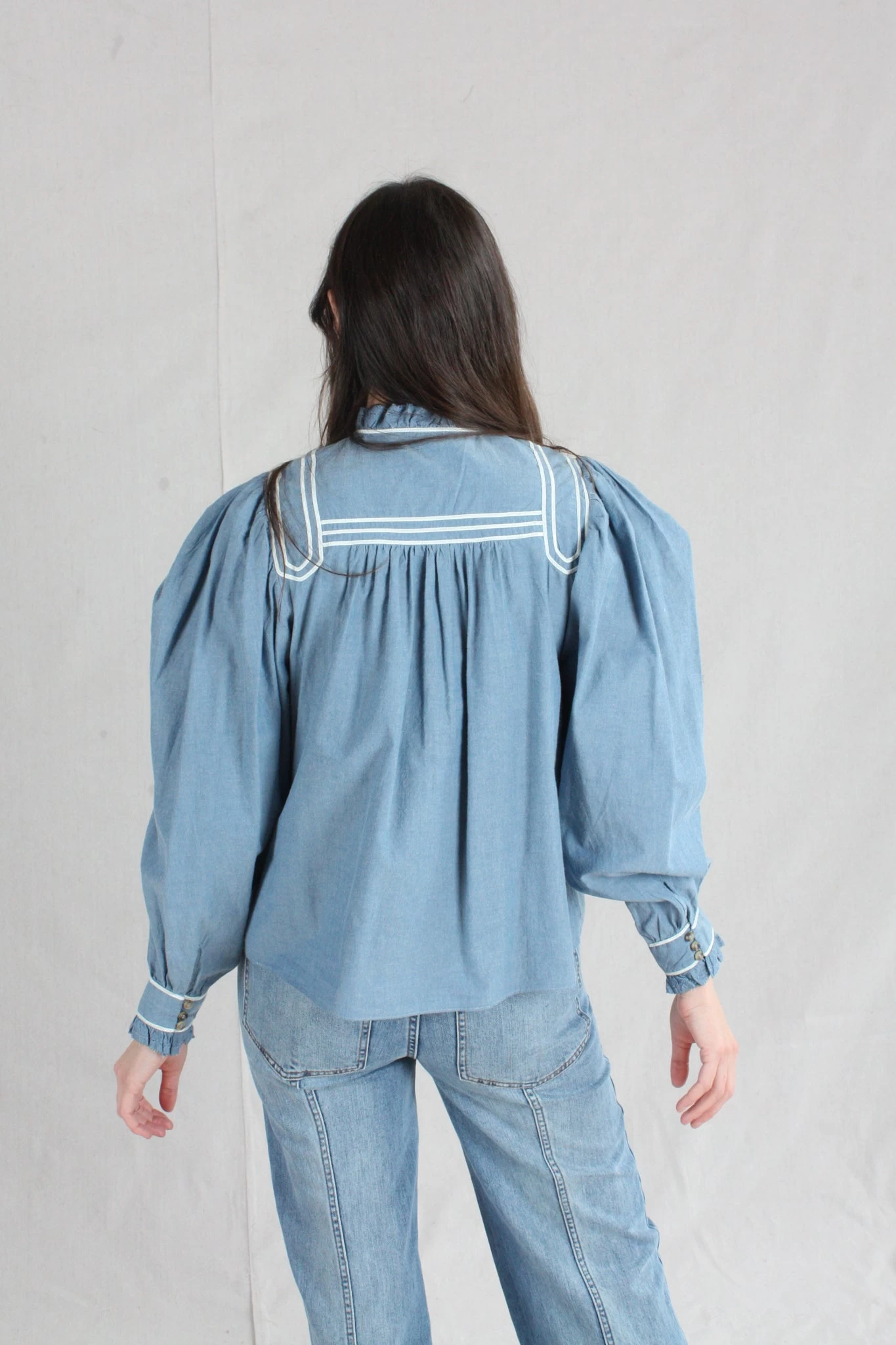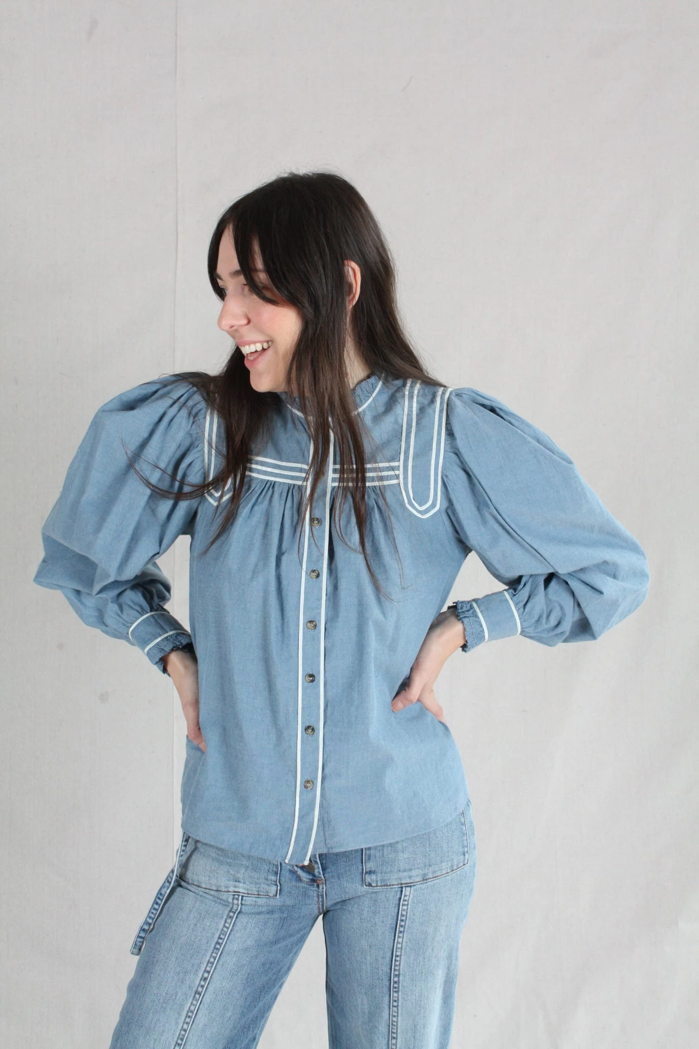 The Abigail Blouse is a button-down with a stand-up ruffle collar, full cuffed sleeves and straight across yoke with a lightly gathered bodice. Cut in a lightweight chambray and detailed with contrast velvet trim. This blouse is unlined.
