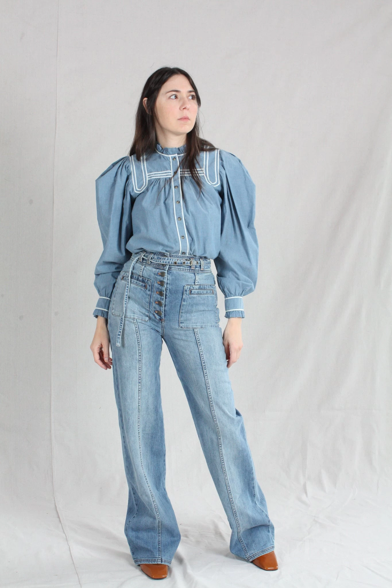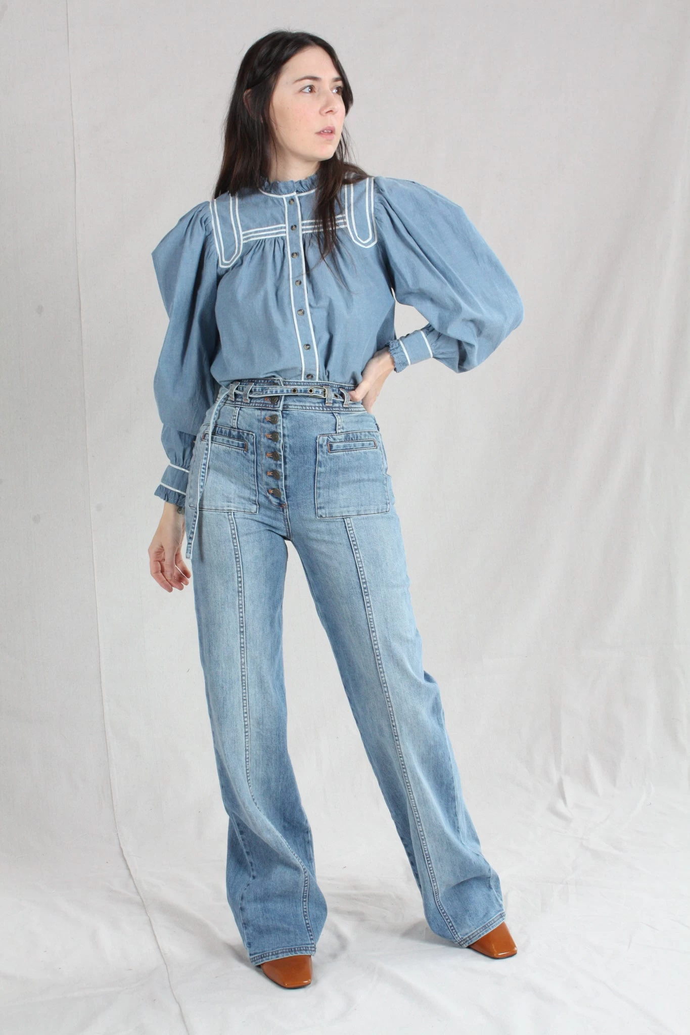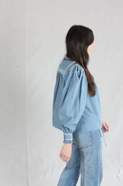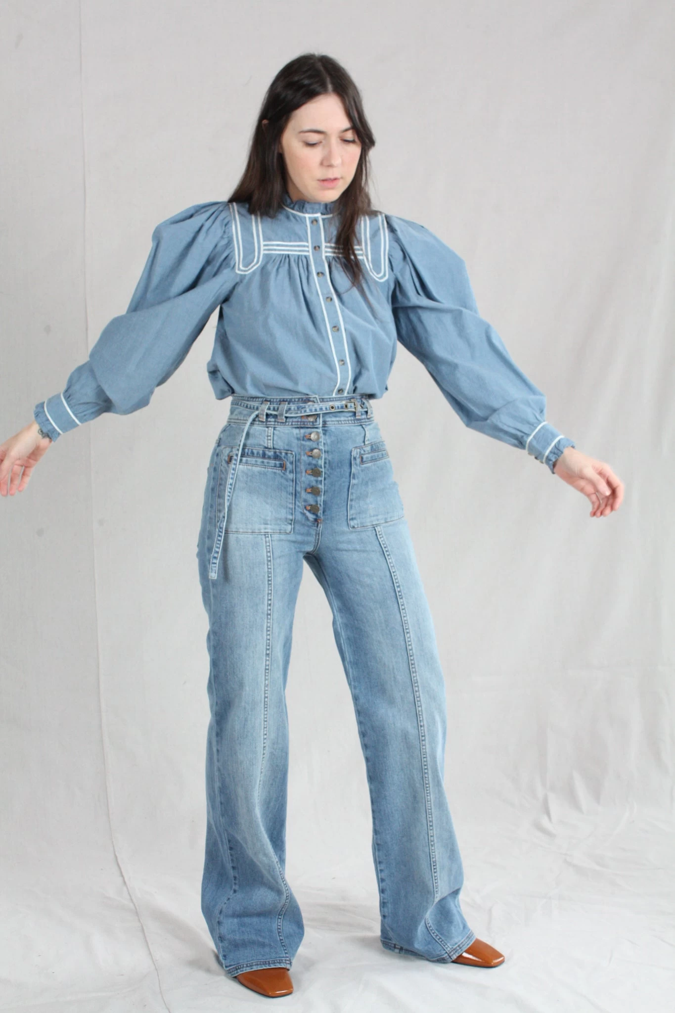The Abigail Blouse is a button-down with a stand-up ruffle collar, full cuffed sleeves and straight across yoke with a lightly gathered bodice. Cut in a lightweight chambray and detailed with contrast velvet trim. This blouse is unlined.