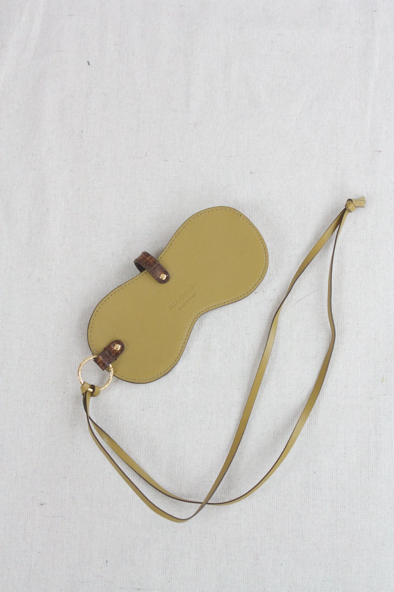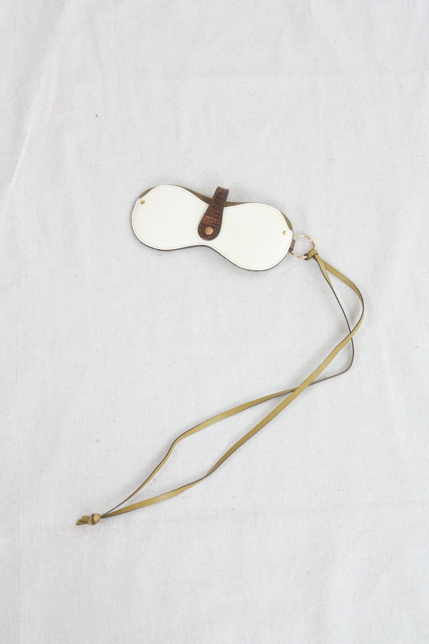 The Alvie Sunglasses Case is cut in soft color block embossed leather, finished with tonal suede lining. A perfect bridge of beauty and functionality, this sunglass case features clean, round lines and is suspended from a sleek leather strap attached with an antique brass ring.Â