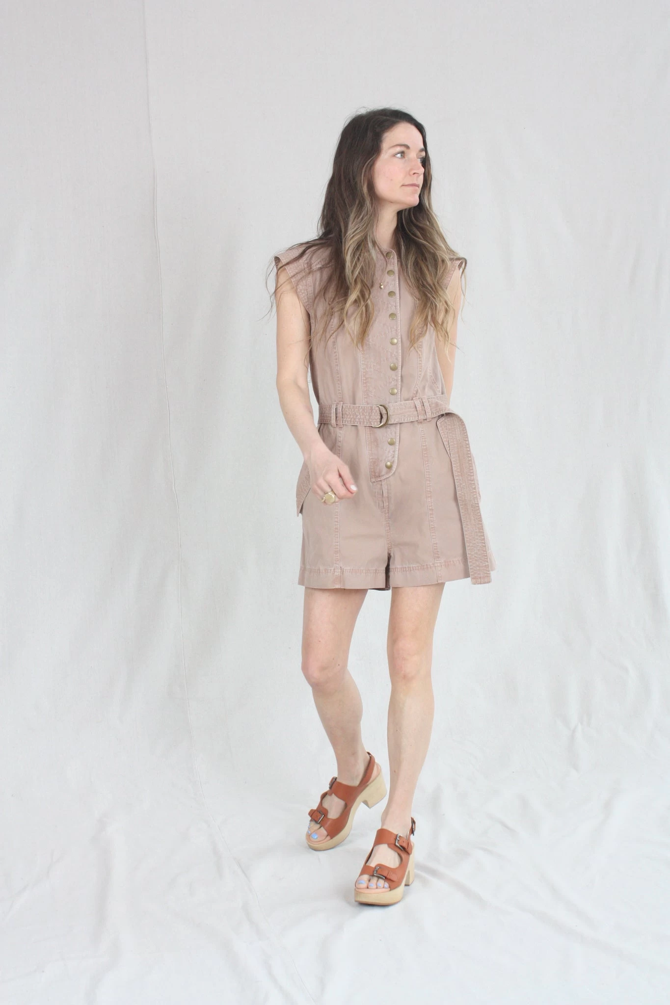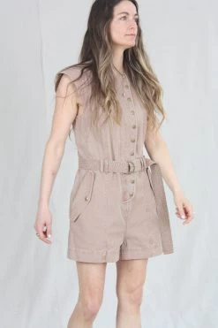 The Briar Romper is cut from garment washed utility cotton in a faded shade of brown. This cropped jumpsuit has loose-fitting leg openings, snap buttons, expandable waist and architectural sleeve openings for a flattering fit. The belt is removable and finished with an antique brass D-ring.