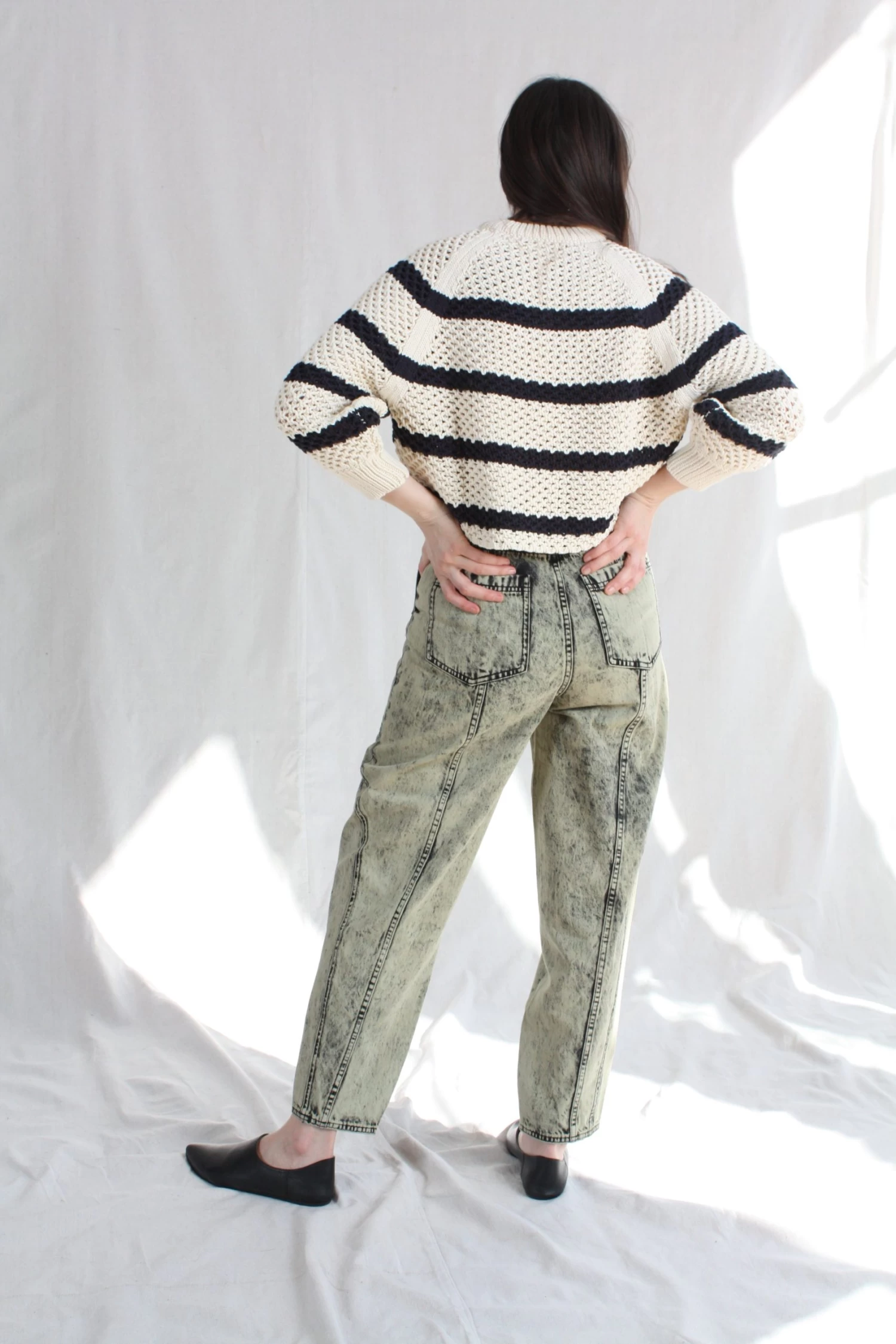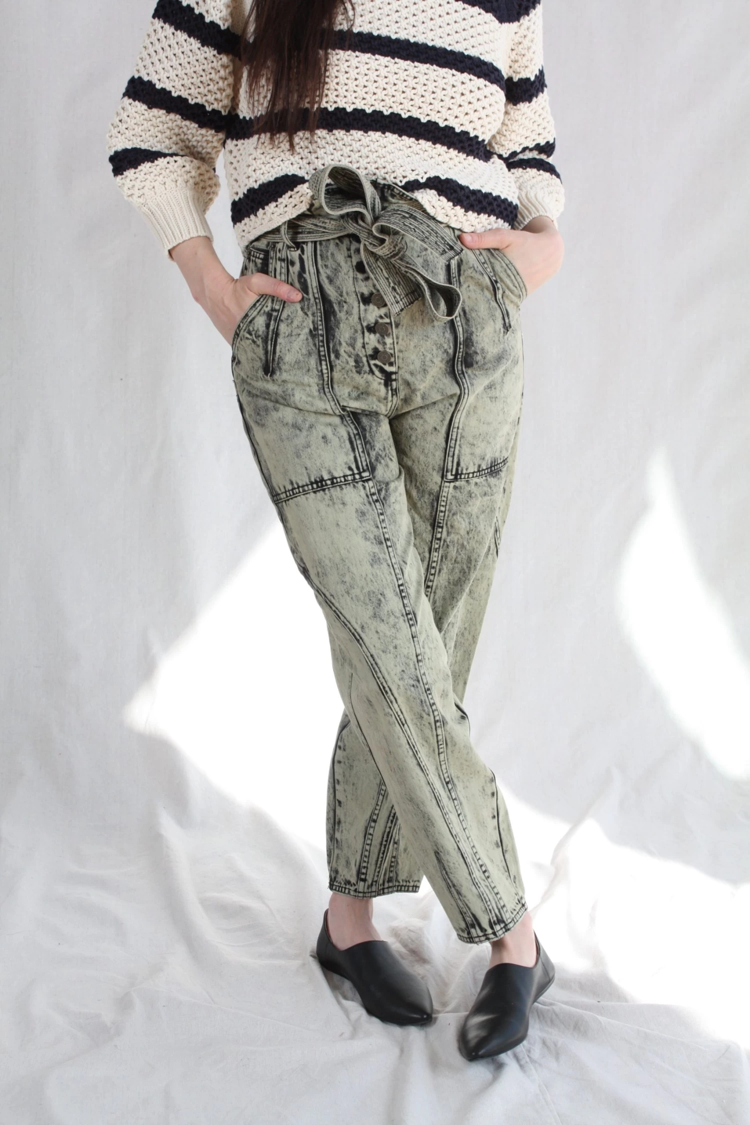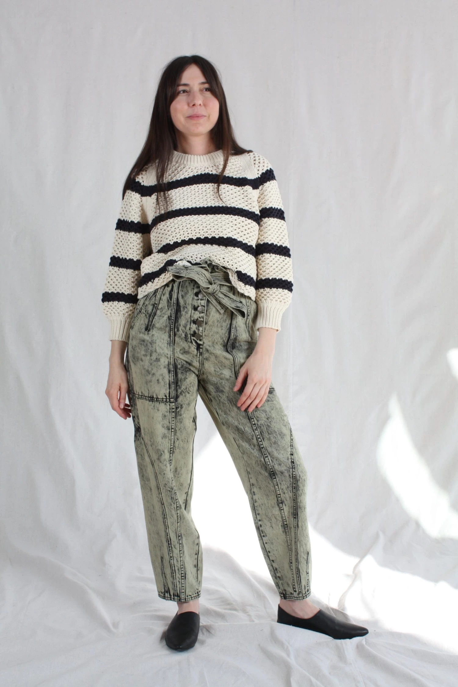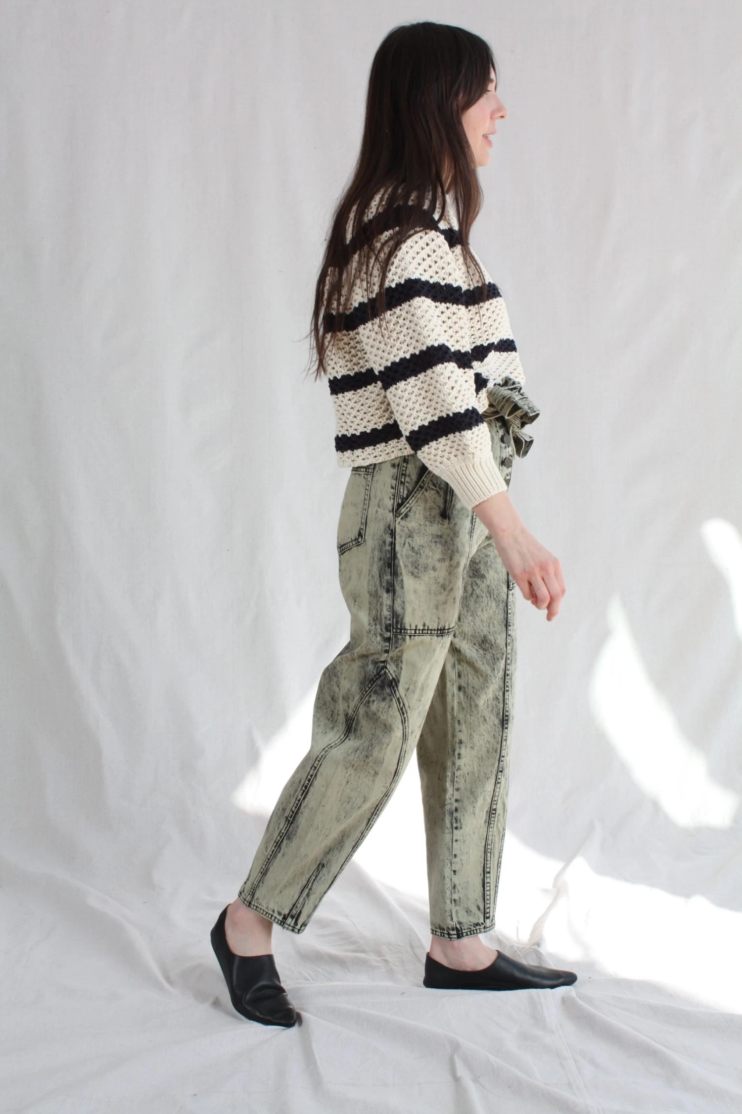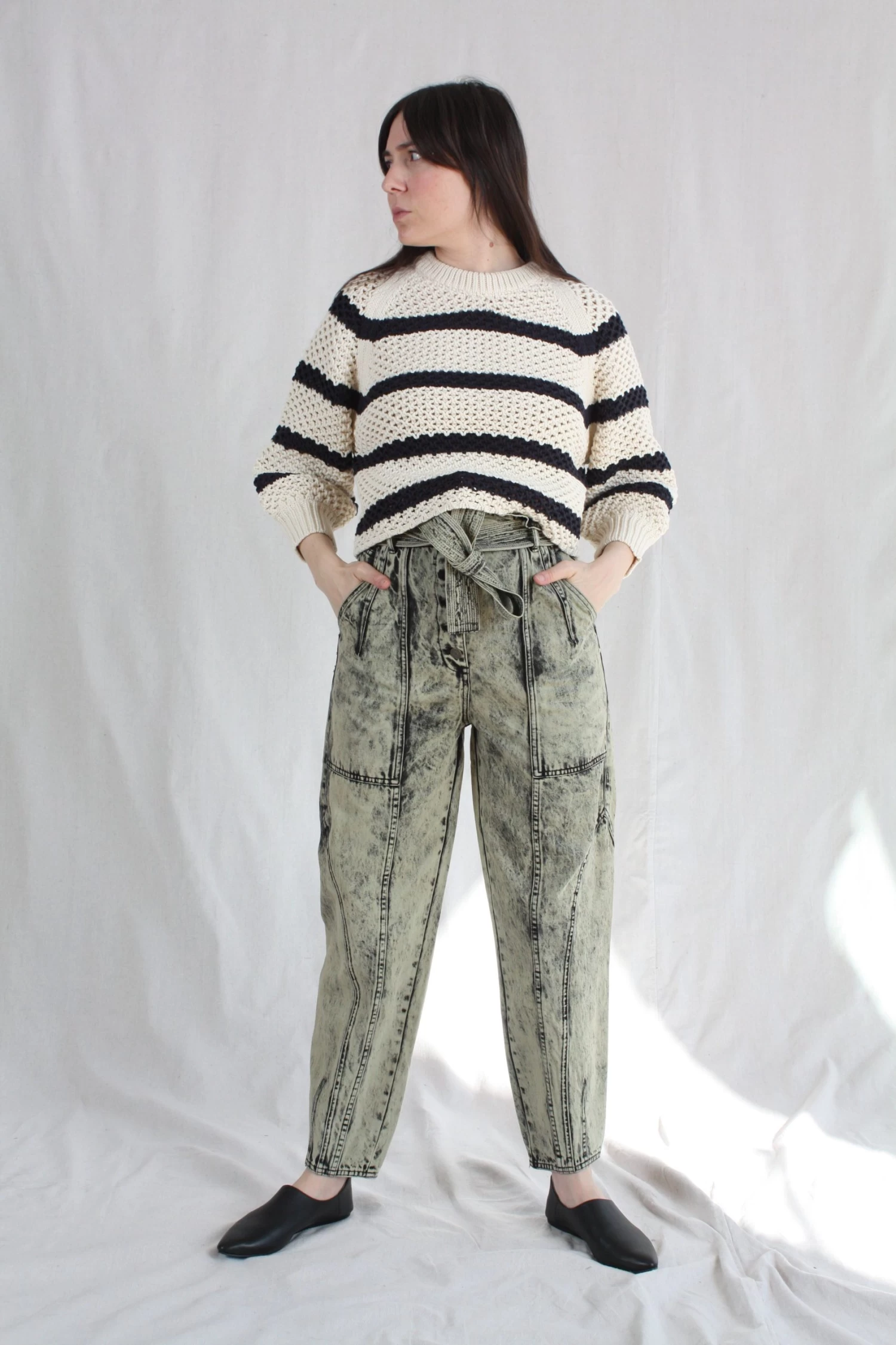 The Brier Jean in a pale mint acid wash denim is a familiar shape, with an Ulla Johnson signature tapered leg and belted high-waist.