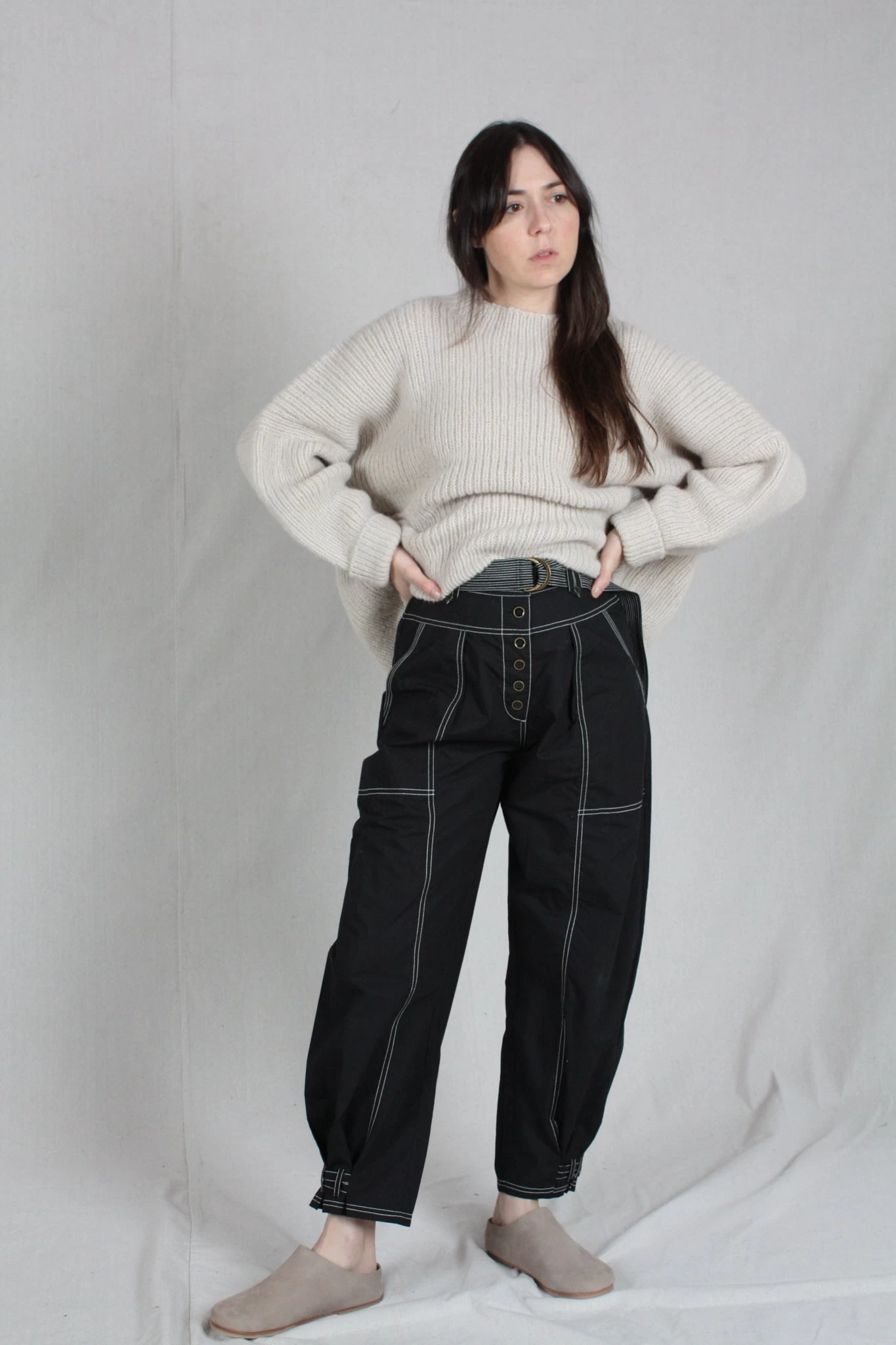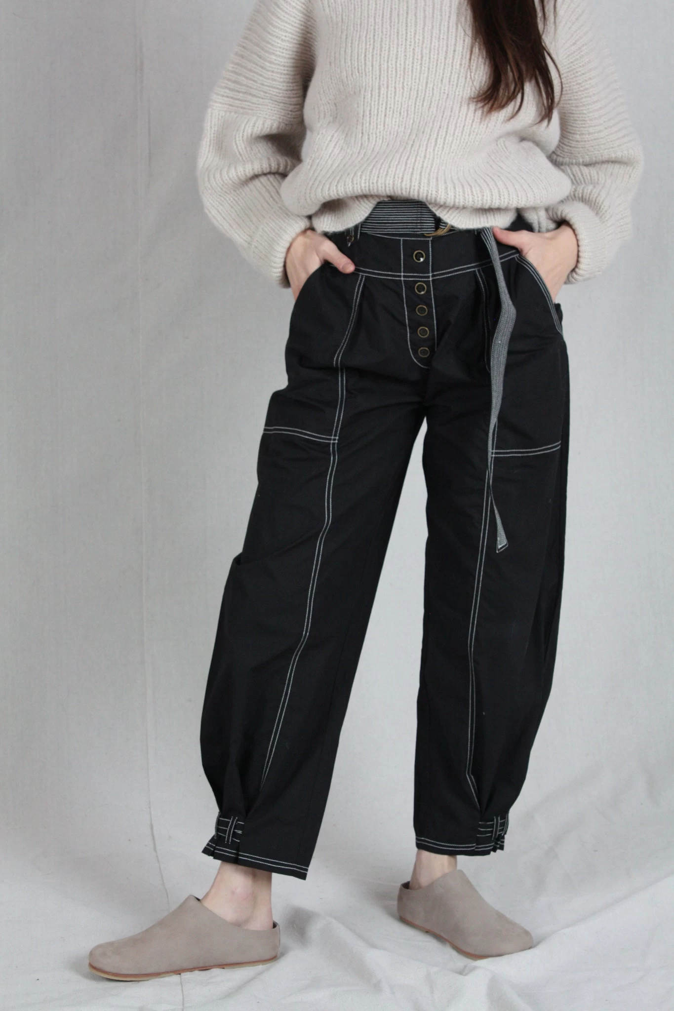 The Charline Pants are a seasonless staple, cut in a military poplin with a relaxed shape and high-waist silhouette. These trousers feature a buttoned fly, removable belt and side pockets. Â