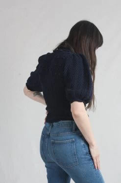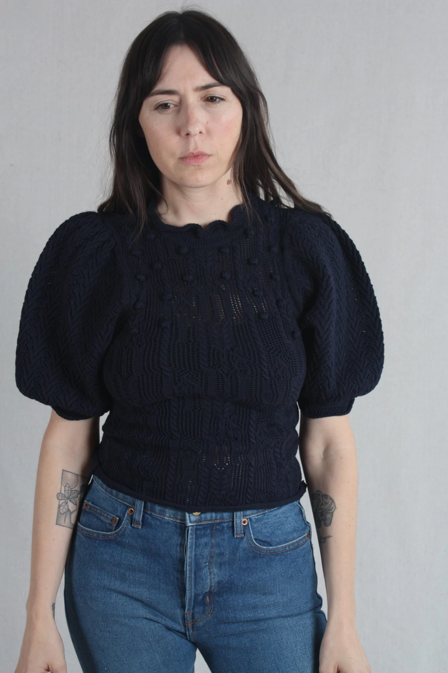 The Coralie Top in Midnight is made from lightweight pointellle-knit with a feminine puff sleeve top. Trimmed with a scalloped neckline and sleeve cuffs, this top features small baubles adorning the yoke to create an intricate texture.Â