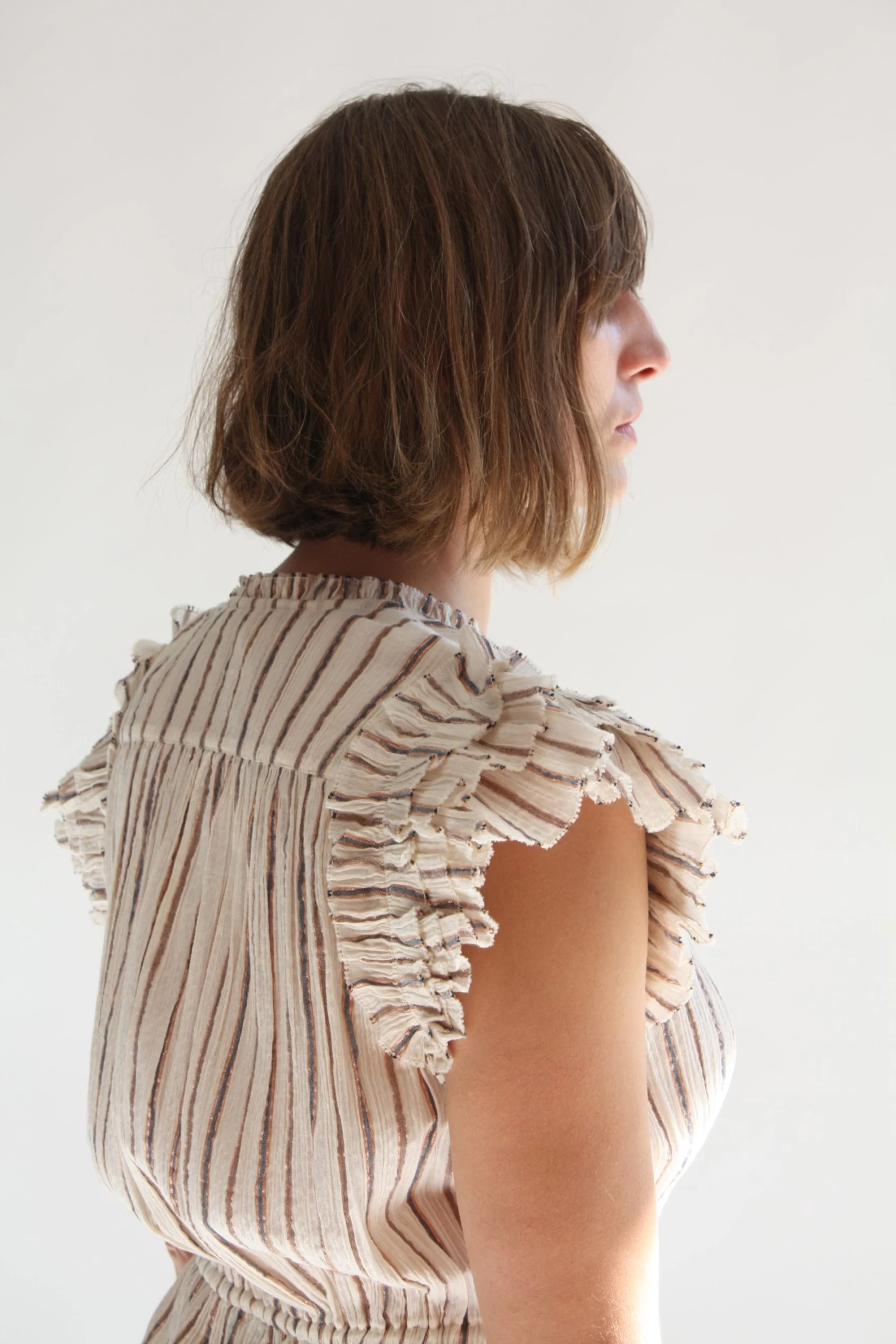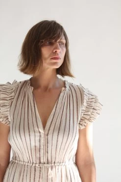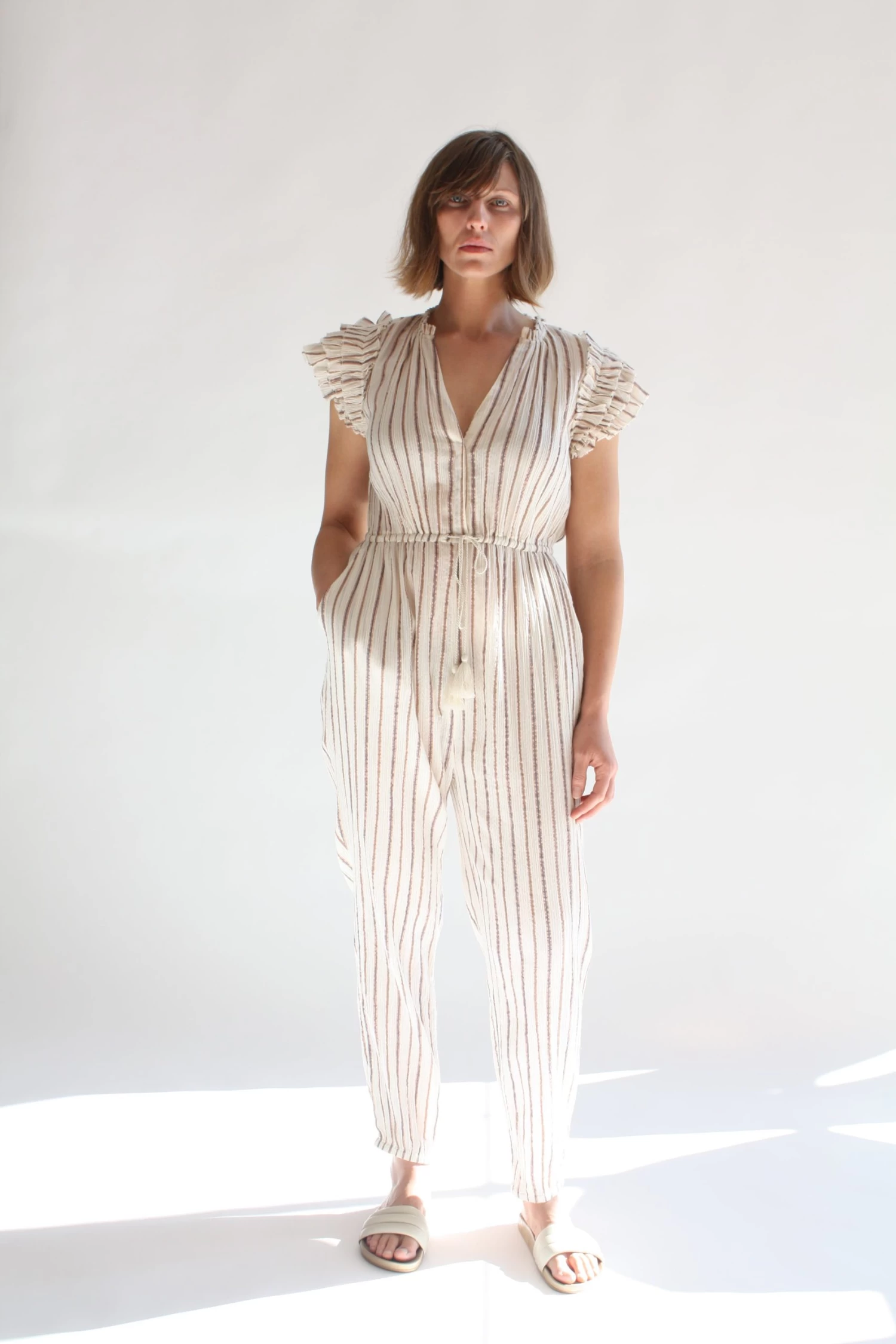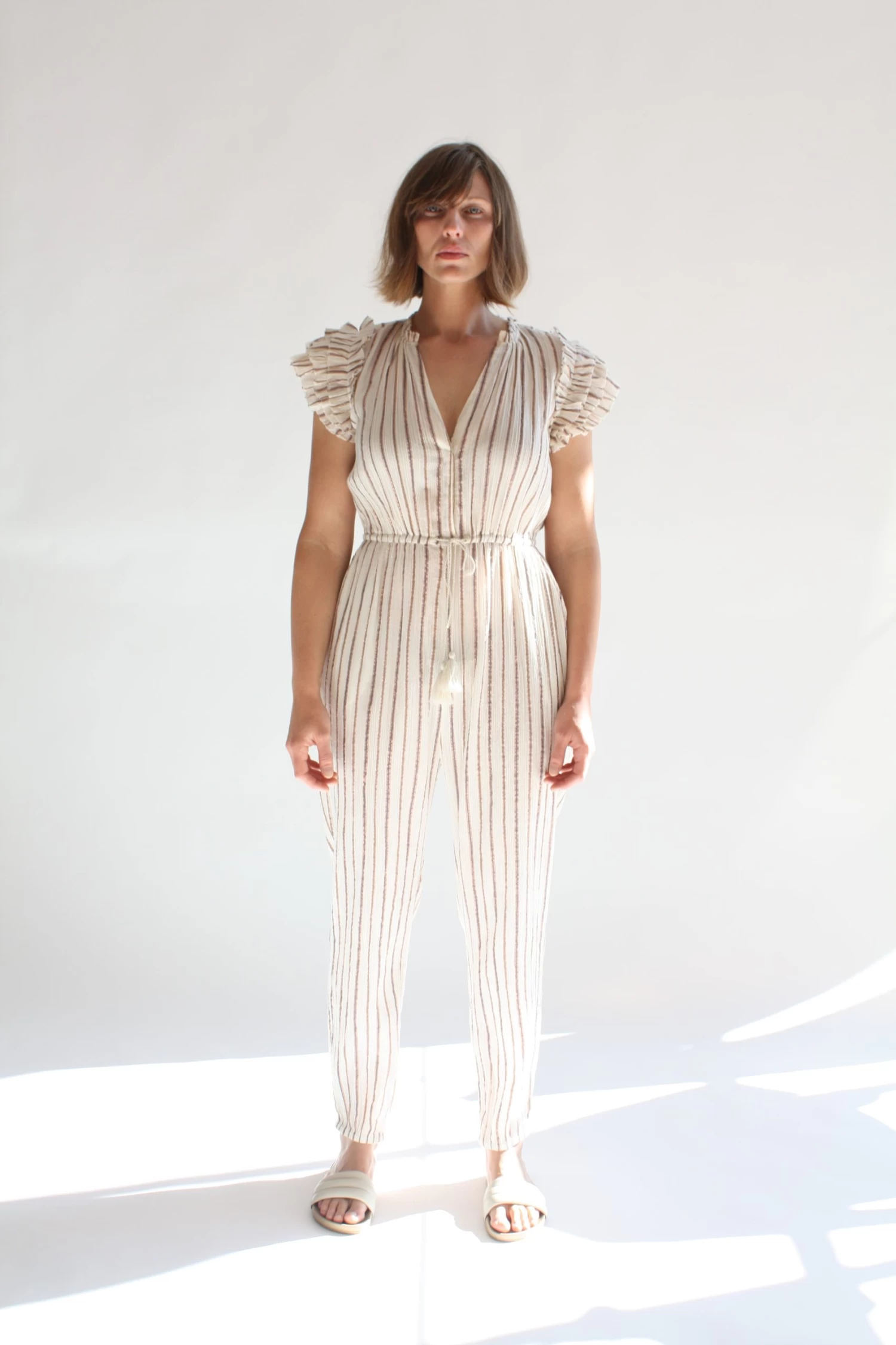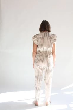 The Elio Jumpsuit is crafted from our lurex striped crinkle cotton gauze. Full length style featuring an open neckline.