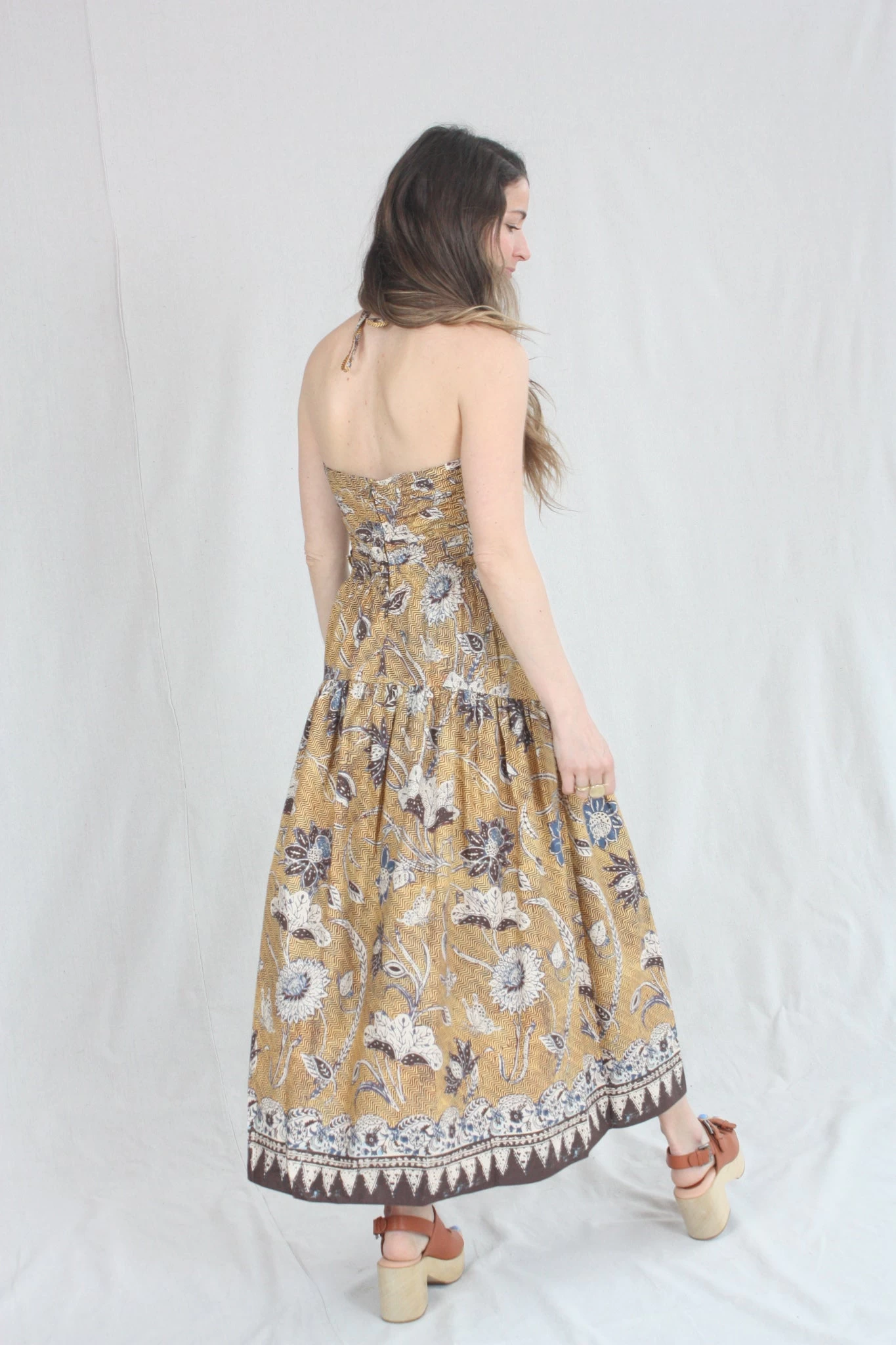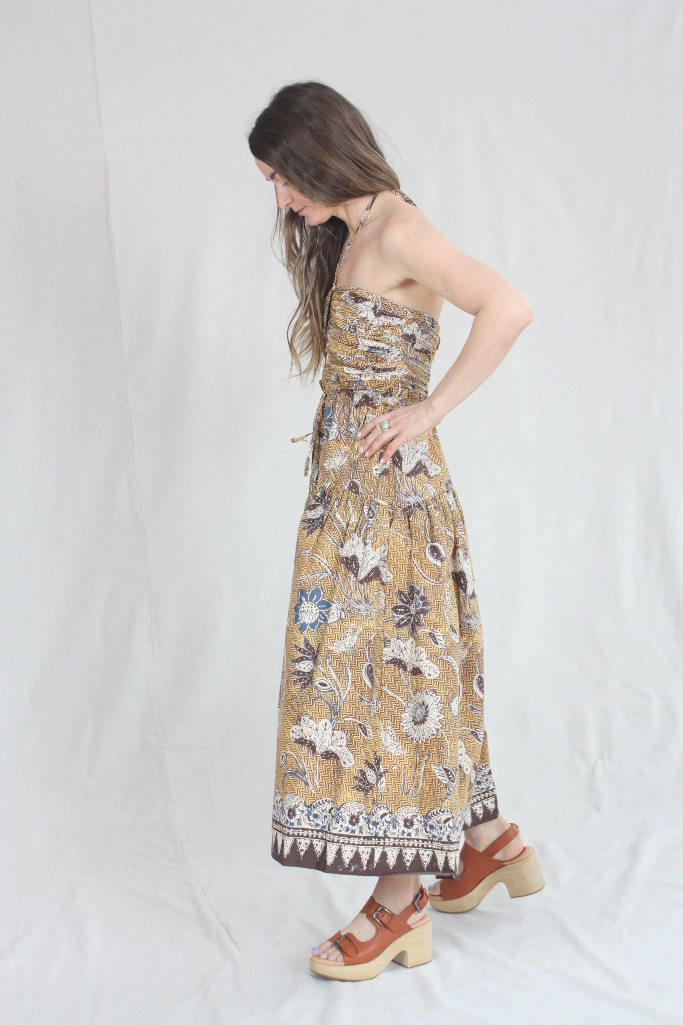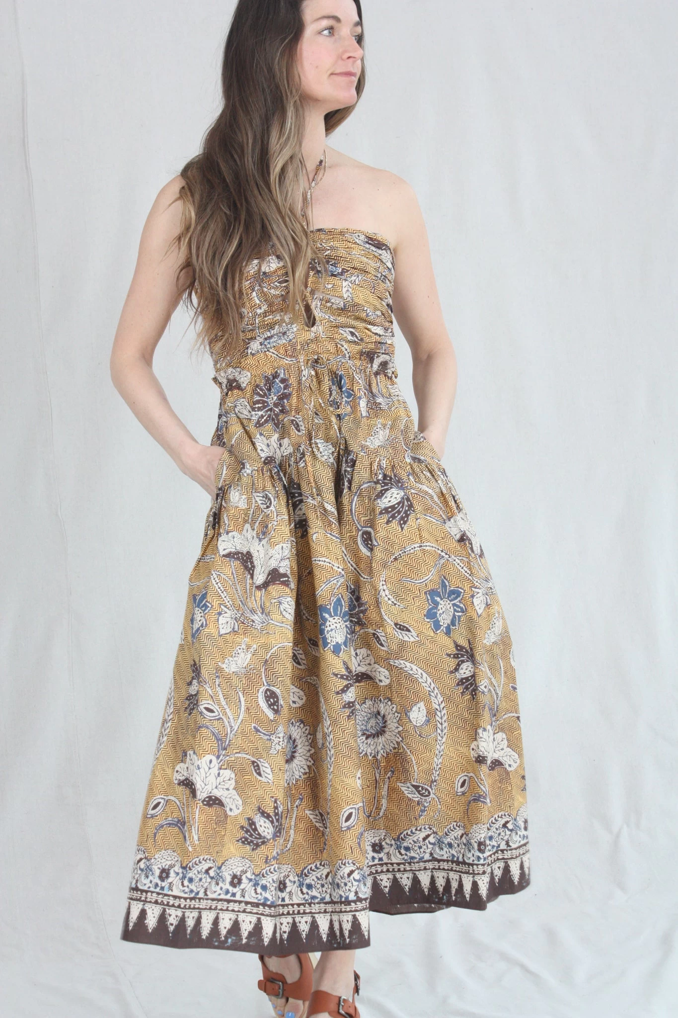 The Ella midi dress is inspired by body-skimming swimwear, designed with a ruched bodice featuring keyhole openings at its center. This corset-style top is balanced out by a full gathered skirt. This dress features a fixed waist, back zip closure and hidden side-seam pockets.