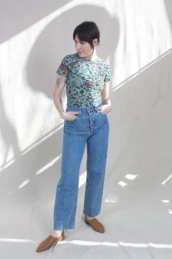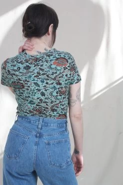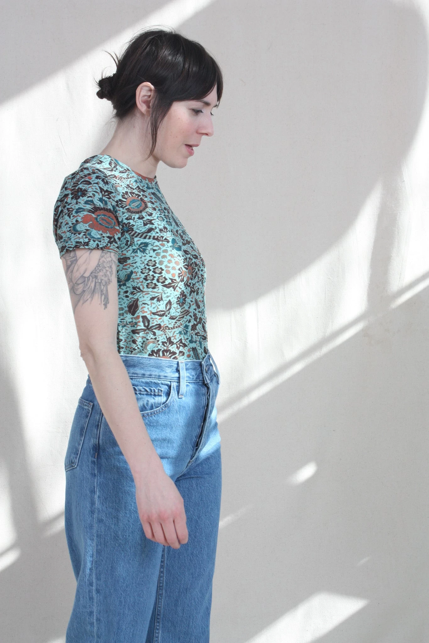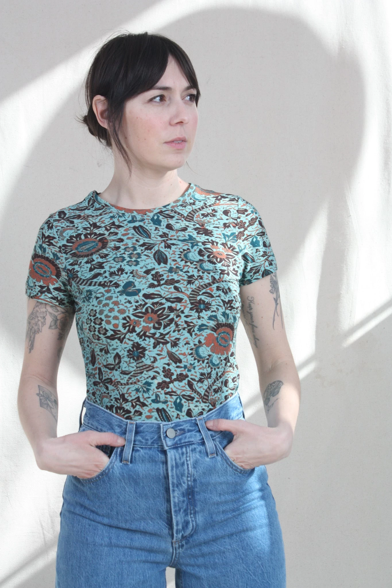 This short sleeve top is meant to fit close to the body, designed with a simple crewneck and fitted sleeves. Cut in a tissue-thin cotton jersey fabric jade floral print.Â