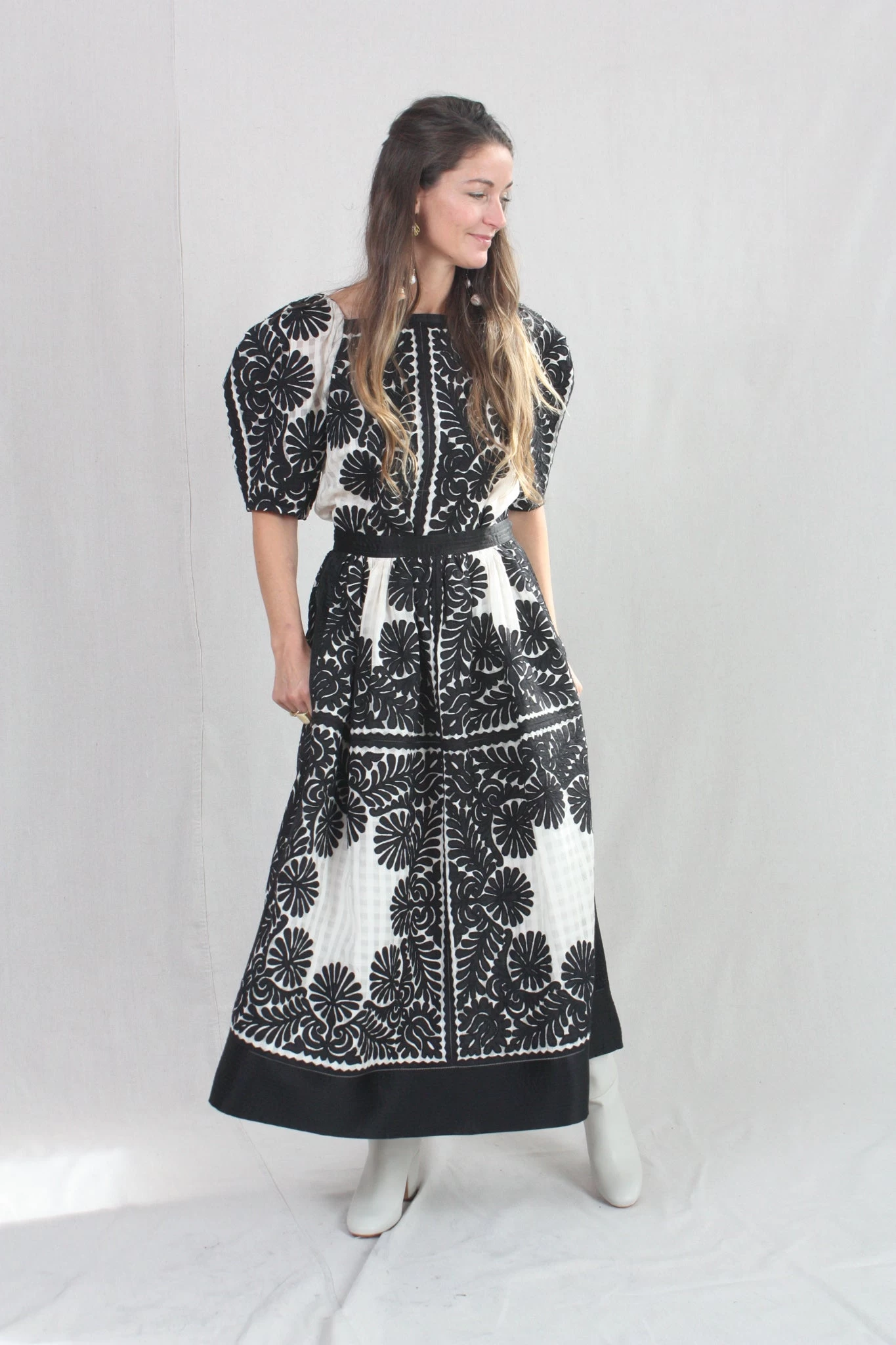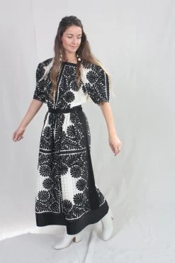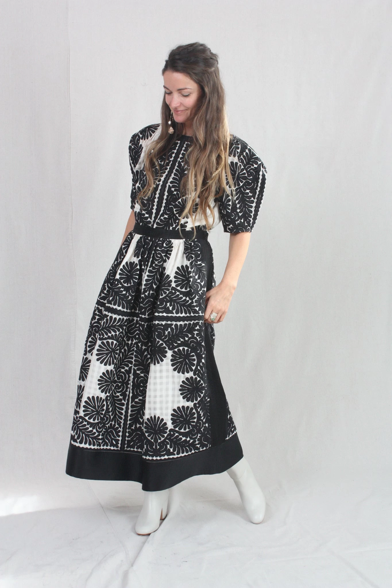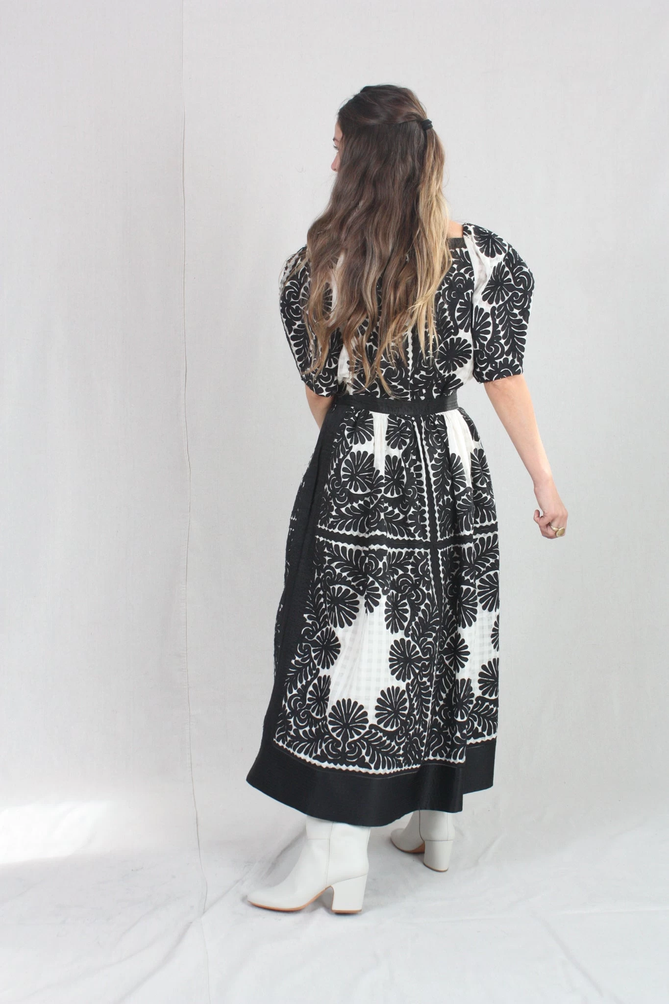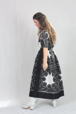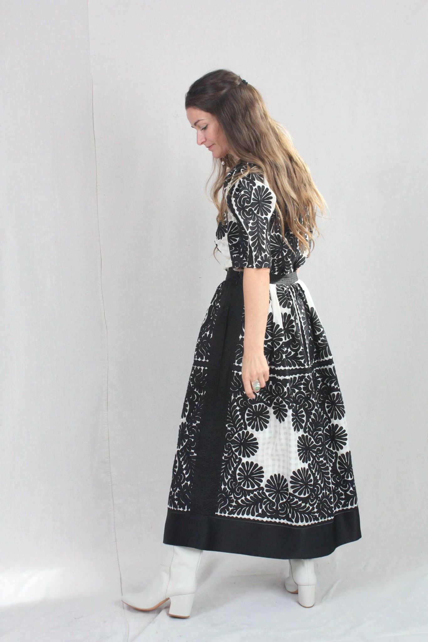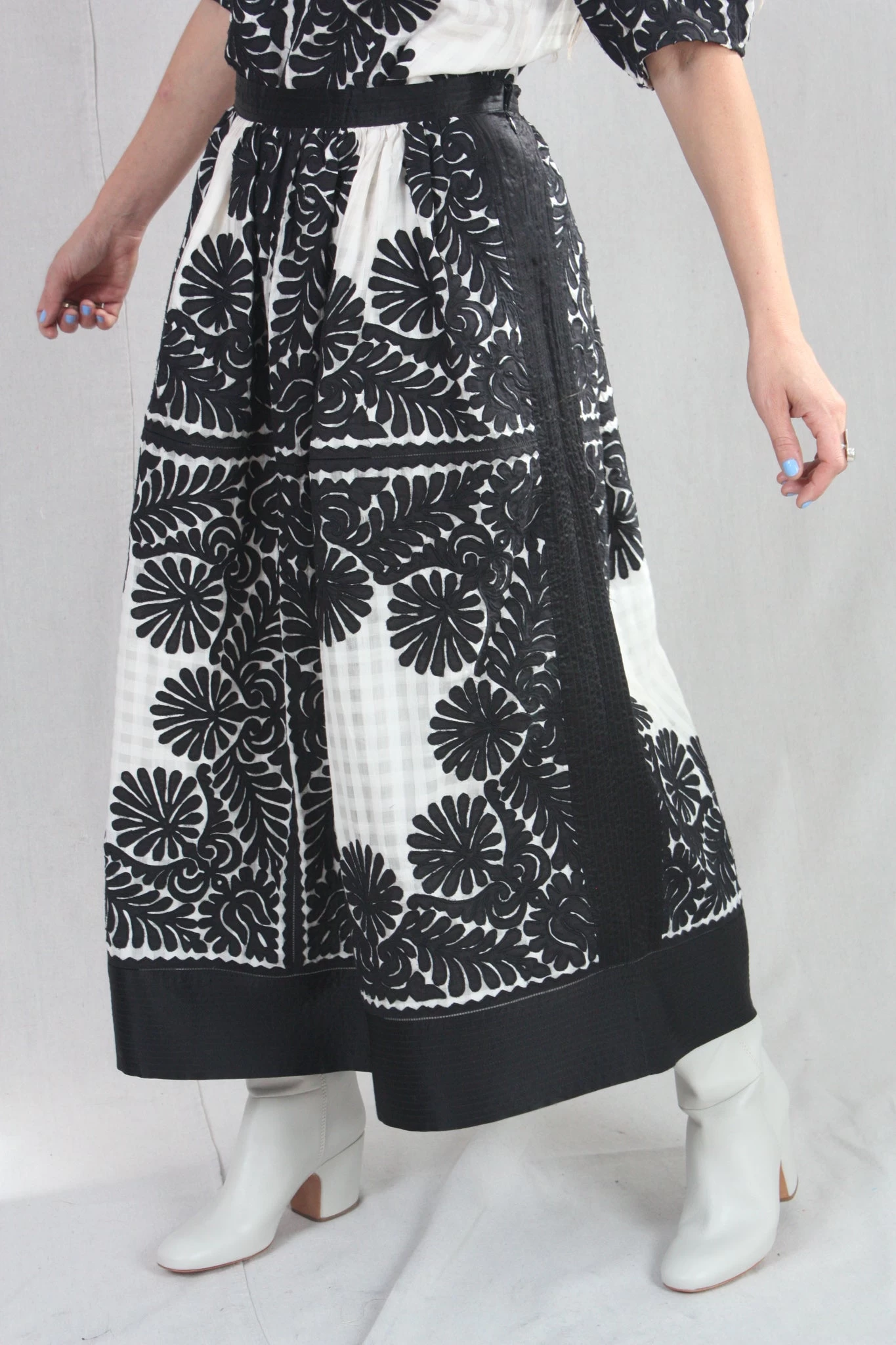 The Francesca Skirt is defined by its sense of delicacy and enhanced by the positive and negative balance of the contrasting shades of black against white. This hand-crafted fabric is made with a custom sheer gingham base and traced with intricate floral motifs that are thoughtfully placed along its a-line silhouette. This skirt, both lightweight yet dominant, has a fixed waistband and side seam zip closure.