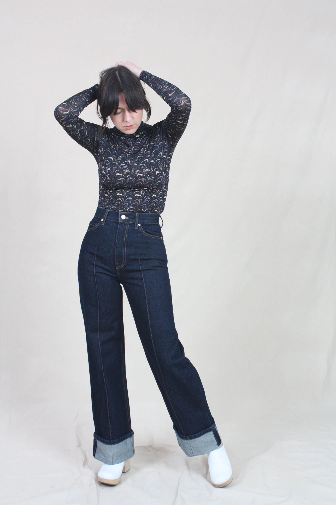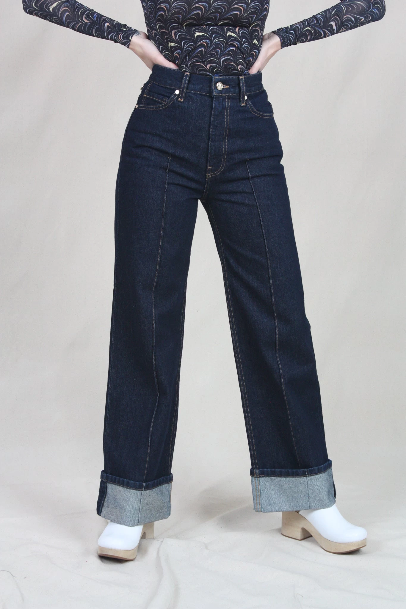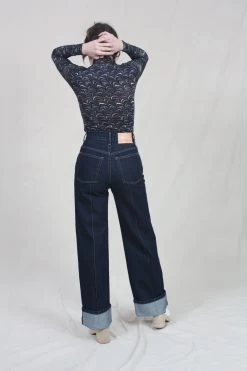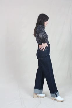 The Genevieve Jean is handmade in Los Angeles, this wide-leg silhouette features a high-waist, folded cuffs, and pintucks down the center front of each leg, arriving in deeply-hued Tigris. This jean is cut in non-stretch denim with a leather logo-embossed waistband patch and a hand-hammered ring attached to the back belt loop.