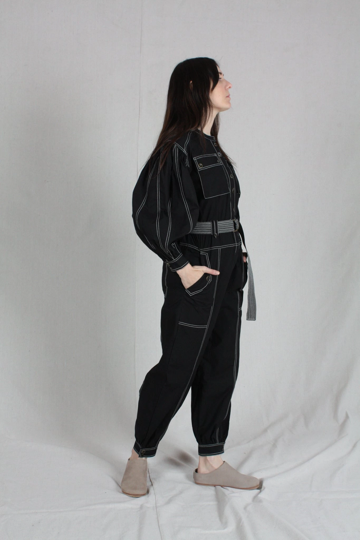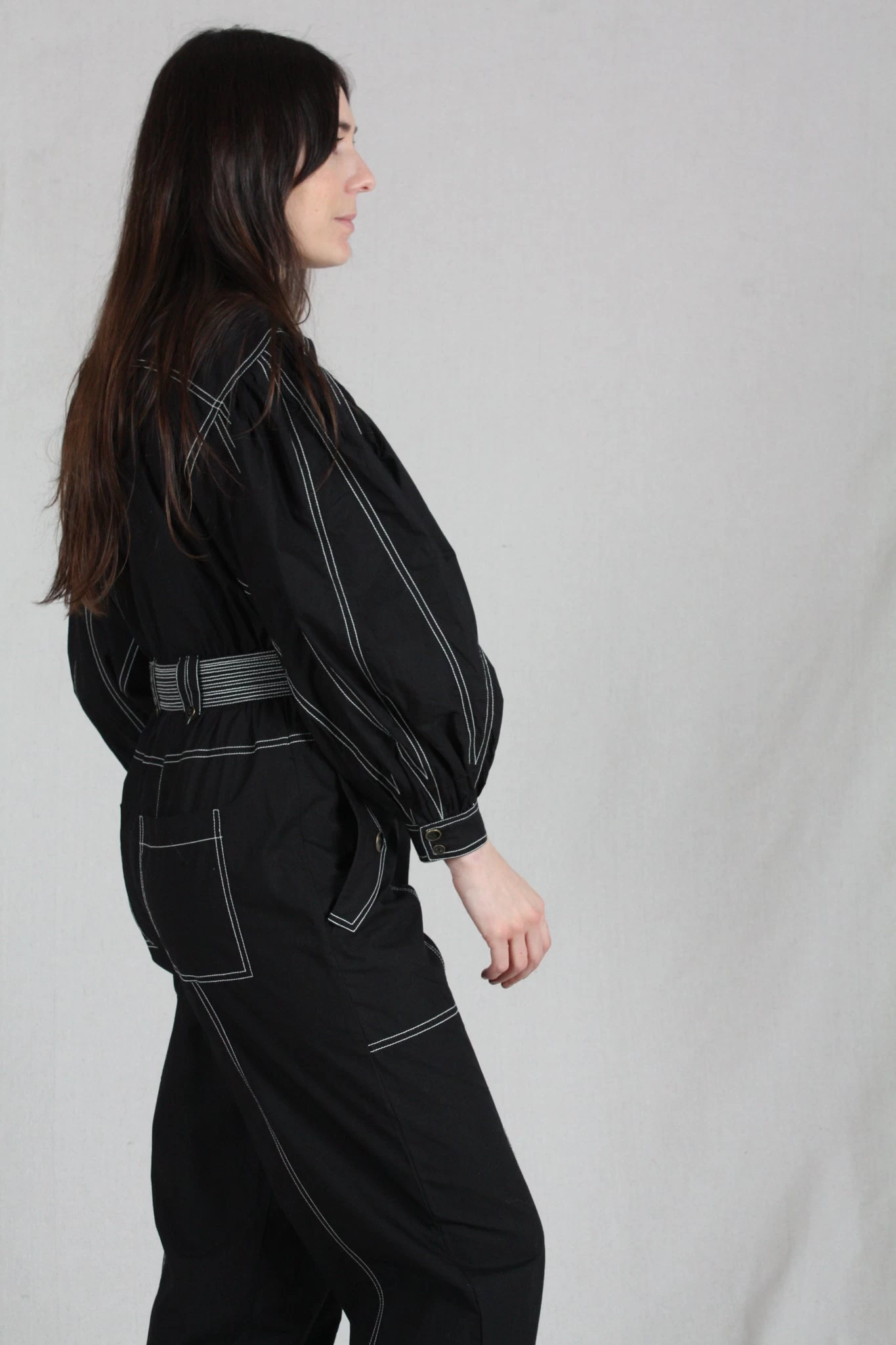 The Hattie Jumpsuit is cut in a military poplin and adorned with utilitarian details. This jumpsuit has a relaxed fit, with a removable belt atop an elastic waist and billowing sleeves finished with a buttoned cuff. Features a full buttoned placket down the center front.