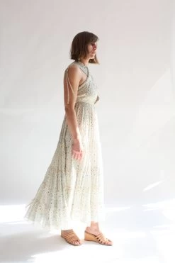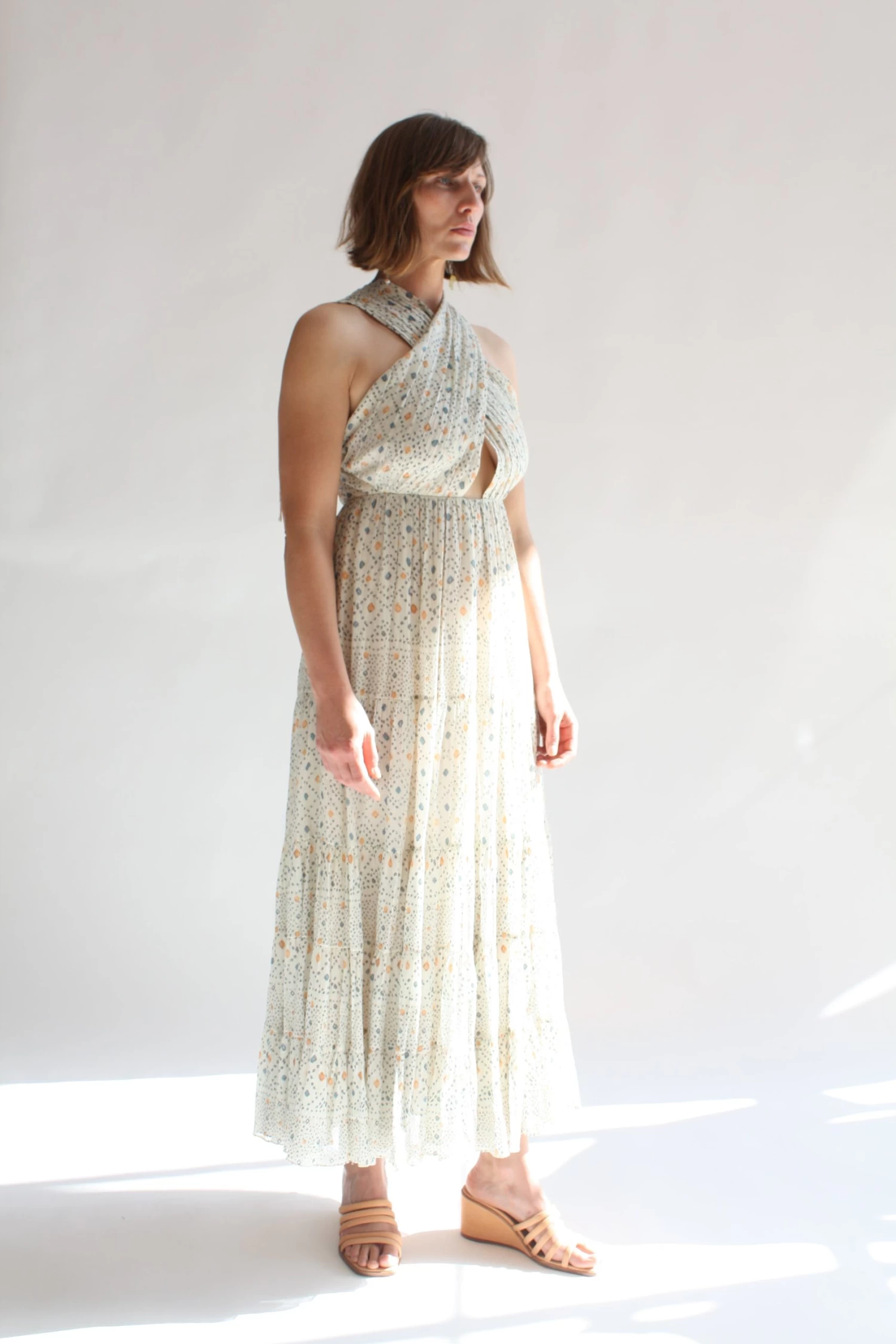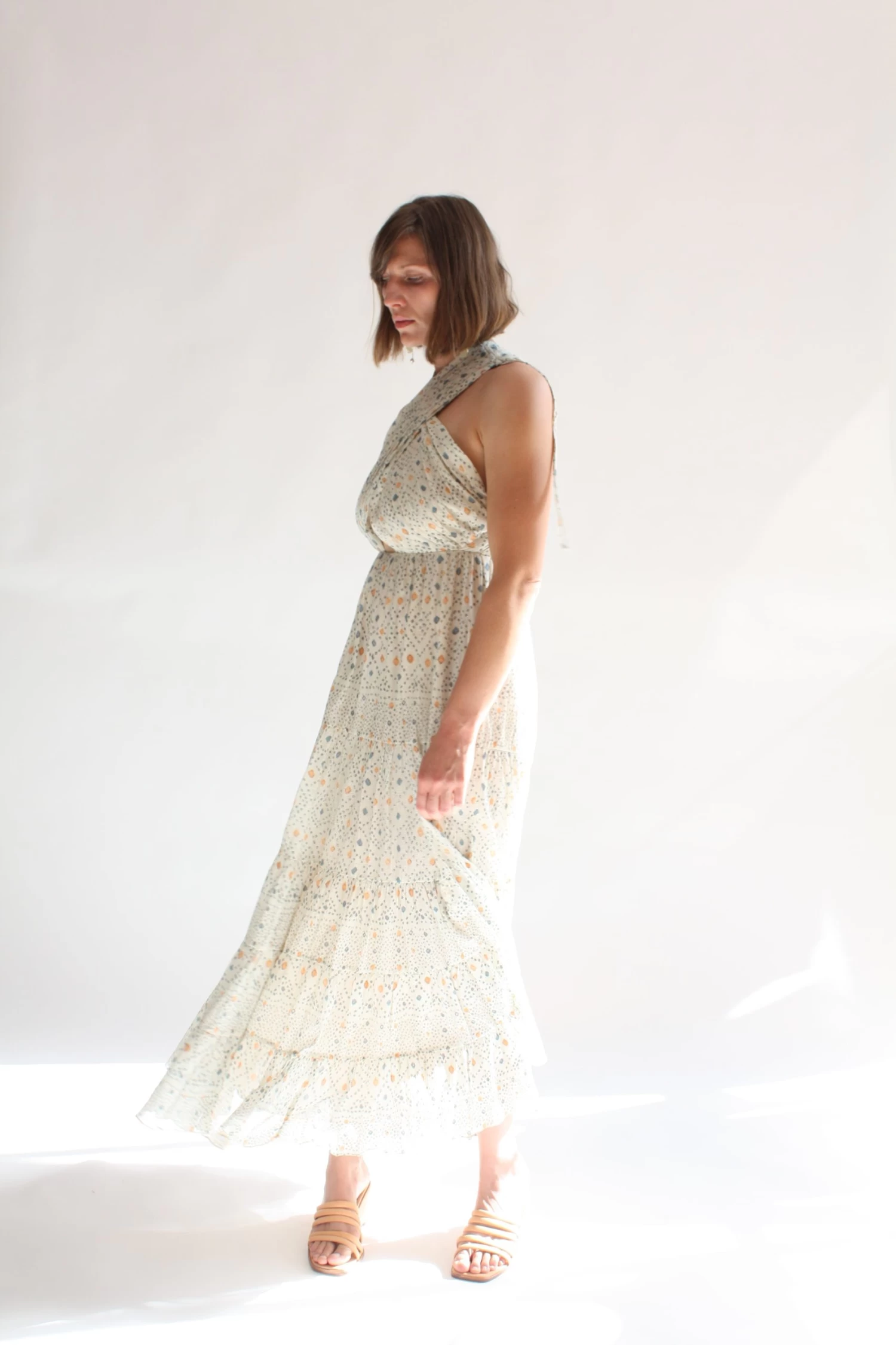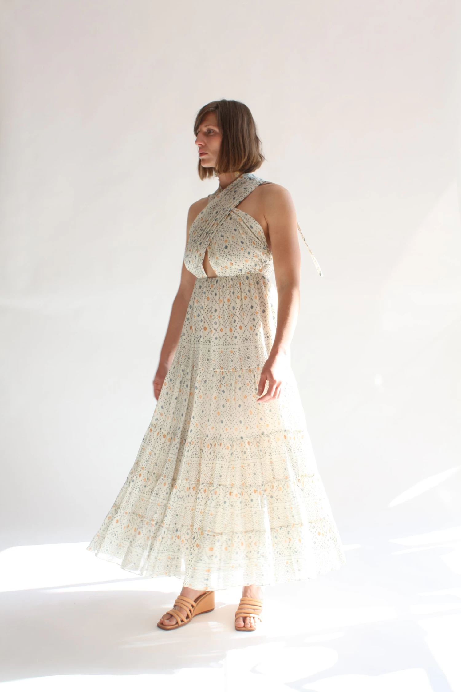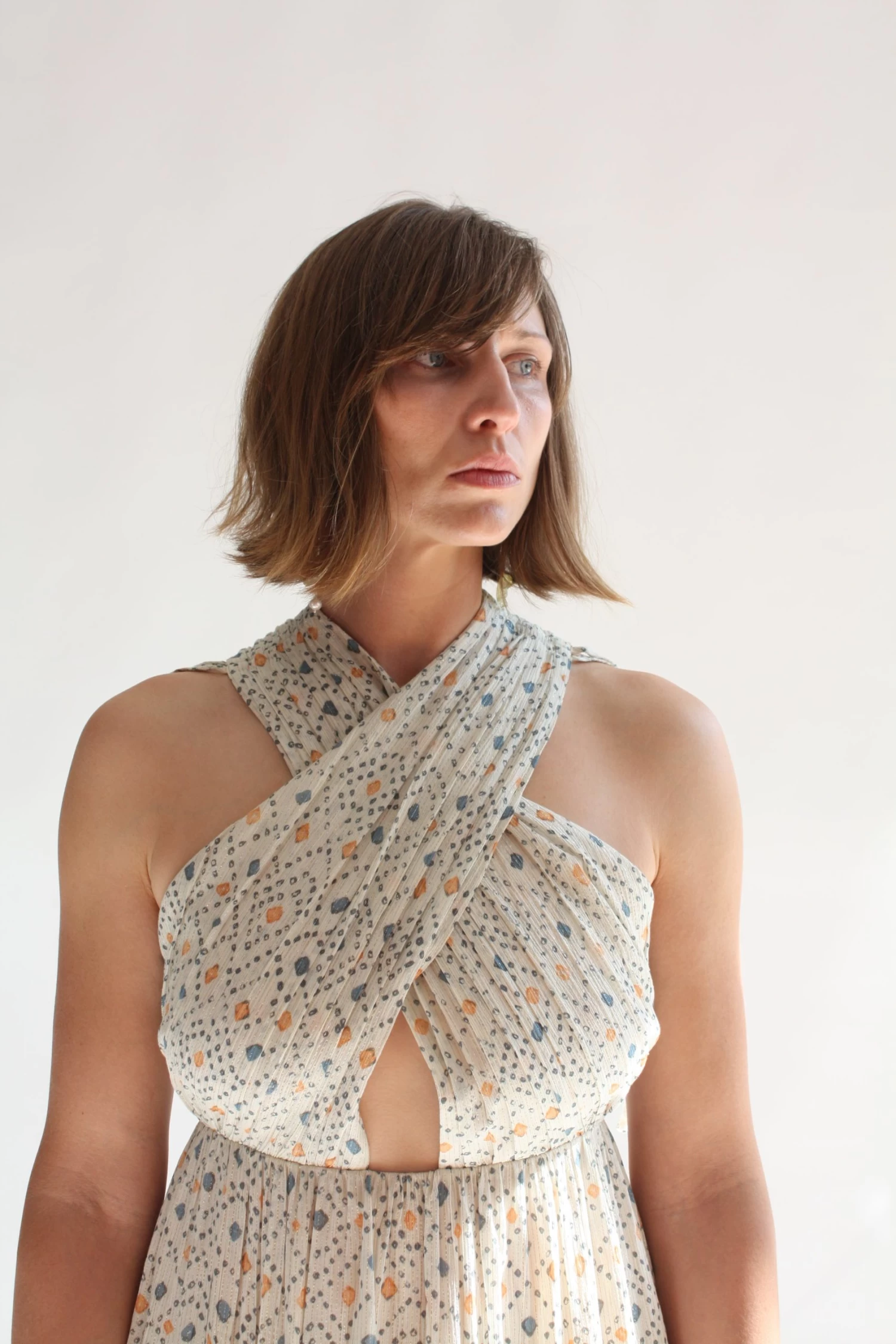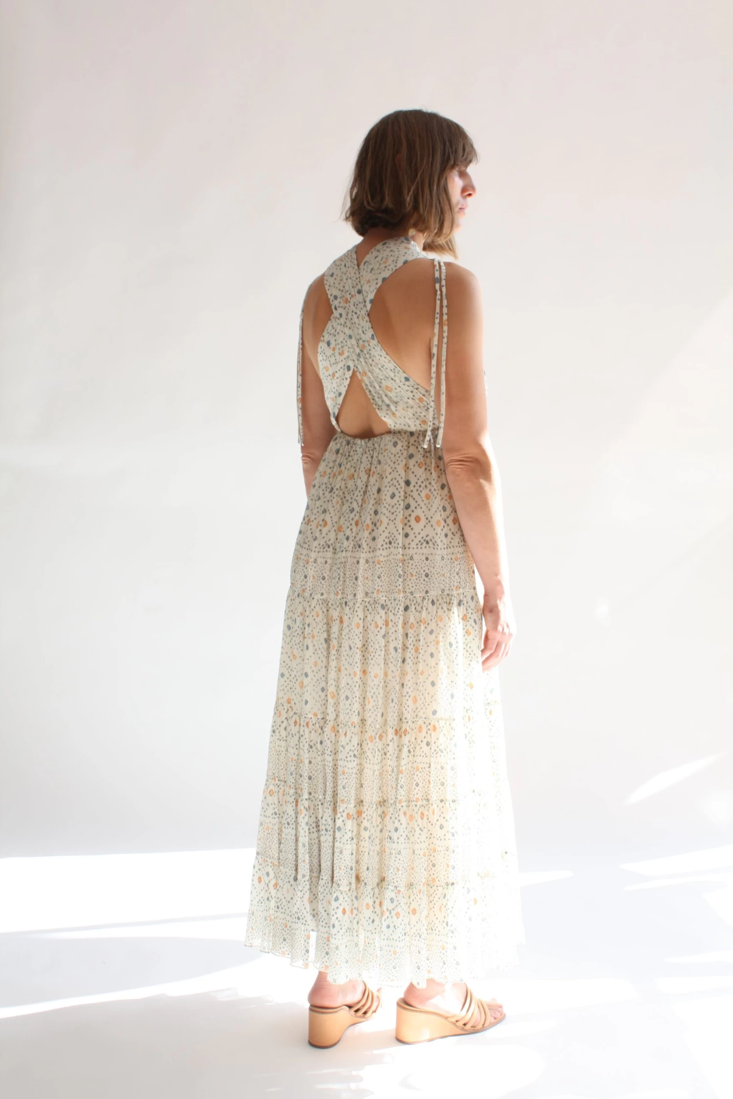 Crafted from Shibori printed crinkle cotton silk adorned with subtle striped lurex detailing. Full length style featuring a crisscross bodice with keyhole detail, tiered skirt, and feminine bow adornments on shoulders. Side Zipper closure.