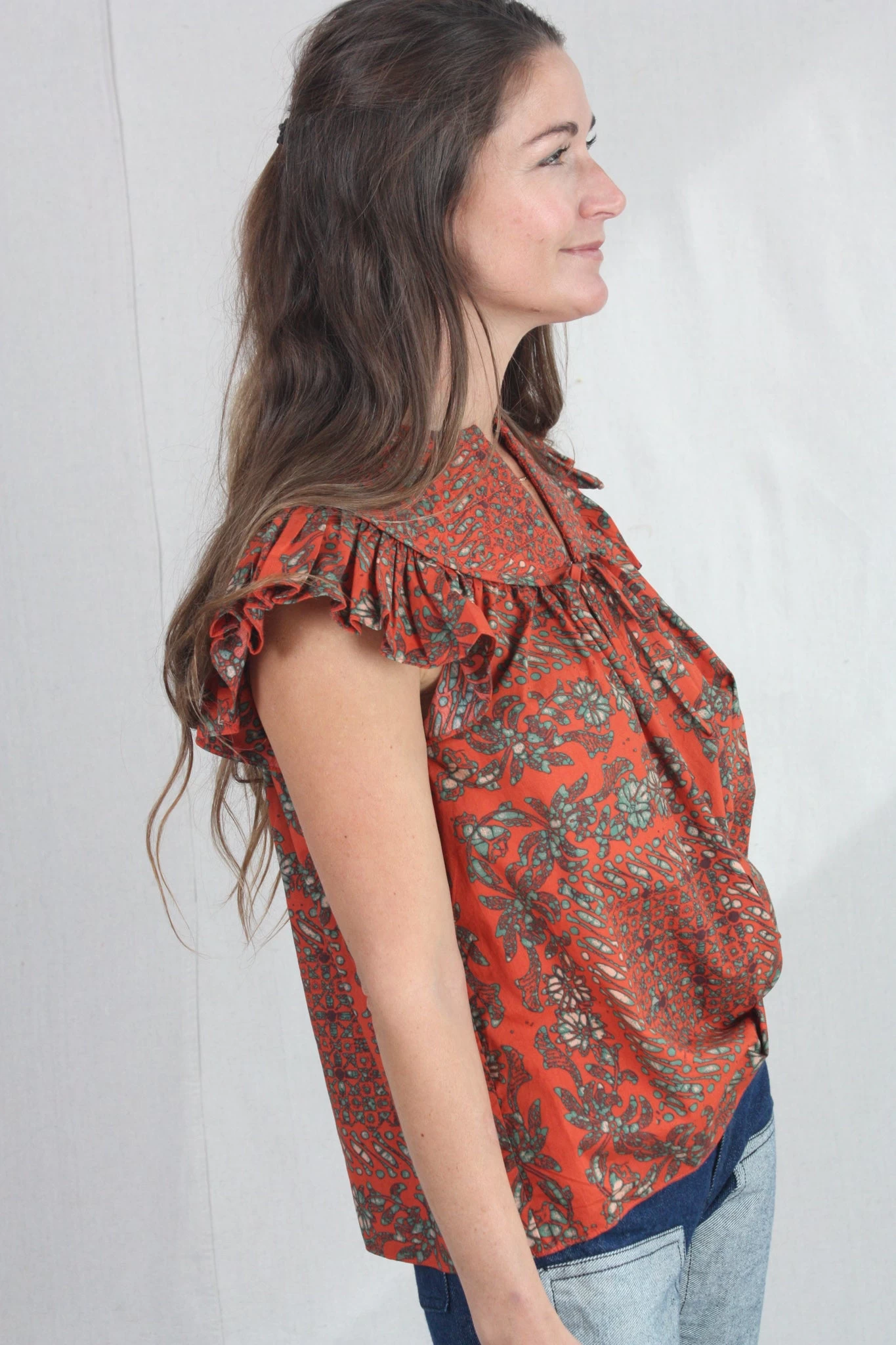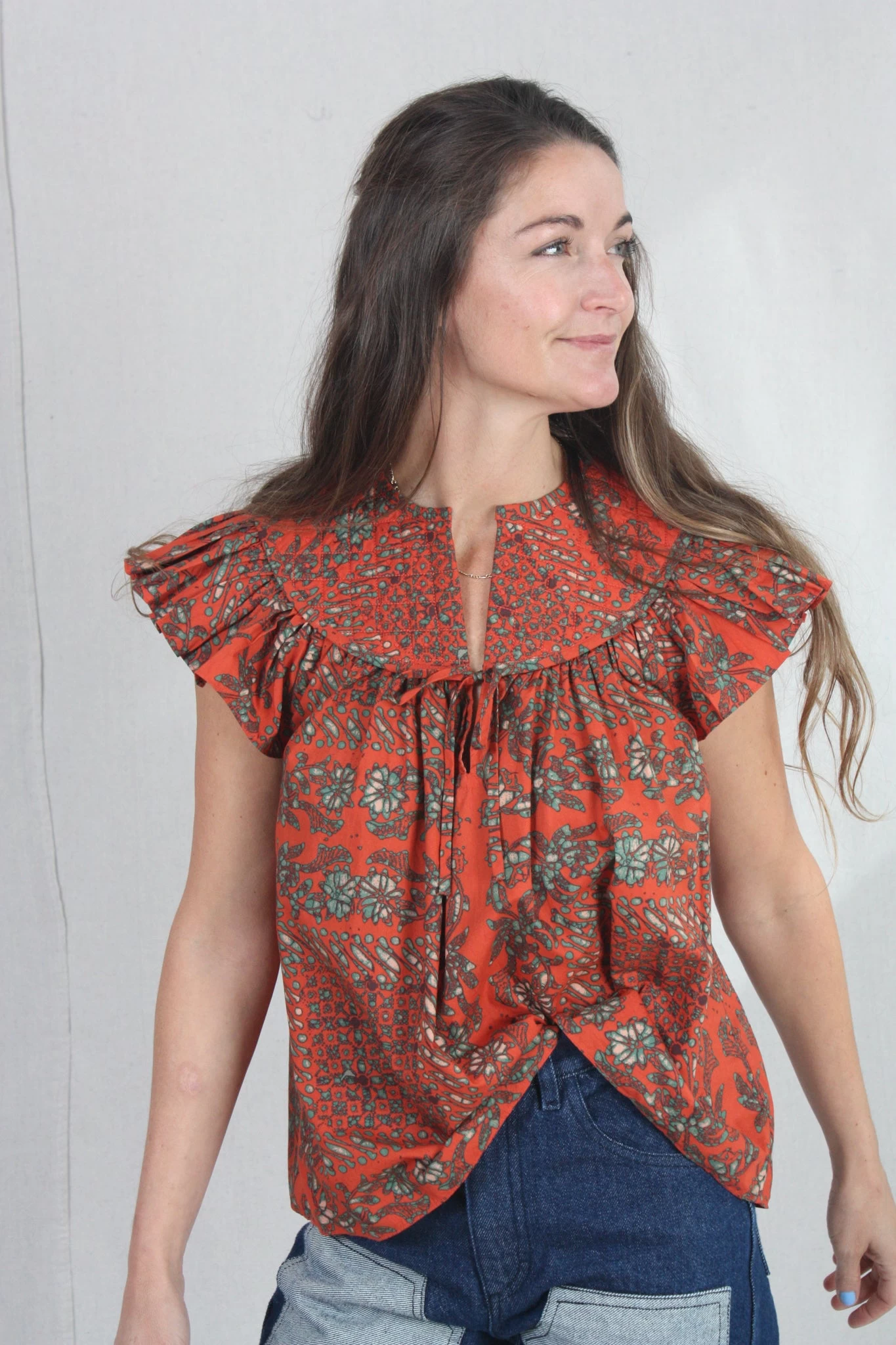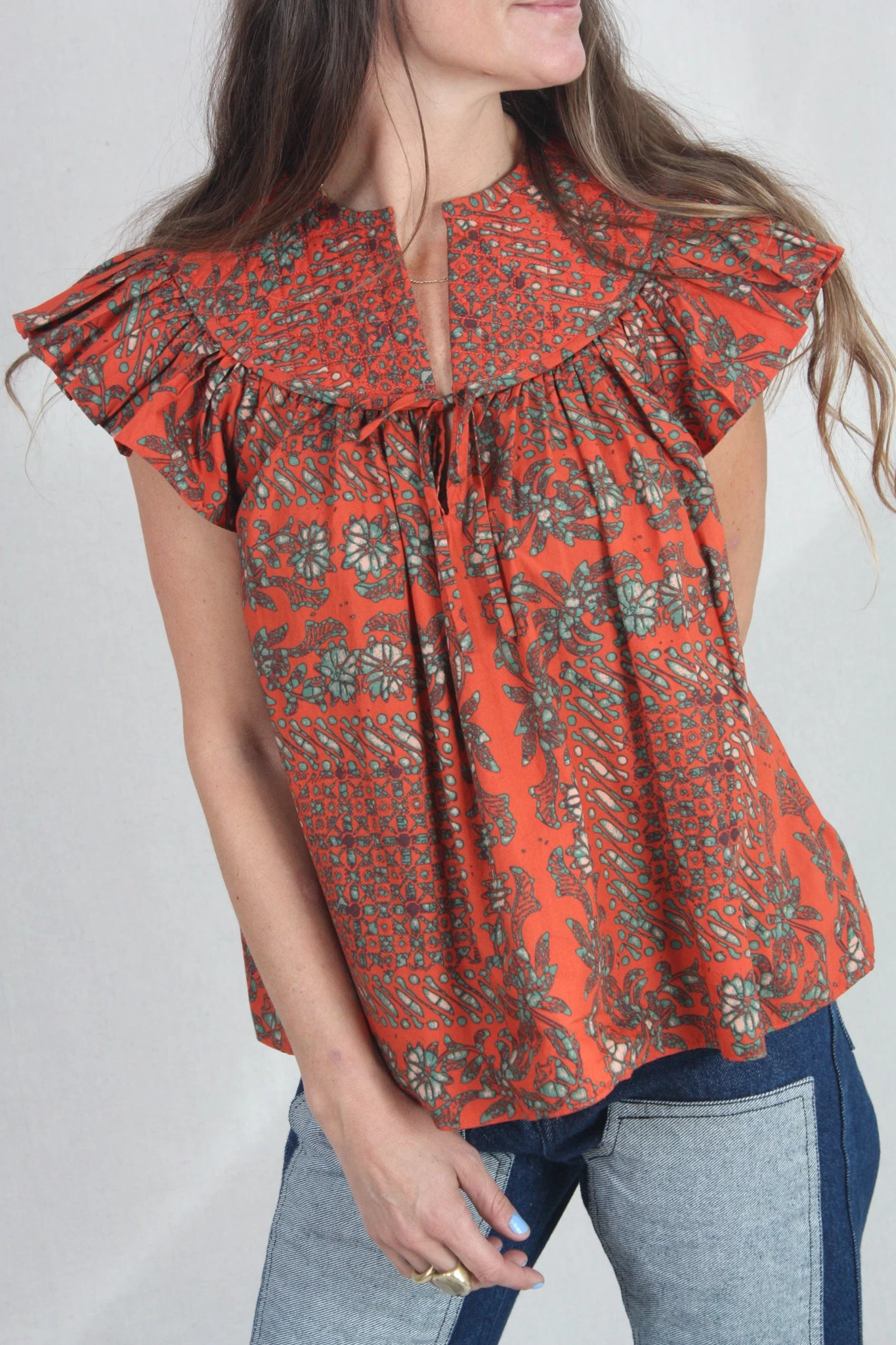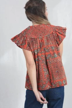 The Kosta Top returns this season in a Clementine bandana print quilted cotton, featuring an airy bodice and flattering flutter sleeves. This warm-weather top has a split neckline and a stitched, rounded yoke.