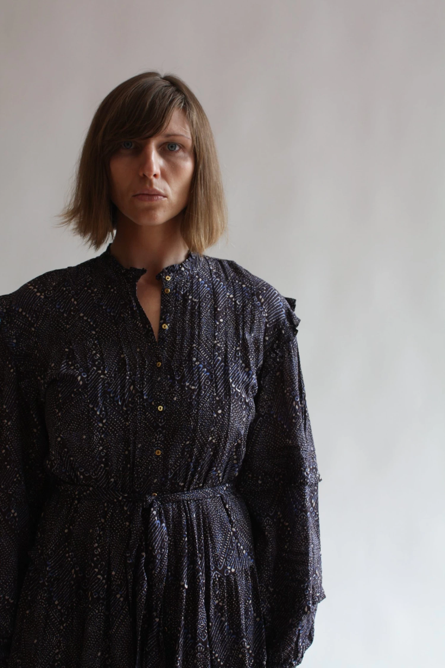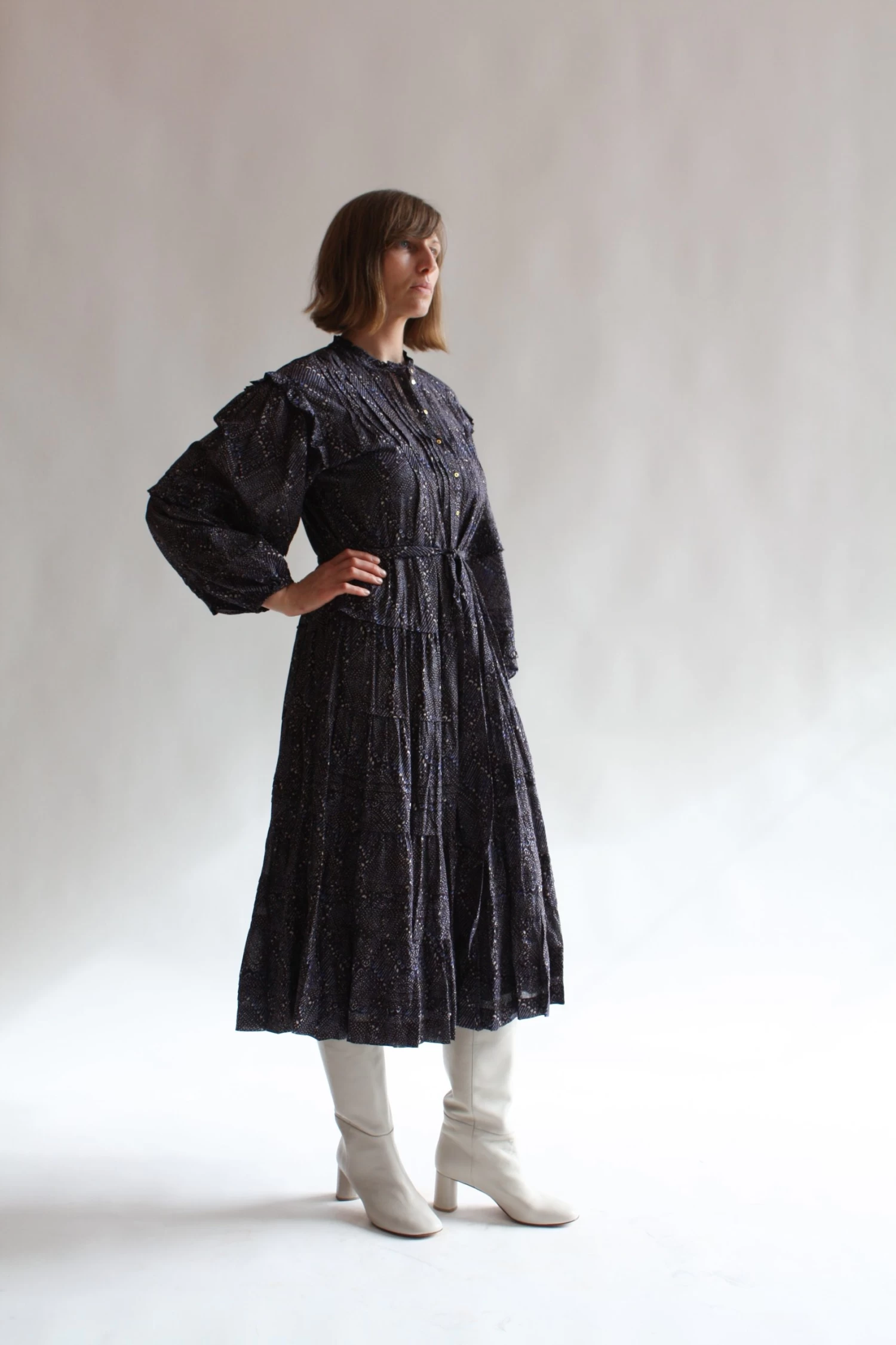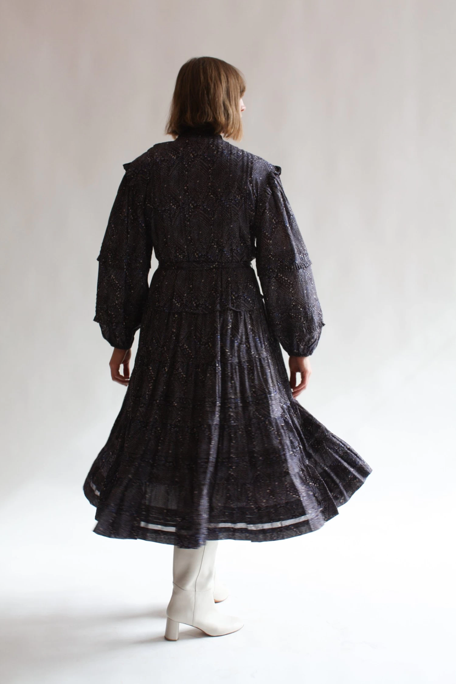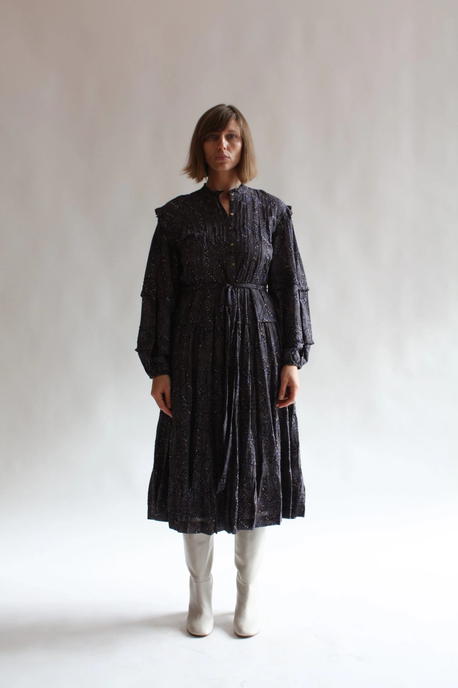 The Layla Dress is crafted from our lightweight easy to wear cotton shirting fabrication that has been dynamically wax resist printed. This midi length lovely features a voluminous skirt, center front button down closure, high neckline, and removable slip.Â